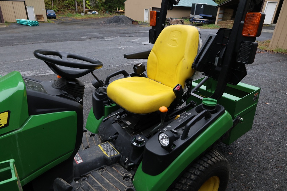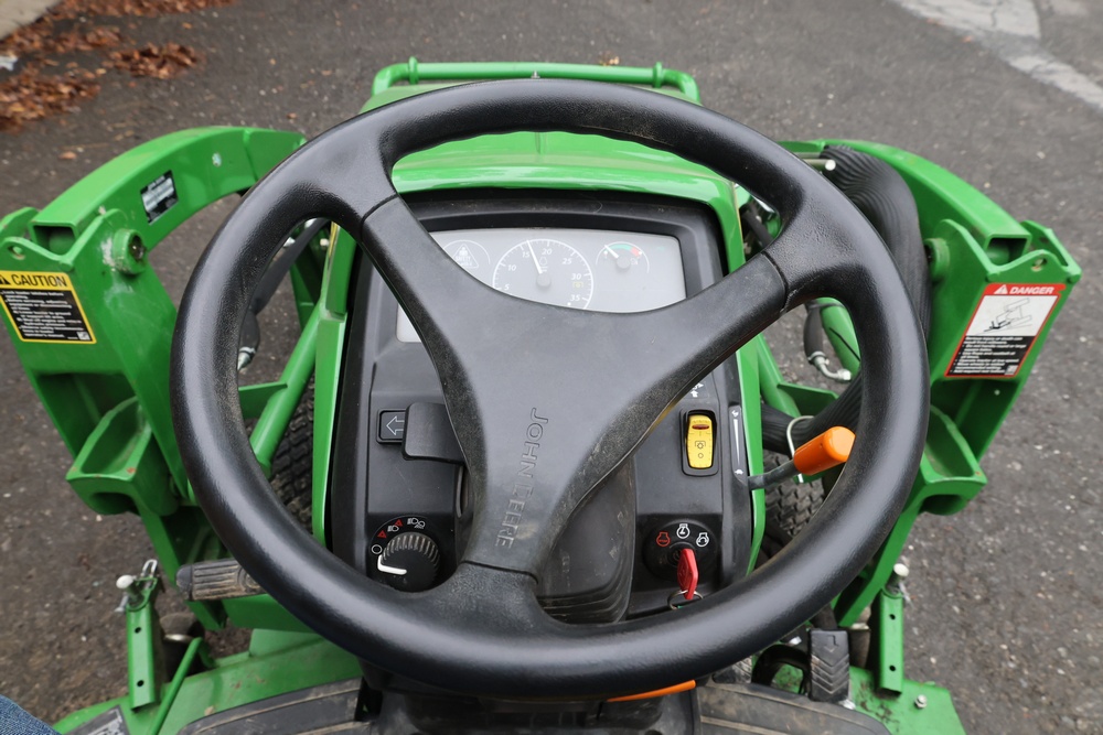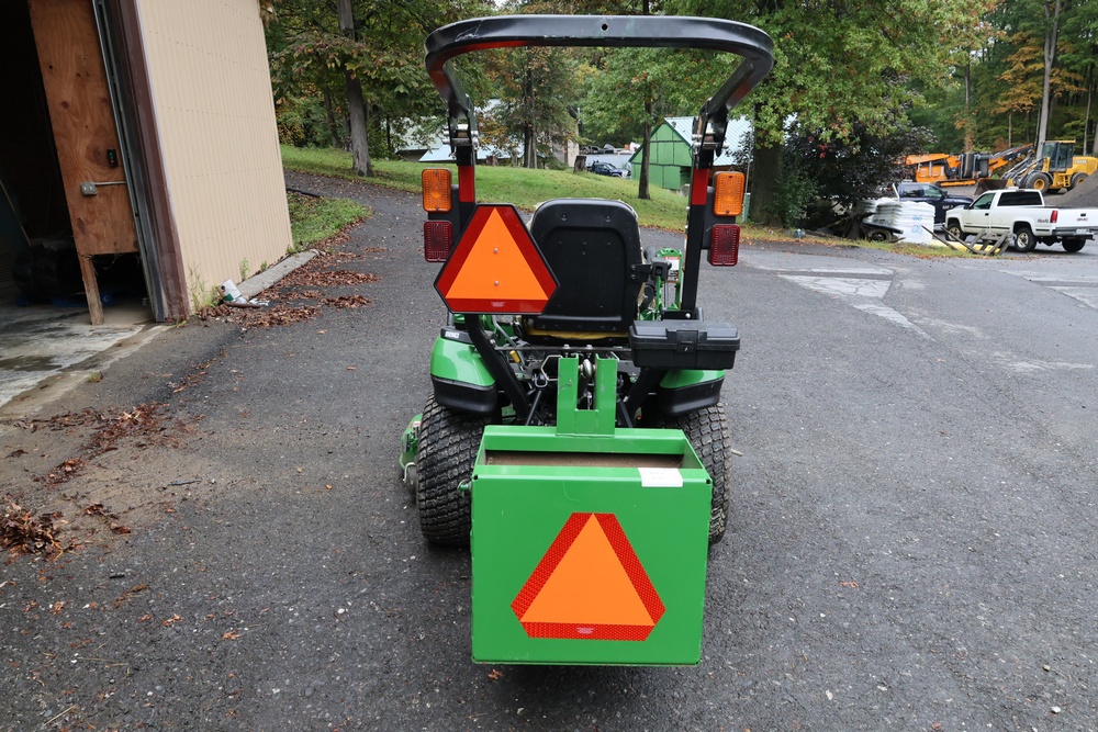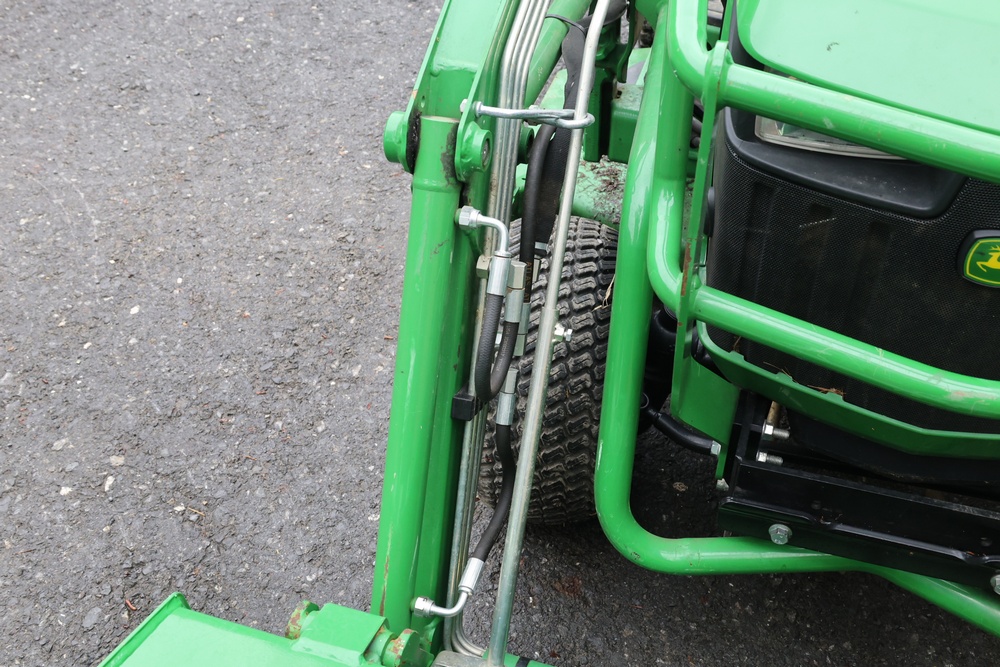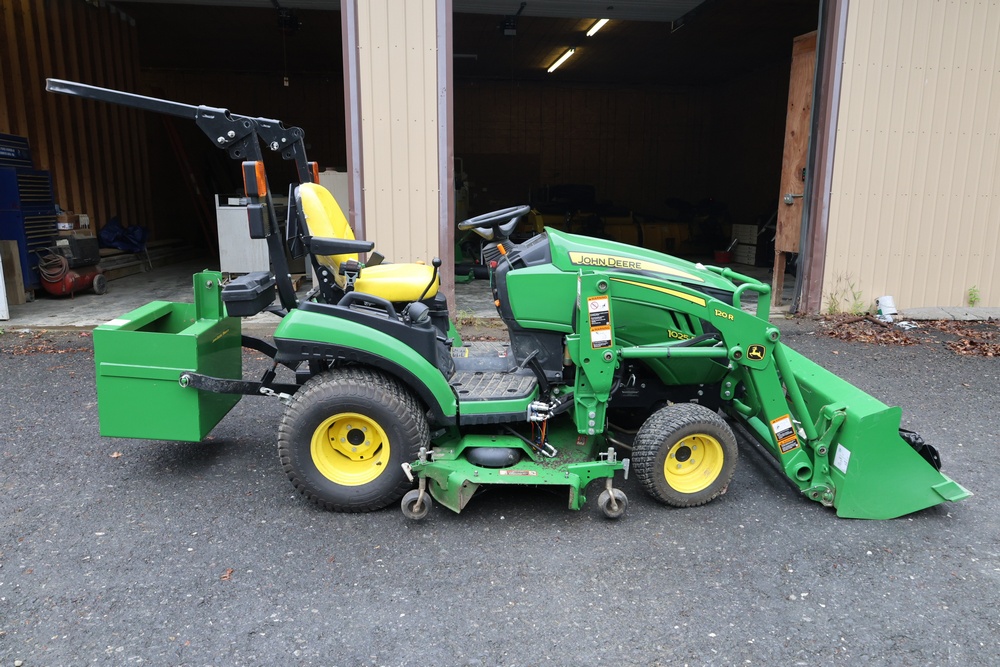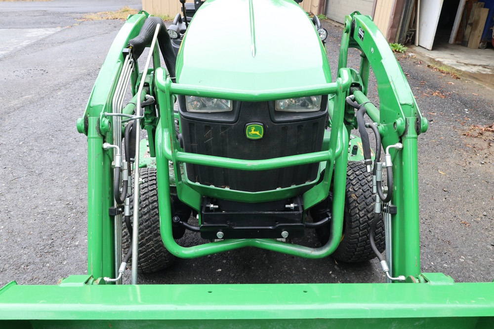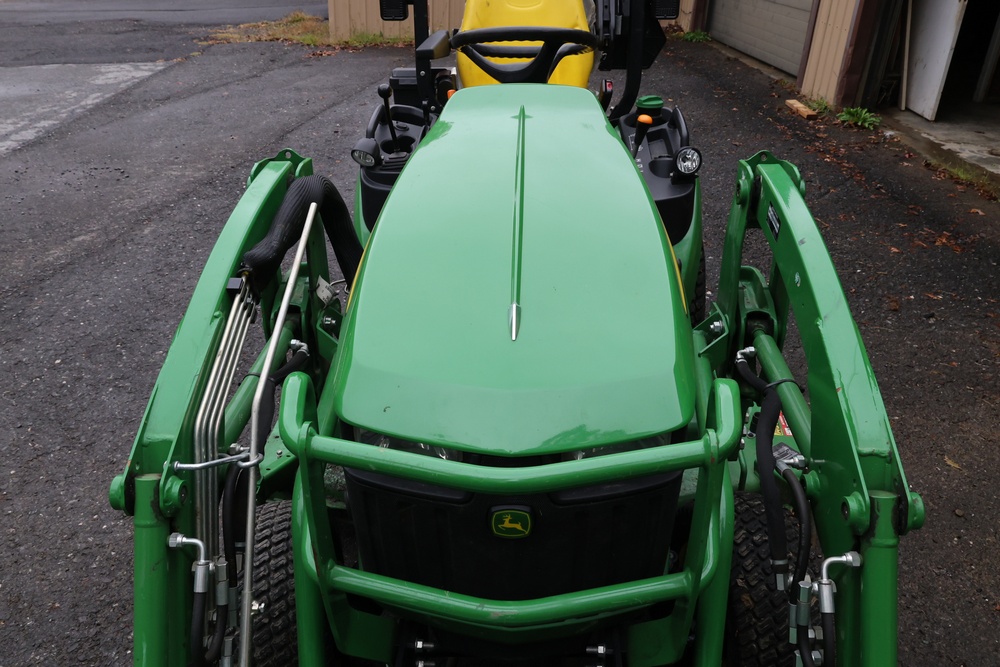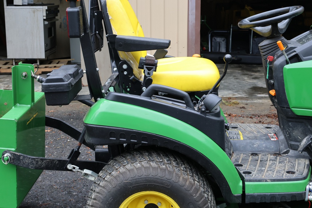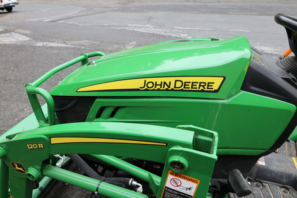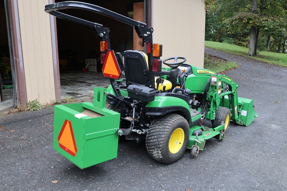 John Deere 1025R Sub-Compact Tractor. VIN: 1LV1025RHJJ153773. Hour meter reading: 145.4 hours (displayed). Equipped with a 120R front-end loader and mid-mount mower deck. The unit includes a rear weight box, new bagging system, quick attach Imatch, 47" snowblower, fork attachment, Frontier RC2048 rotary cutter, and rollover protection system. Exterior: Green and yellow finish with labeled John Deere branding. Assembled in the USA by Deere & Company, Moline, Illinois. Runs and operates as intended.