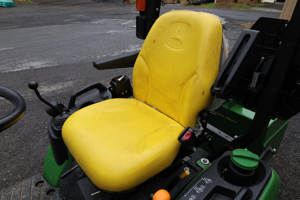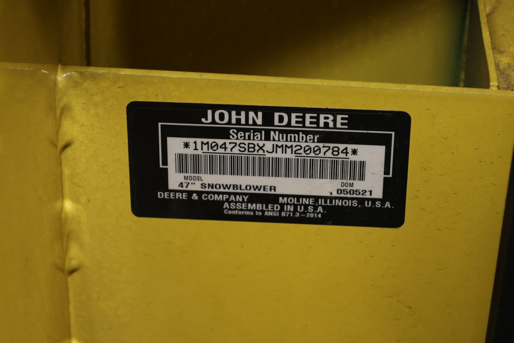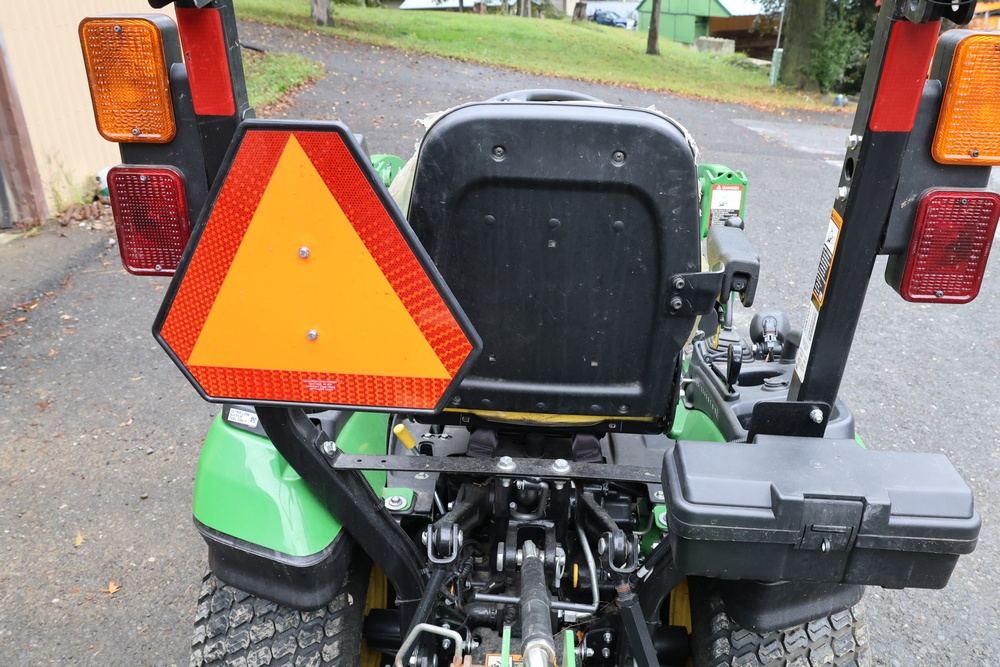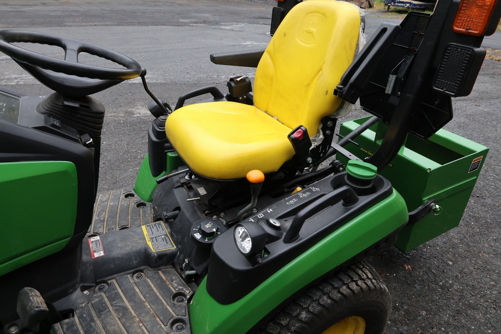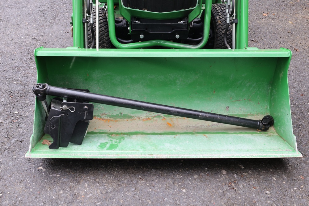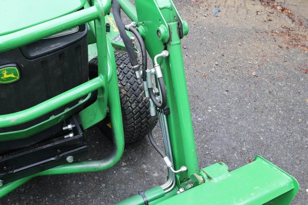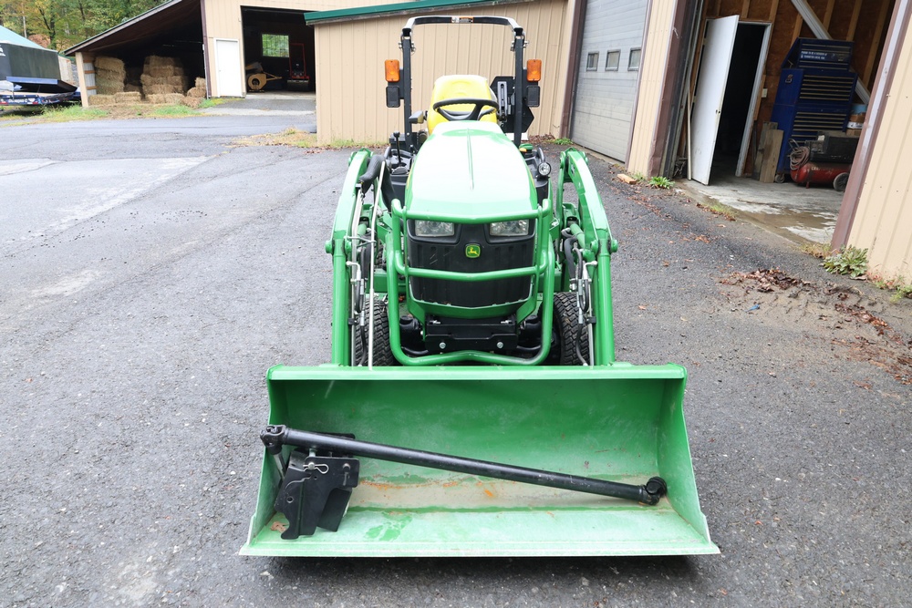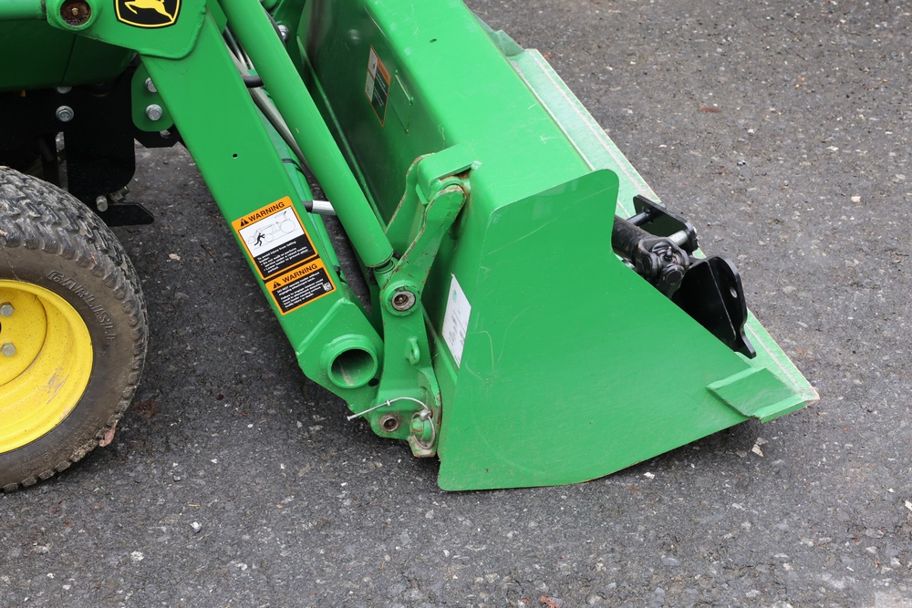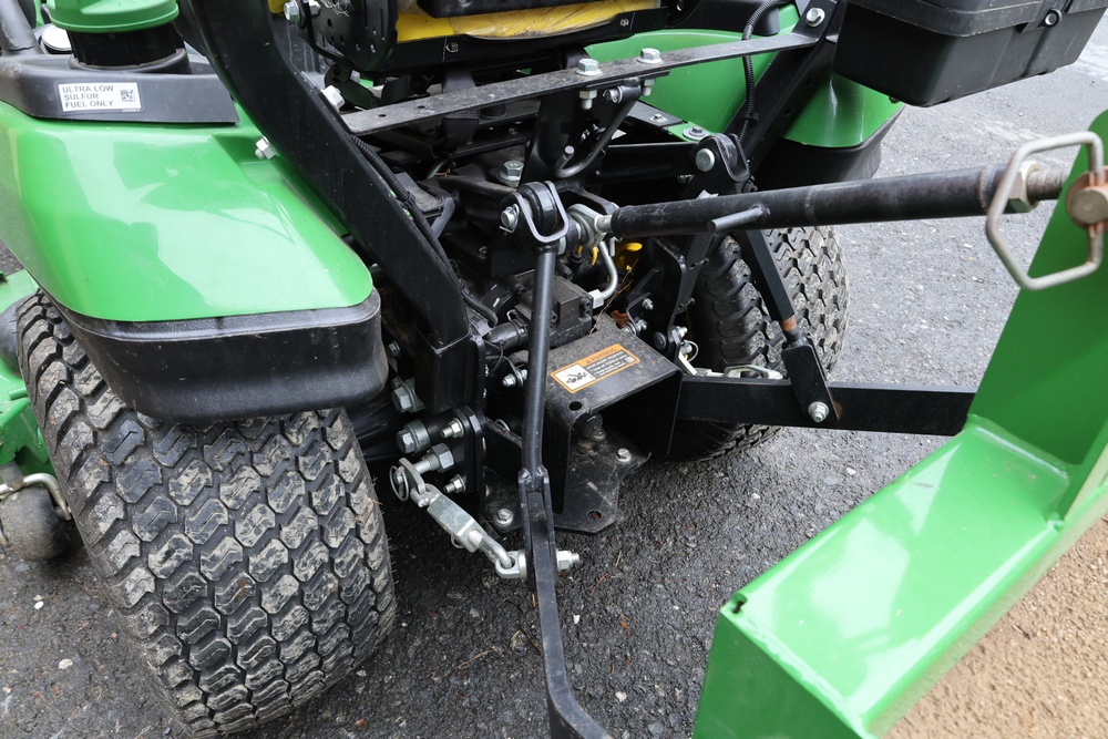 John Deere 1025R Sub-Compact Tractor. VIN: 1LV1025RHJJ153773. Hour meter reading: 145.4 hours (displayed). Equipped with a 120R front-end loader and mid-mount mower deck. The unit includes a rear weight box, new bagging system, quick attach Imatch, 47" snowblower, fork attachment, Frontier RC2048 rotary cutter, and rollover protection system. Exterior: Green and yellow finish with labeled John Deere branding. Assembled in the USA by Deere & Company, Moline, Illinois. Runs and operates as intended.