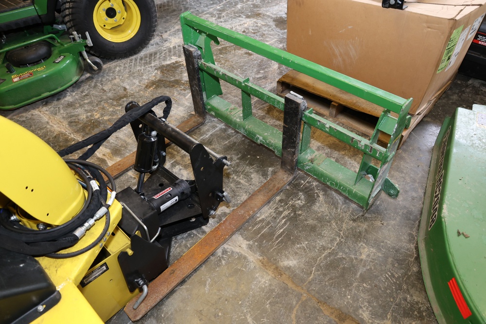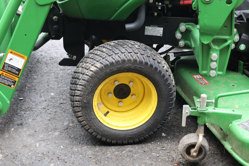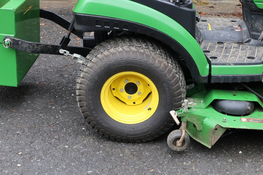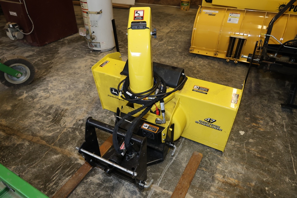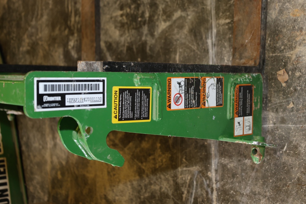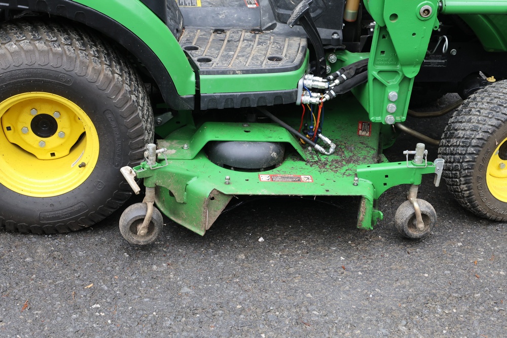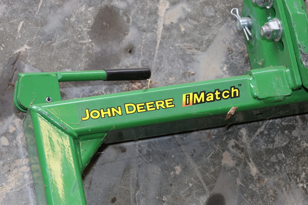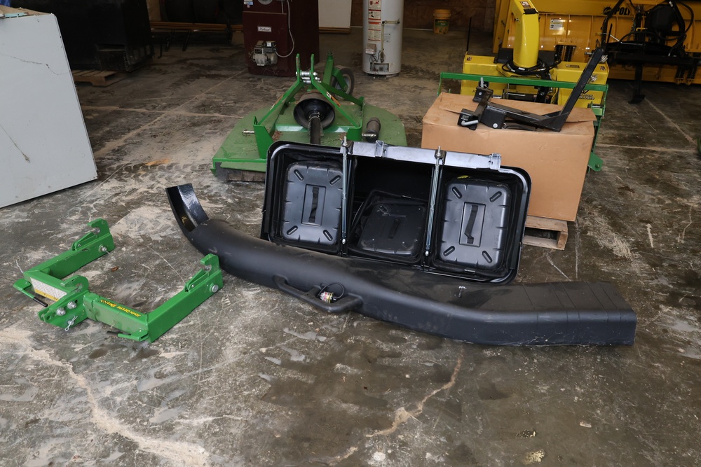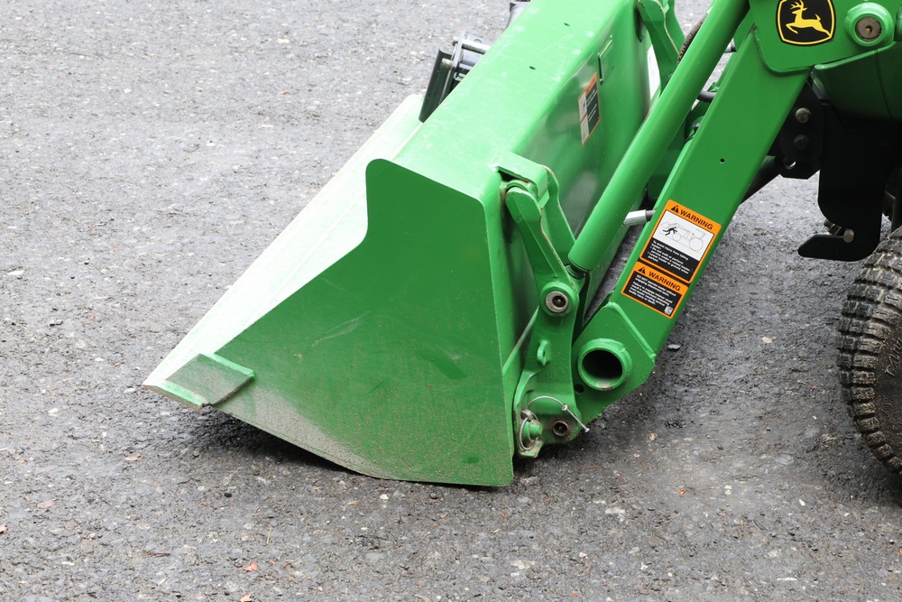 John Deere 1025R Sub-Compact Tractor. VIN: 1LV1025RHJJ153773. Hour meter reading: 145.4 hours (displayed). Equipped with a 120R front-end loader and mid-mount mower deck. The unit includes a rear weight box, new bagging system, quick attach Imatch, 47" snowblower, fork attachment, Frontier RC2048 rotary cutter, and rollover protection system. Exterior: Green and yellow finish with labeled John Deere branding. Assembled in the USA by Deere & Company, Moline, Illinois. Runs and operates as intended.