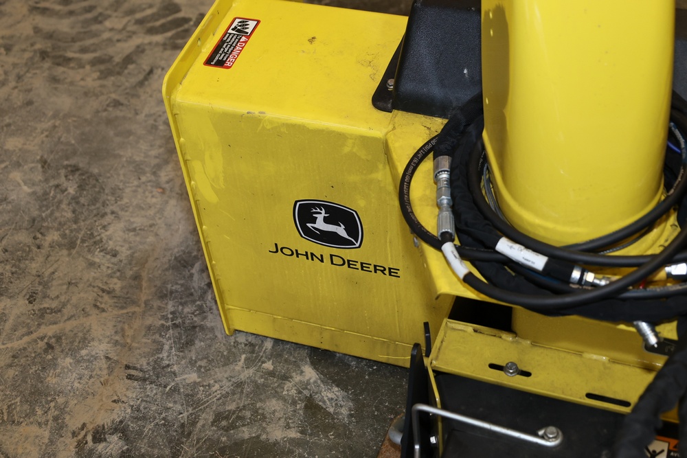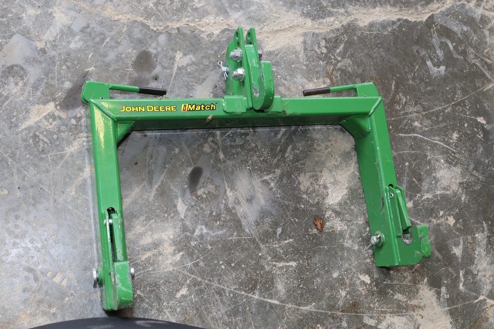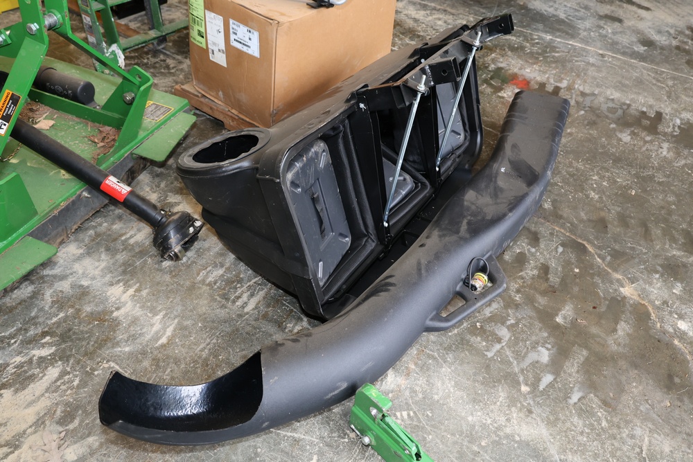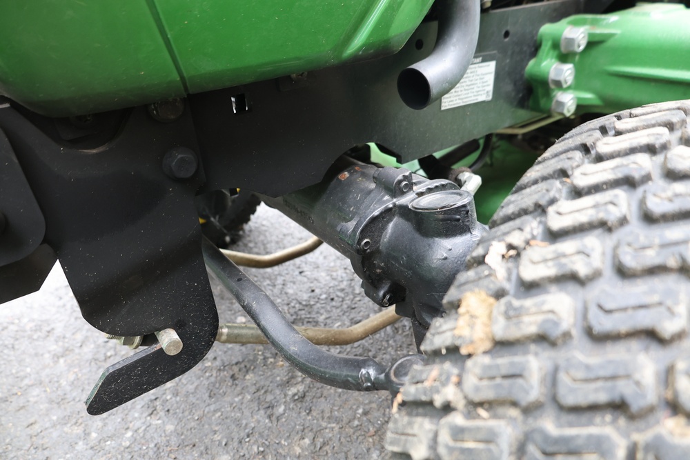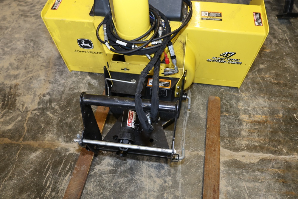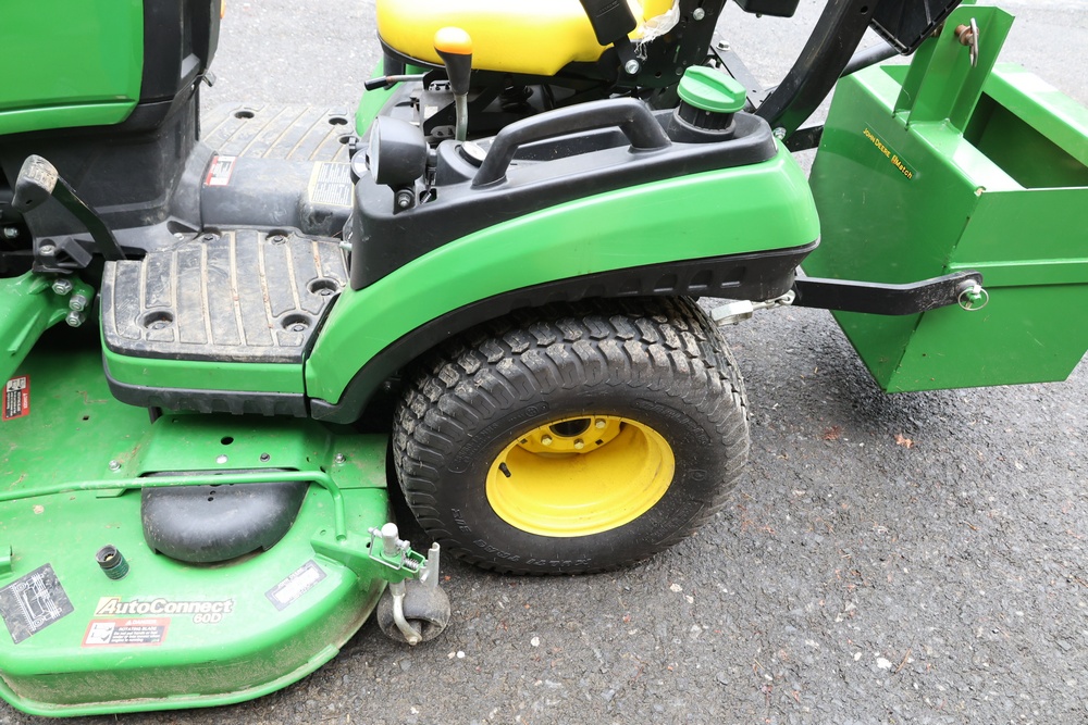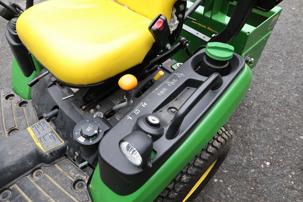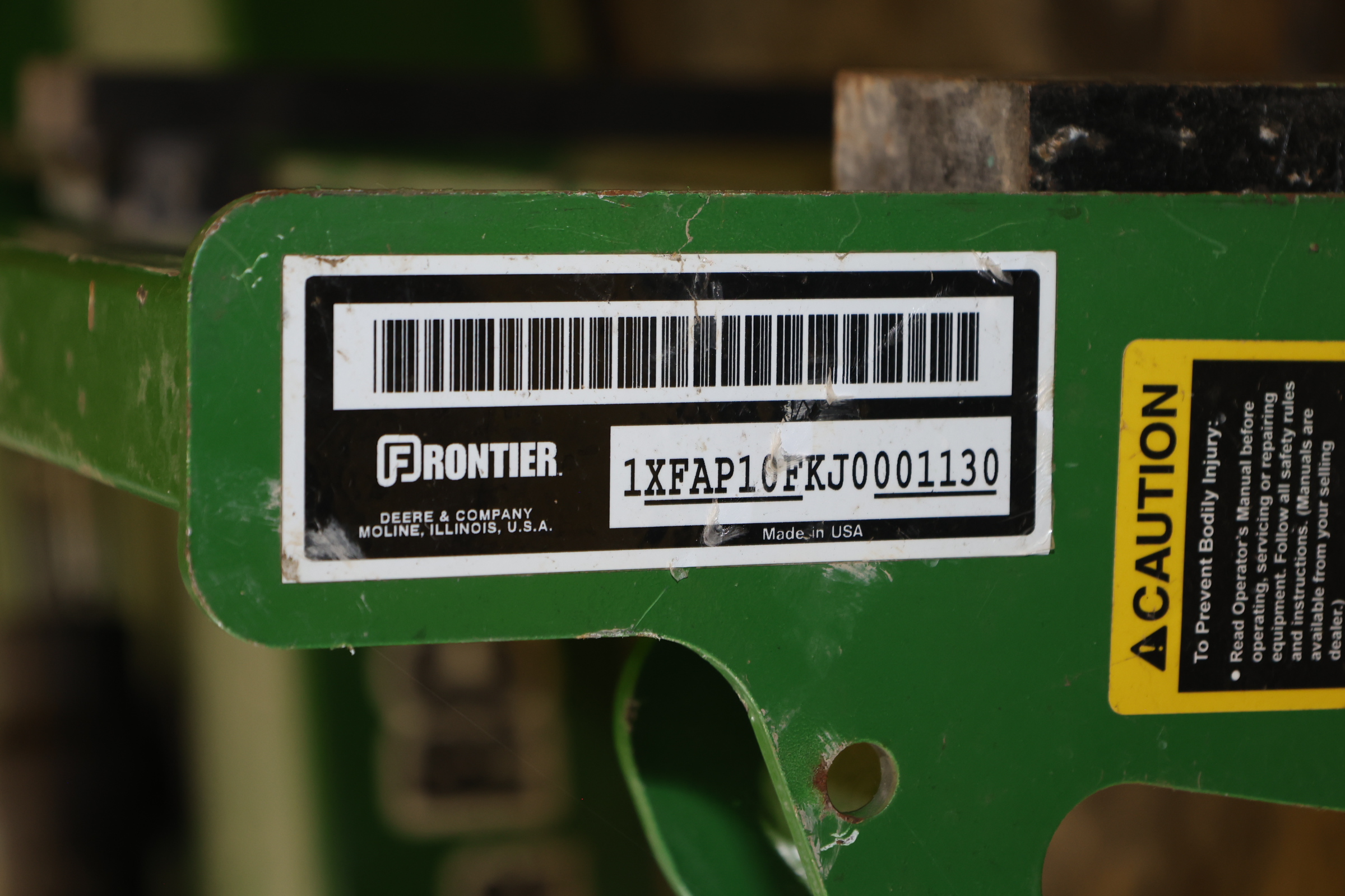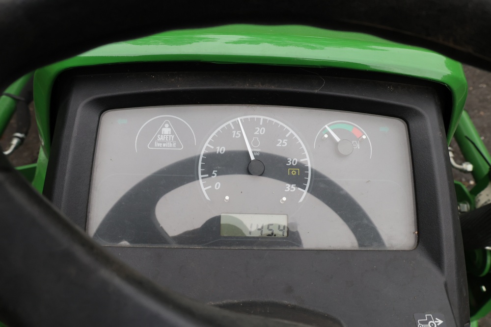 John Deere 1025R Sub-Compact Tractor. VIN: 1LV1025RHJJ153773. Hour meter reading: 145.4 hours (displayed). Equipped with a 120R front-end loader and mid-mount mower deck. The unit includes a rear weight box, new bagging system, quick attach Imatch, 47" snowblower, fork attachment, Frontier RC2048 rotary cutter, and rollover protection system. Exterior: Green and yellow finish with labeled John Deere branding. Assembled in the USA by Deere & Company, Moline, Illinois. Runs and operates as intended.
