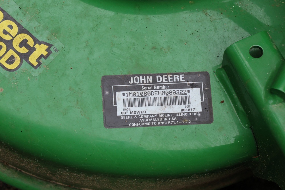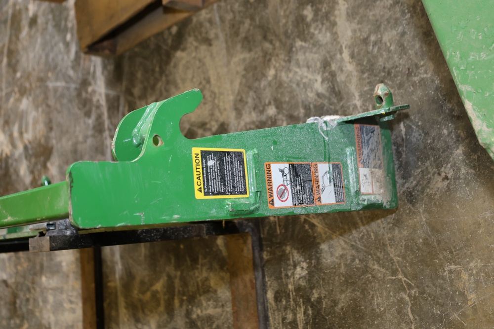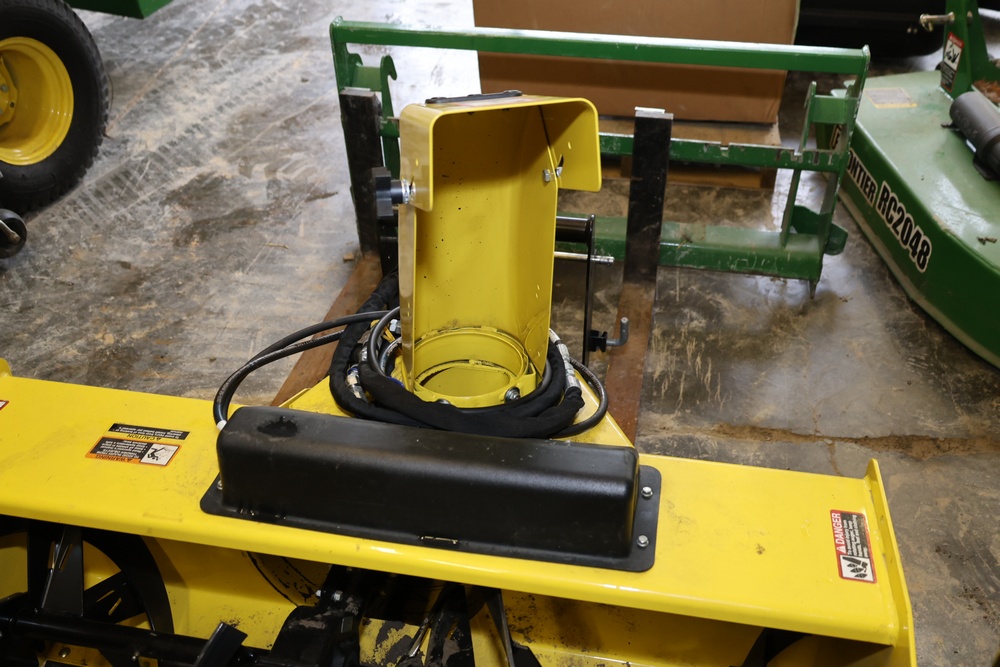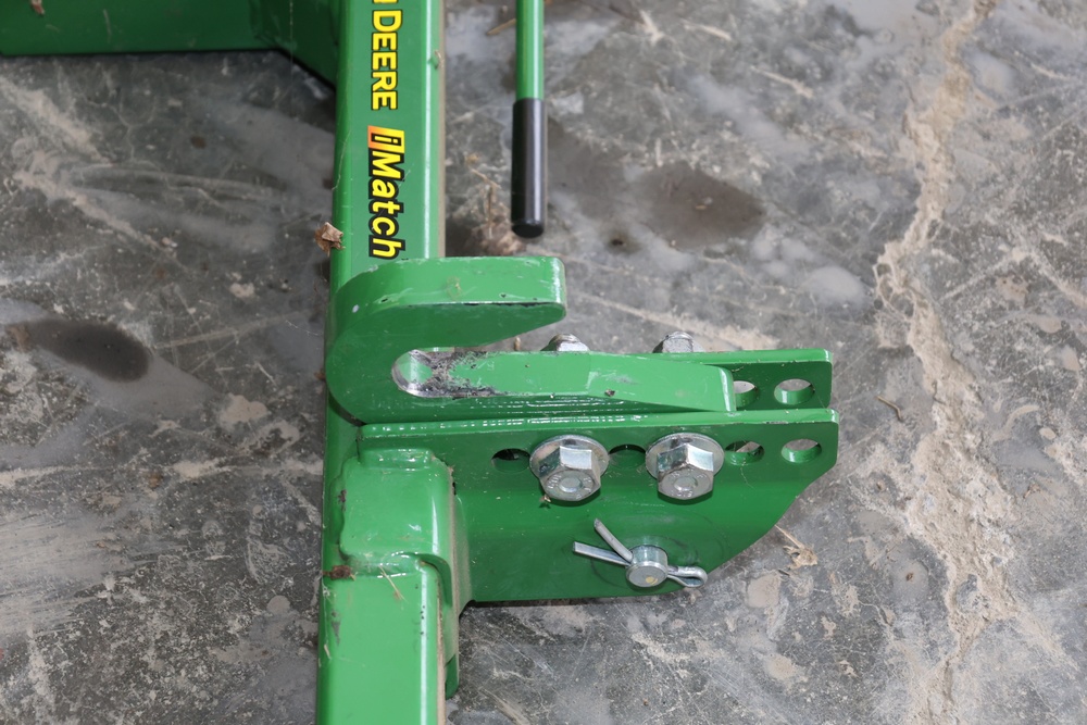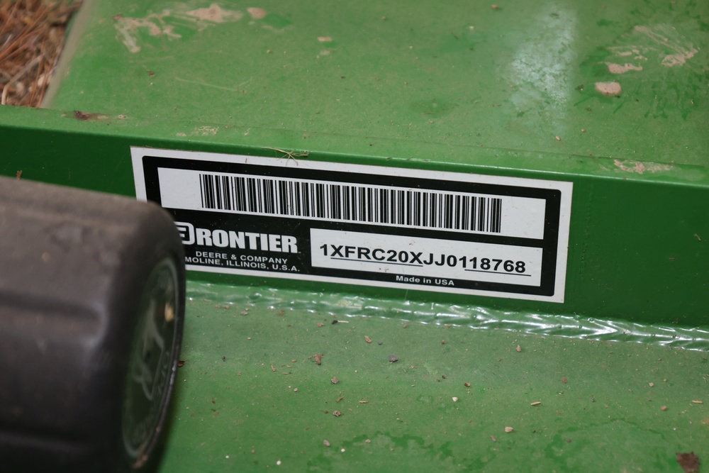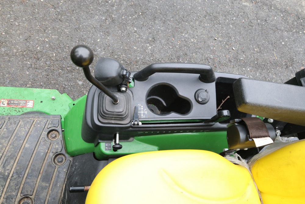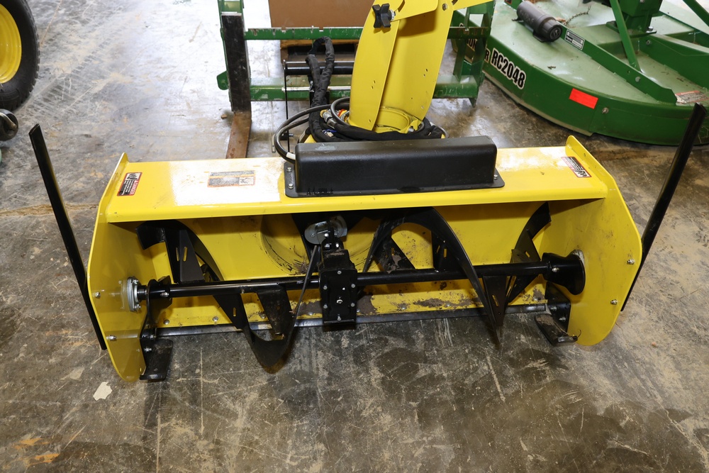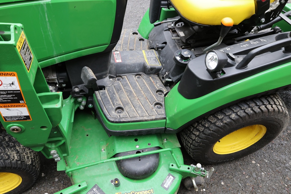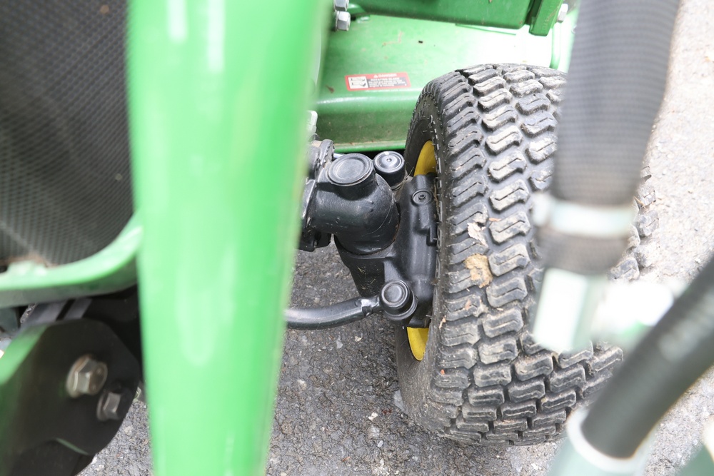 John Deere 1025R Sub-Compact Tractor. VIN: 1LV1025RHJJ153773. Hour meter reading: 145.4 hours (displayed). Equipped with a 120R front-end loader and mid-mount mower deck. The unit includes a rear weight box, new bagging system, quick attach Imatch, 47" snowblower, fork attachment, Frontier RC2048 rotary cutter, and rollover protection system. Exterior: Green and yellow finish with labeled John Deere branding. Assembled in the USA by Deere & Company, Moline, Illinois. Runs and operates as intended.