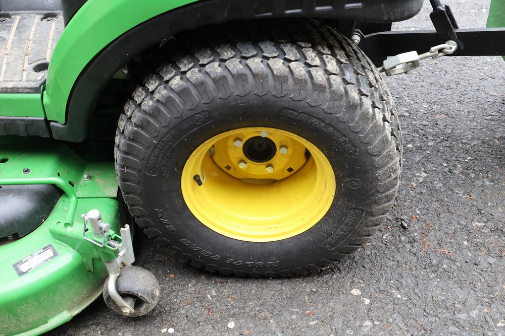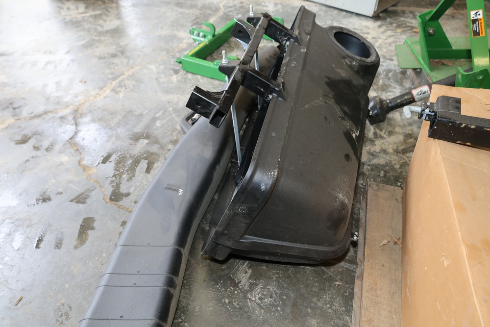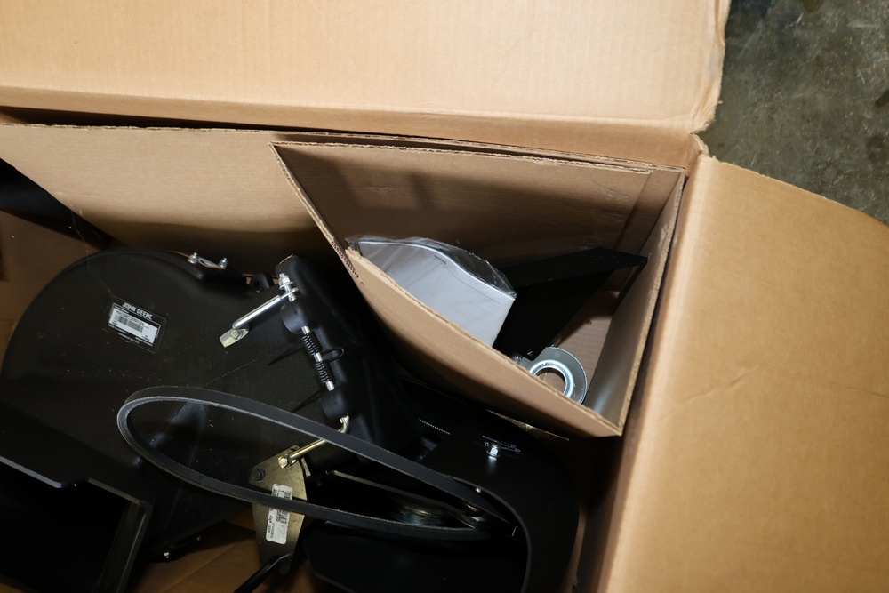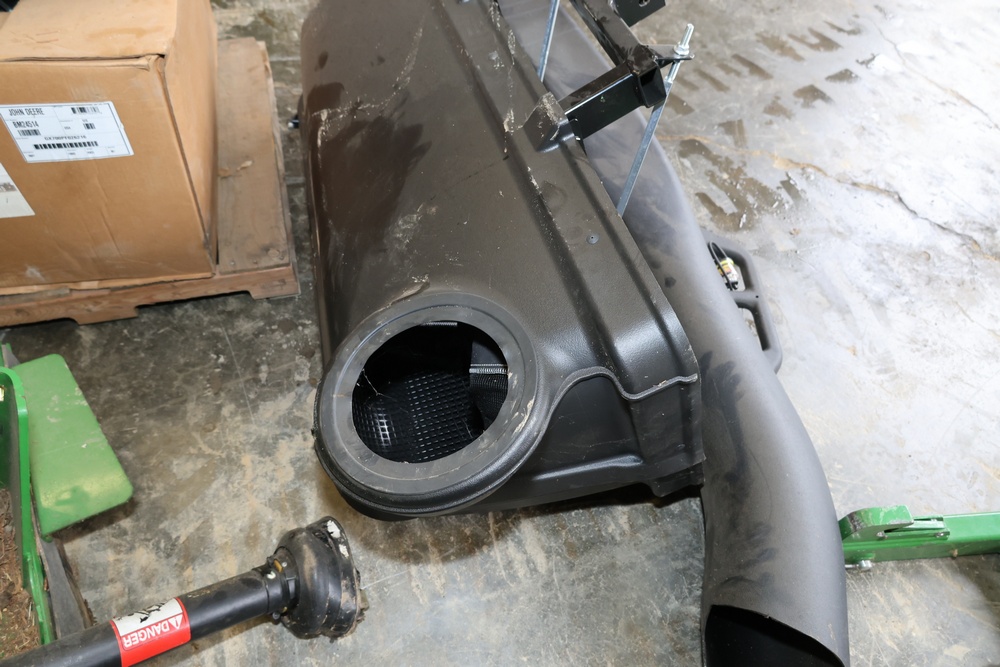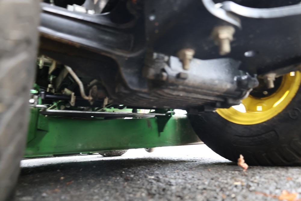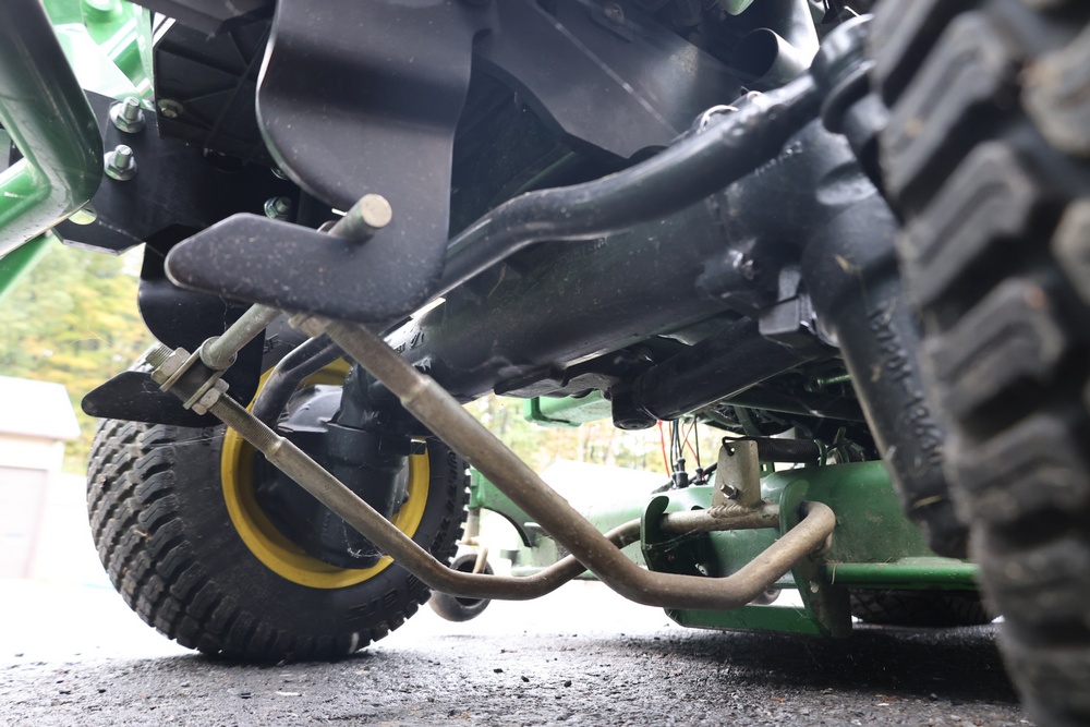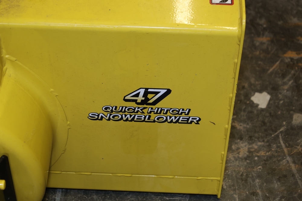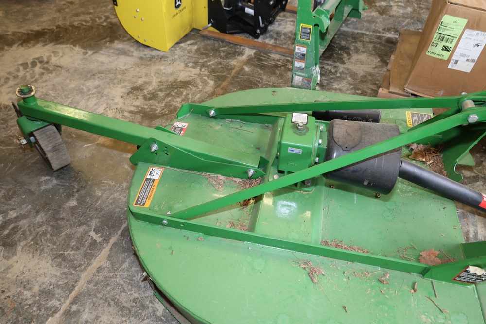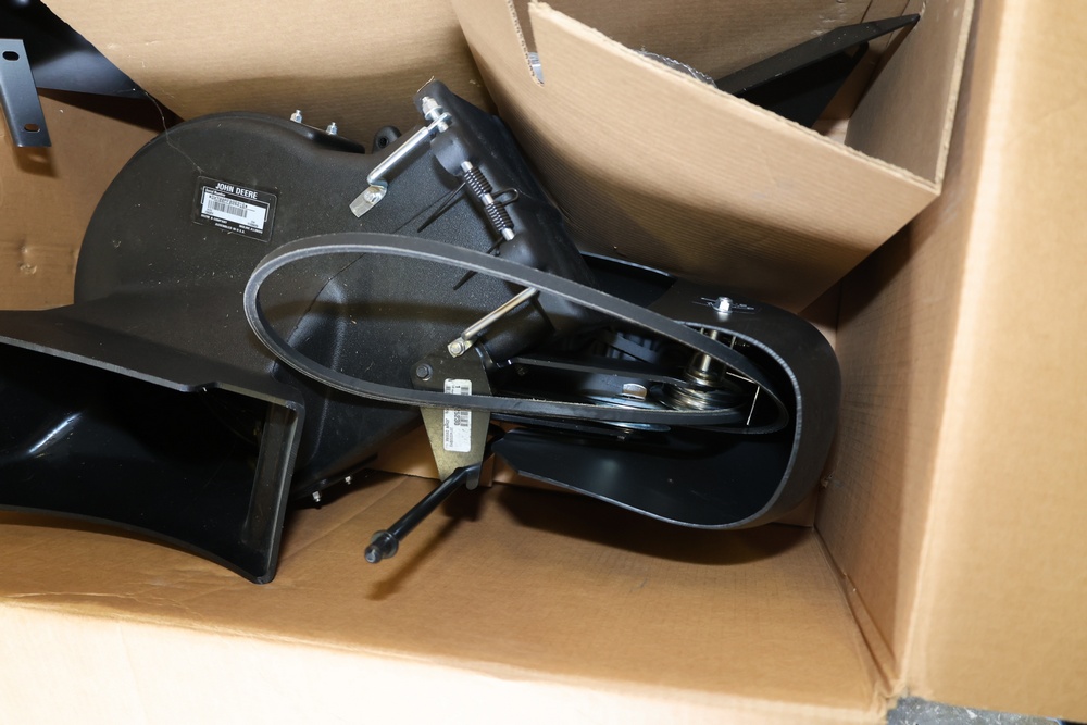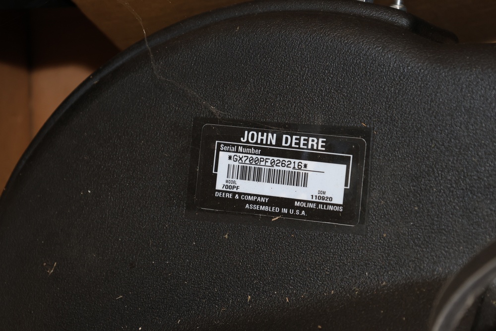 John Deere 1025R Sub-Compact Tractor. VIN: 1LV1025RHJJ153773. Hour meter reading: 145.4 hours (displayed). Equipped with a 120R front-end loader and mid-mount mower deck. The unit includes a rear weight box, new bagging system, quick attach Imatch, 47" snowblower, fork attachment, Frontier RC2048 rotary cutter, and rollover protection system. Exterior: Green and yellow finish with labeled John Deere branding. Assembled in the USA by Deere & Company, Moline, Illinois. Runs and operates as intended.