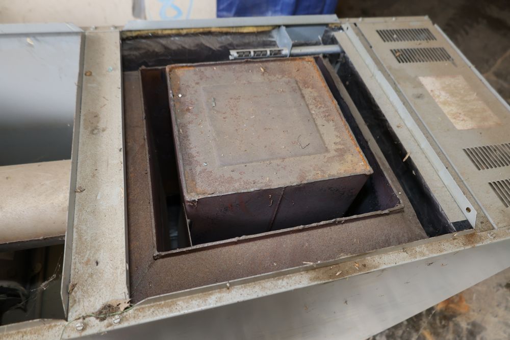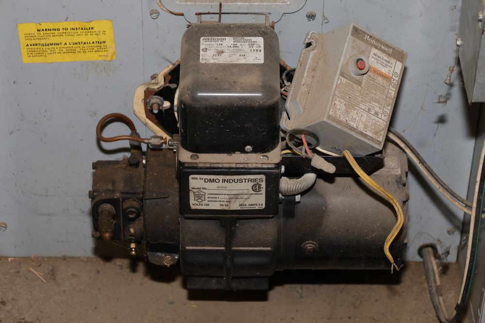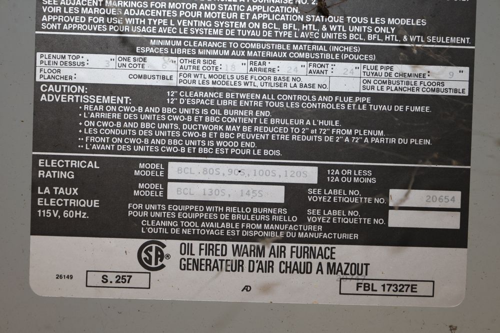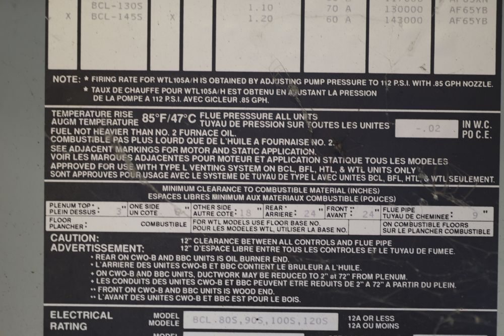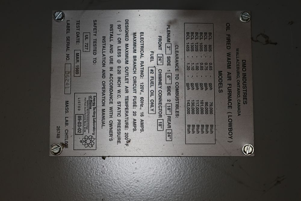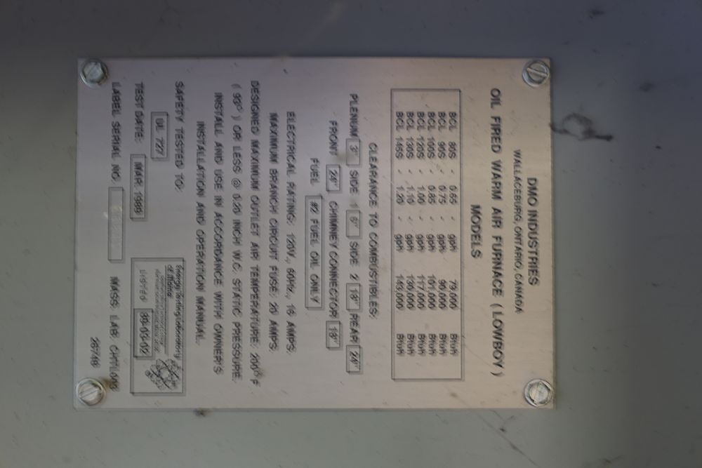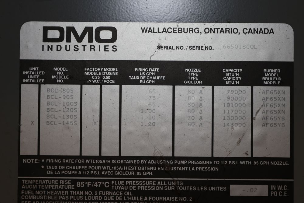 DMO Industries oil fired warm air furnace. Unit includes specifications and information on firing rates, electrical ratings, and safety details as shown on the labels. This furnace is designed to operate on fuel oil with a maximum outlet air temperature of 200F. Seller reports: was operational when removed.