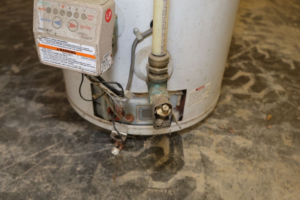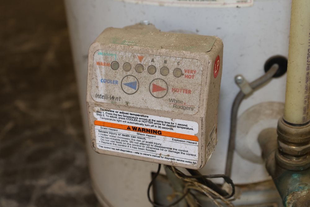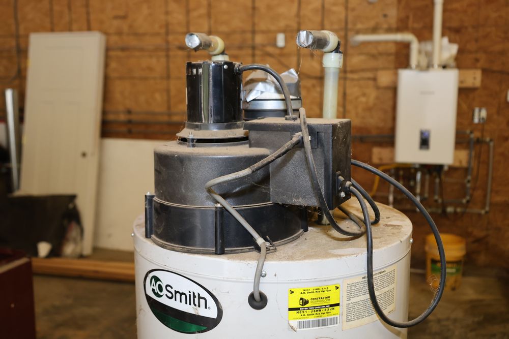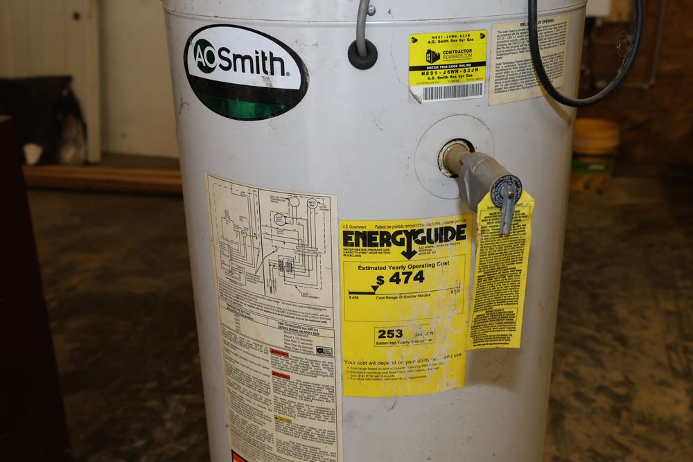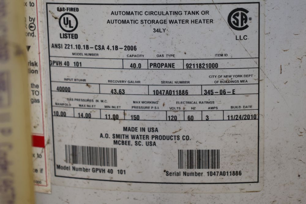 A.O. Smith 40-Gallon Propane Water Heater featuring an automatic circulating tank design. Includes a control panel with temperature adjustment labeled as 'Intelli-Vent'. Model number GPVL 40 101 with a 40,000 BTU input and a recovery efficiency of 85%. Manufactured on 11/24/2010. Seller reports: was operational when removed.