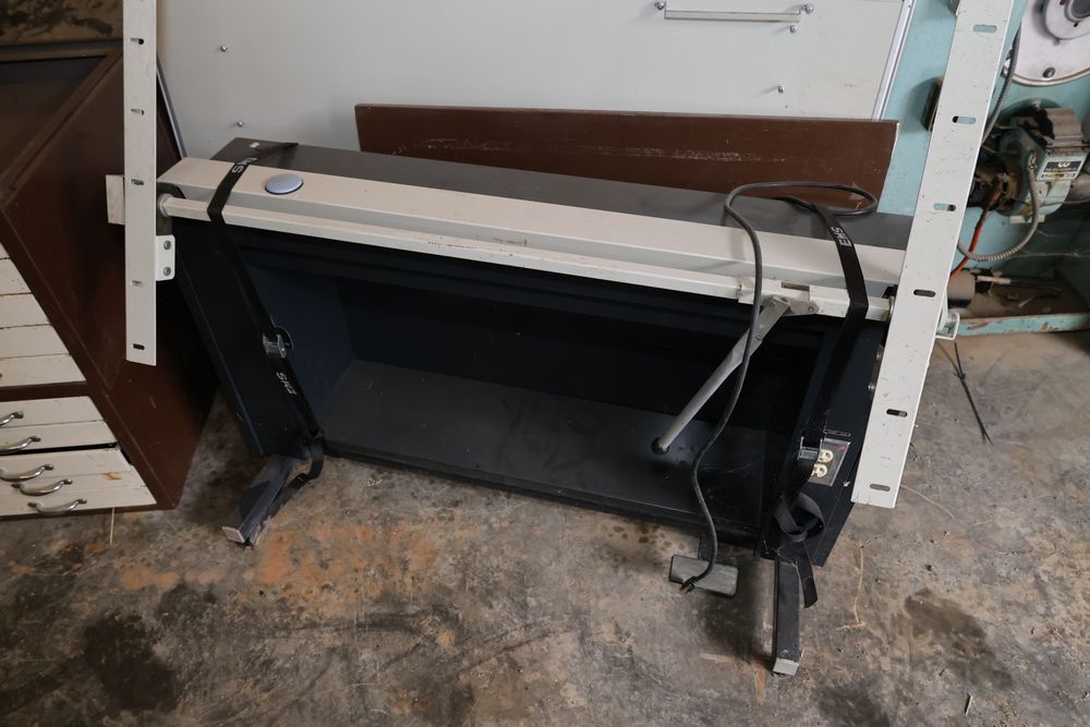 Metal blueprint flat file cabinets with multiple drawers accompanied by a flat drafting table and a wheeled stand. The cabinets feature handles and offer significant storage capacity ideal for large-format documents or artwork.