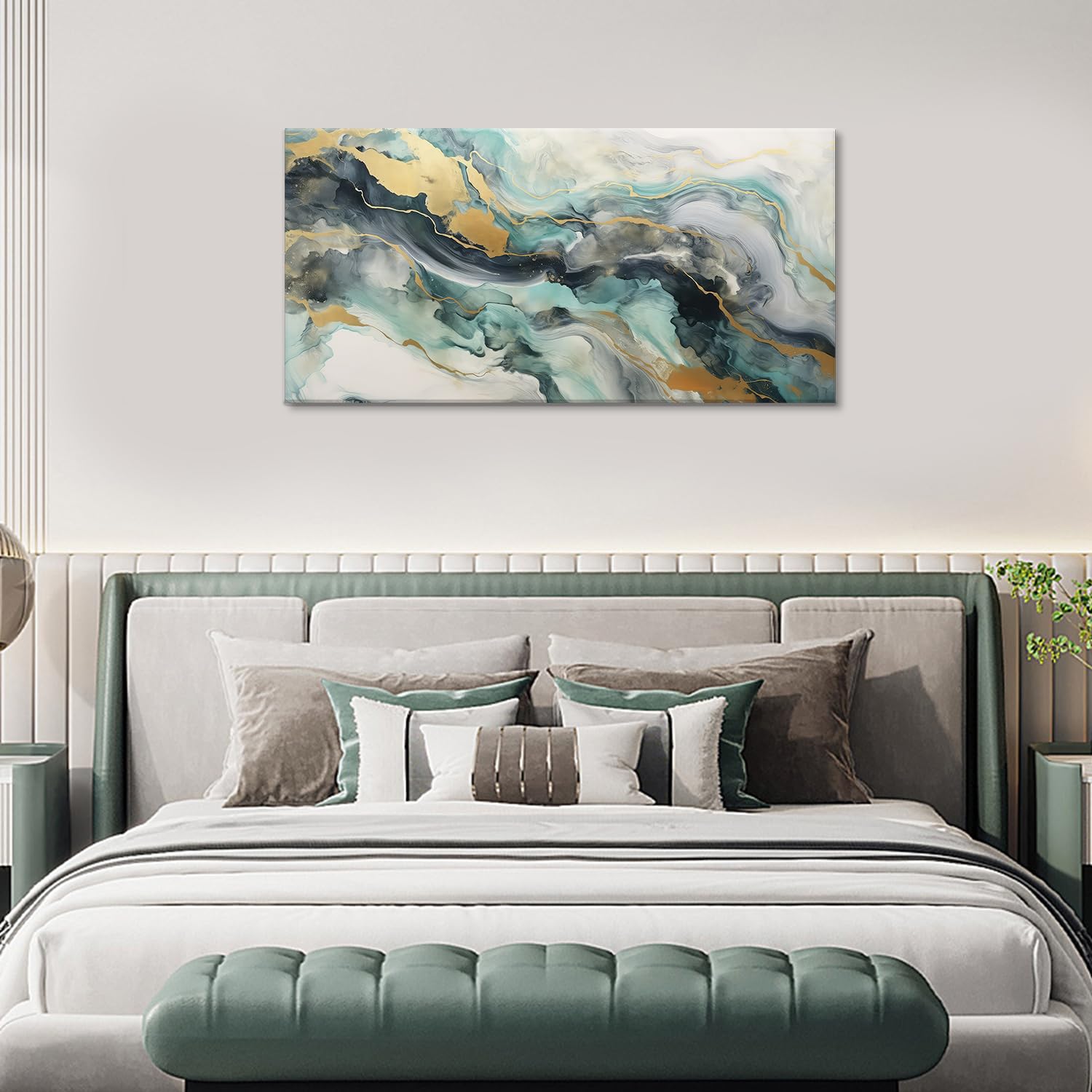 Abstract Emerald Green & Gold Fluid Ink Canvas Painting Glam Wall Art Print Modern Canvas Picture Framed Home Decoration for Living Room