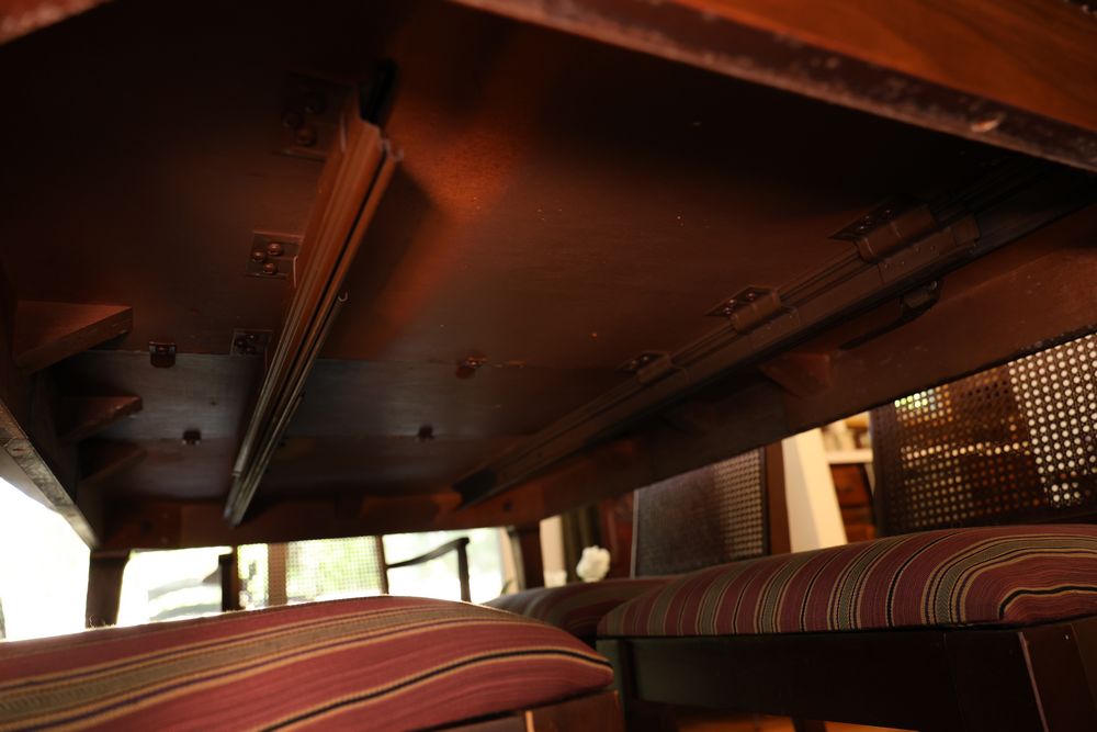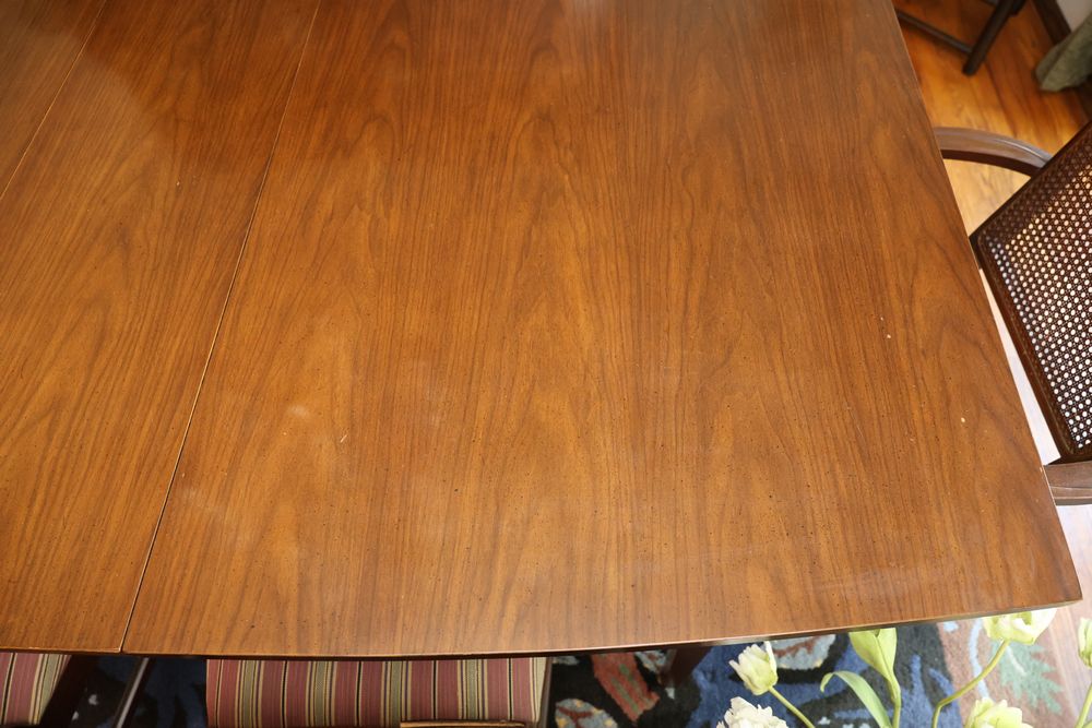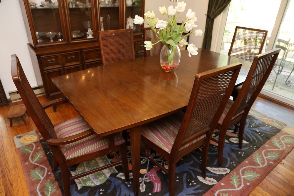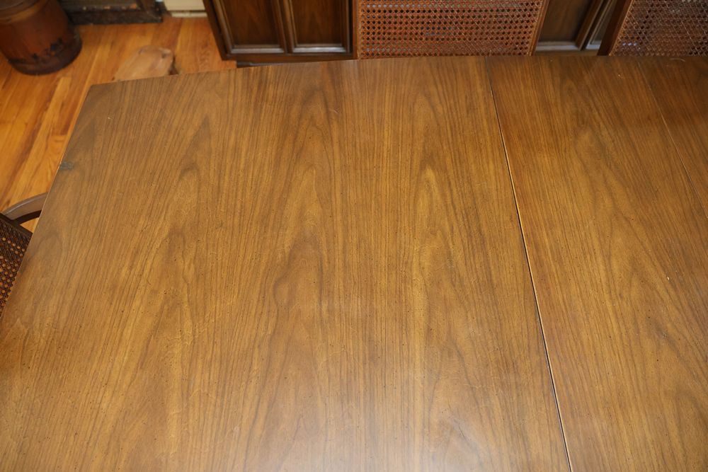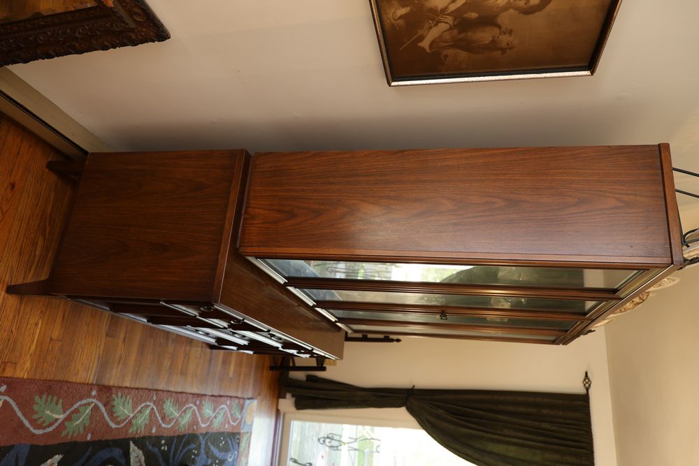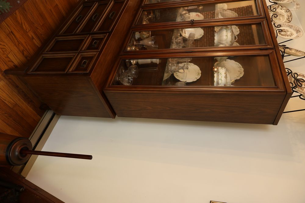 Dining Table With 3 Leafs and Hutch With Glass Shelves and Lighting. The table measures 74.25"W x 40"D x 29"H and includes 3 leafs, each approximately 12". The hutch measures 62"W x 19"D x 77"H and is divided into two pieces. The top piece is 46.5"H, features glass shelves and lighting, and is wooden. Does not include items from other lots. Buyer is responsible for all materials and help necessary for safe and proper removal. Buyer must take all. Pickup only.
