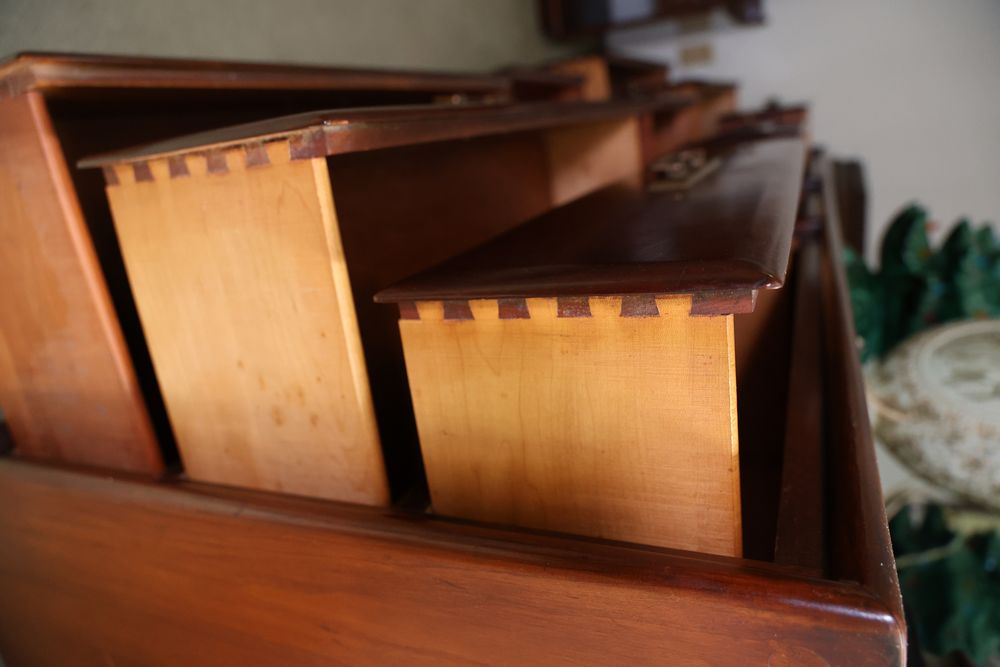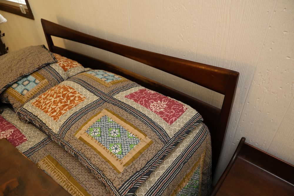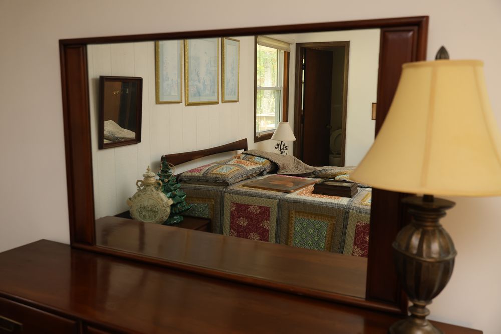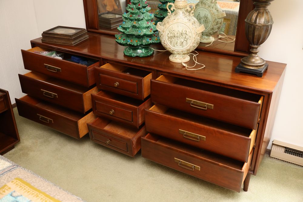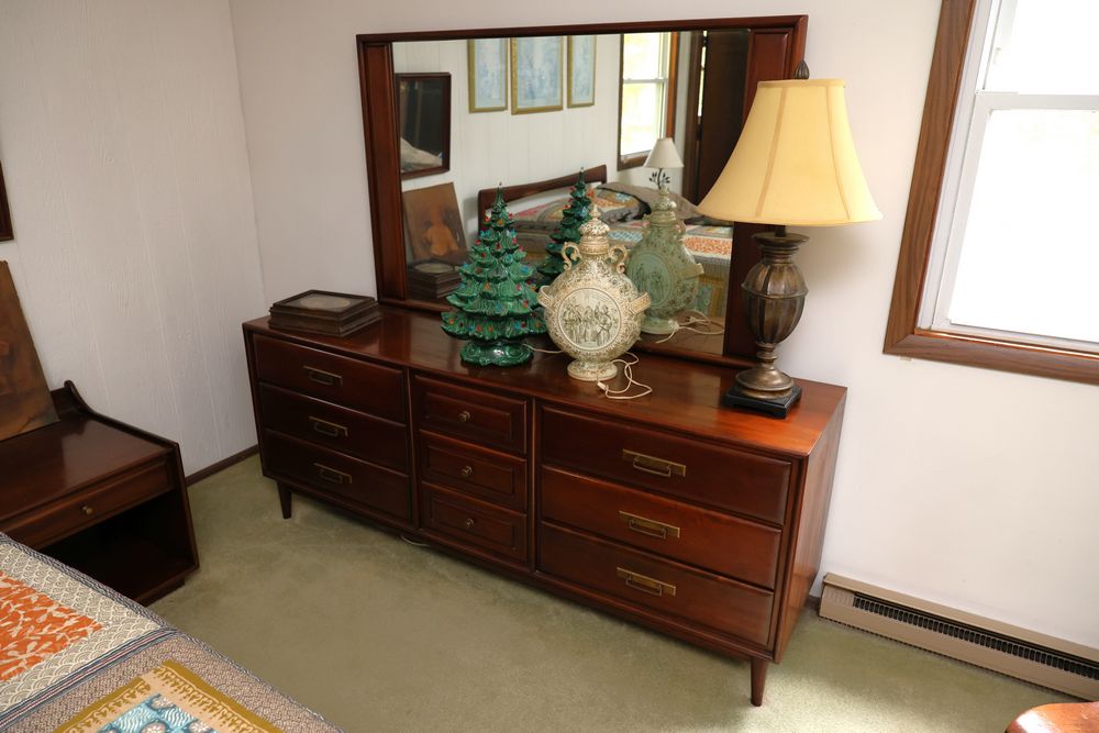 Heywood-Wakefield bedroom set featuring a Mid-Century Modern style. The set includes a 72"W x 18"D x 29.5"H dresser, an additional end table, and a 55.5"W x 36"H headboard. Maker's mark visible in the drawers of the dresser. Features additional bedroom furniture. Excludes wooden trunk and ceramic items on top of dresser. Buyer is responsible for all materials and help necessary for safe and proper removal. Buyer must take all. Pickup only.