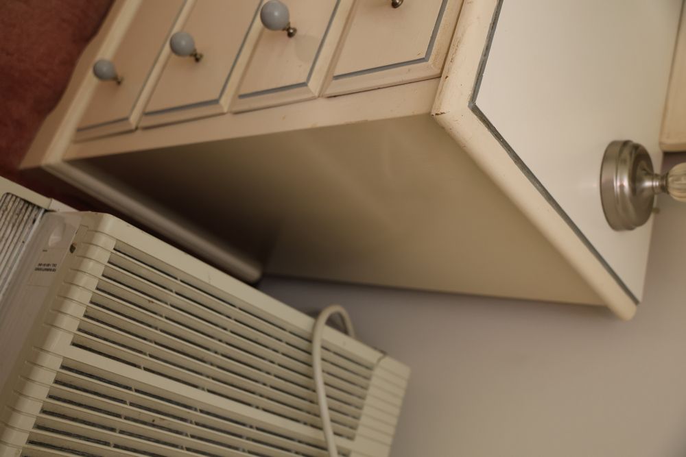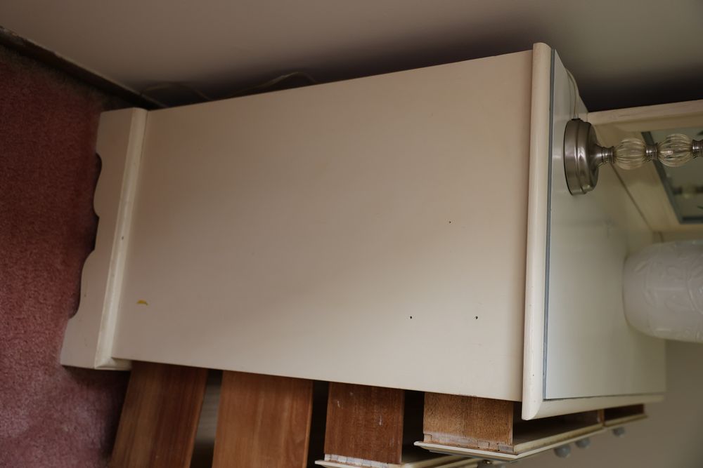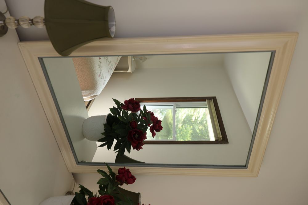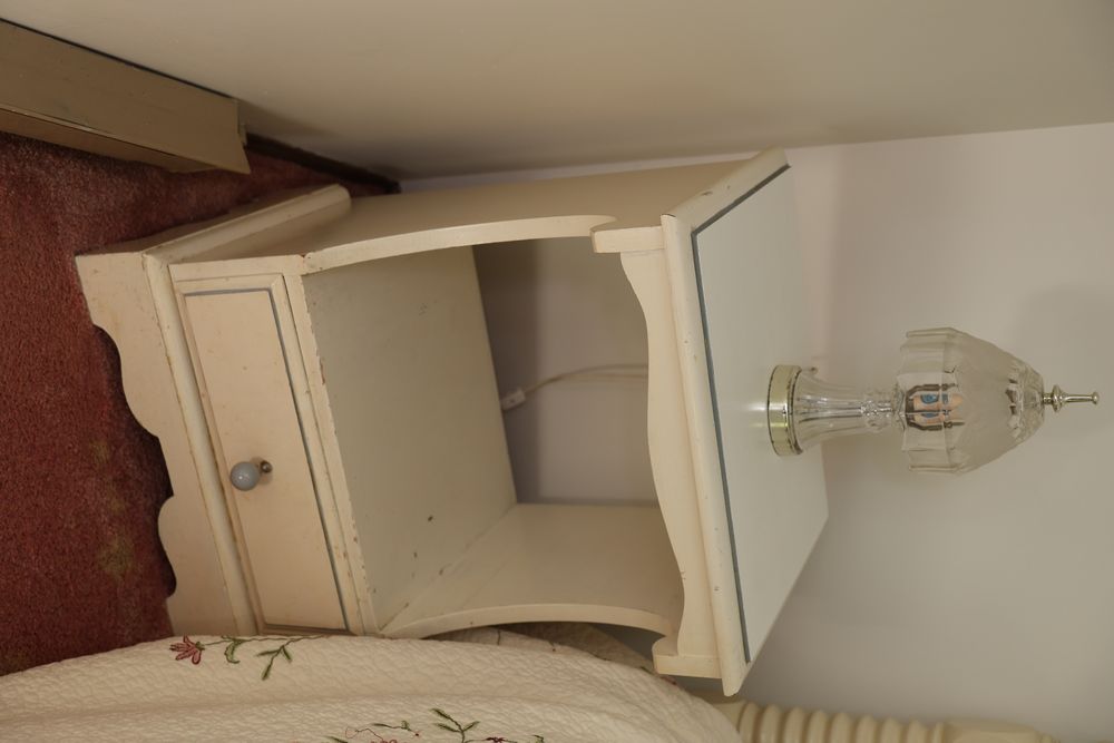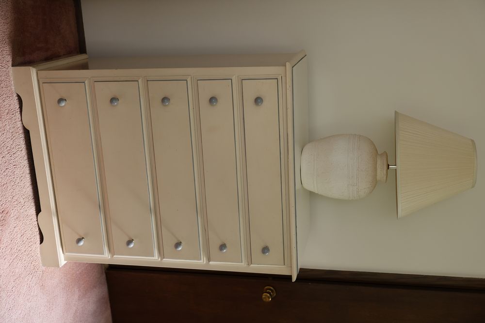 Traditional Bedroom Furniture Set With Dresser, Chest, Mirror, and Nightstand. Includes a cream-finished dresser with eight drawers 52"W x 18"D x 32"H, a matching chest of drawers 34"W x 18"D x 44.5"H, a wall mirror 41"H x 21"W, and a single-drawer nightstand. Furniture features simple detailing, wooden construction, and coordinating knobs. Does not include bedframe or mattress. Buyer is responsible for all materials and help necessary for safe and proper removal. Buyer must take all. Pickup only.