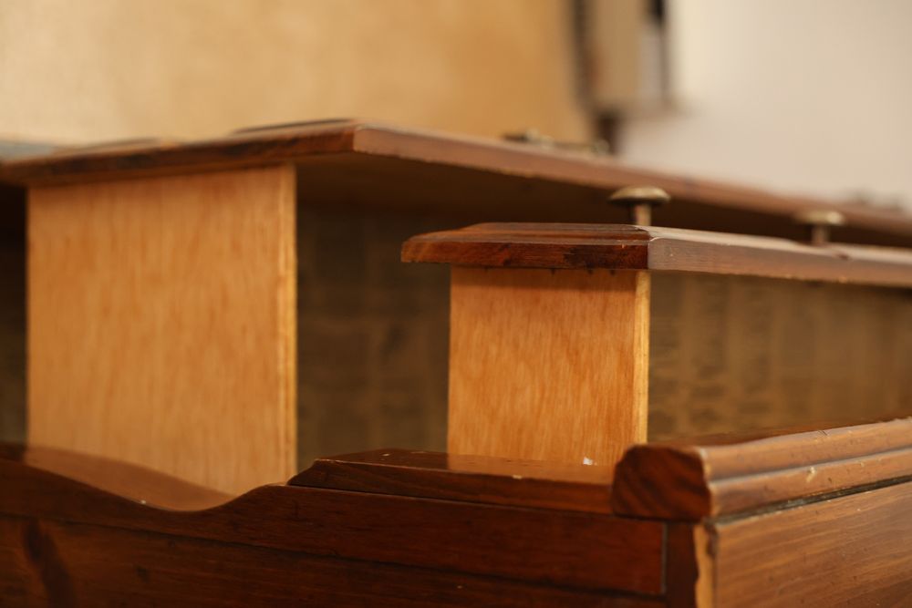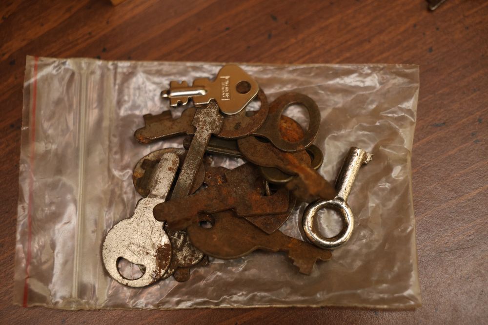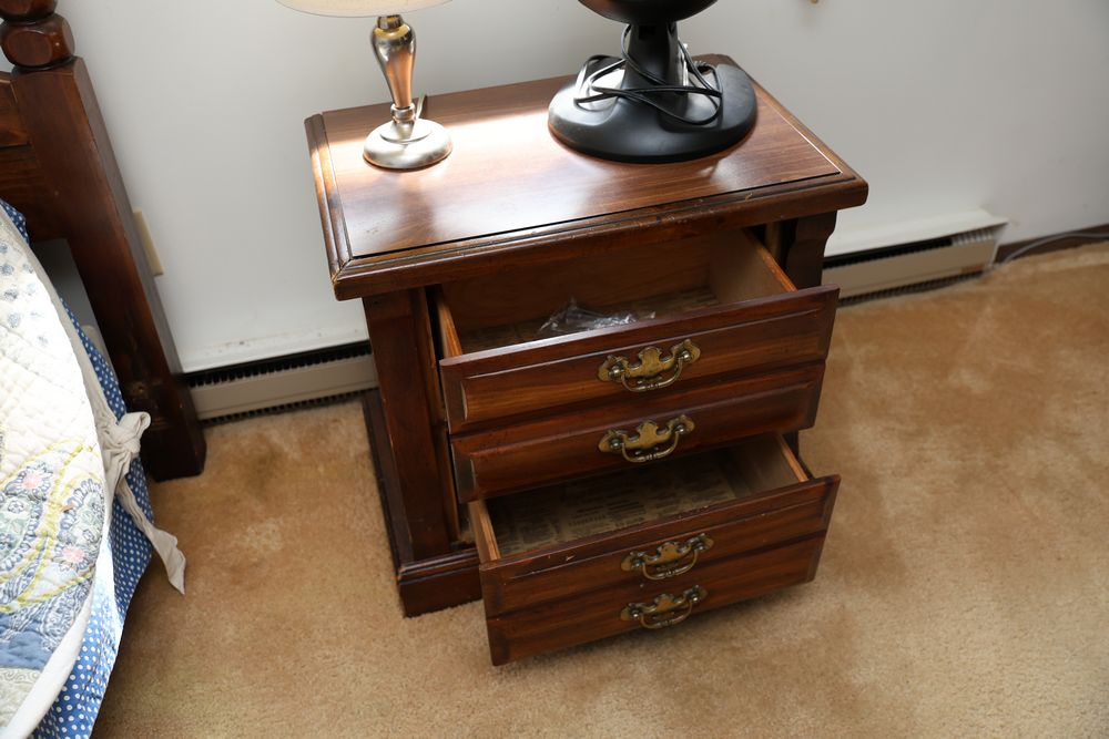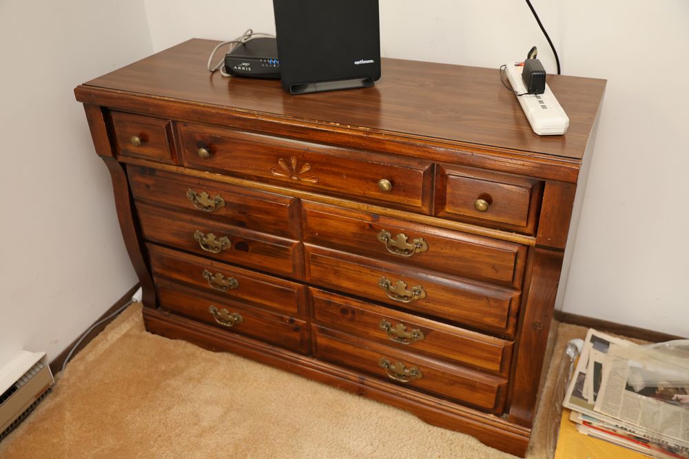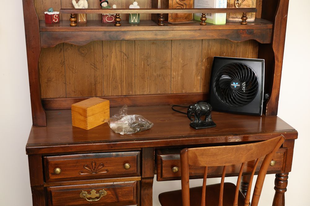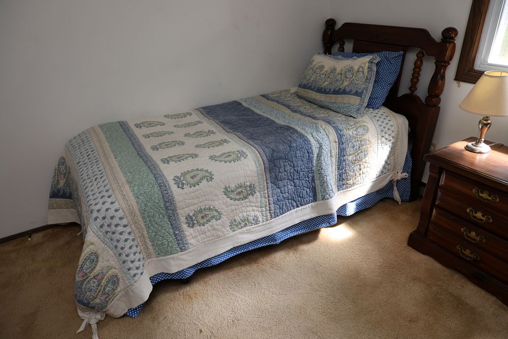 Wooden Furniture Set with Key Collection and Floor Lamp. Includes a twin-sized headboard and twin frame with spindle design, a matching bedside table with three drawers, a chest of drawers featuring multiple compartments 44"W x 18"D, a desk with detachable hutch showcasing shelves and drawers 44"W x 17.5"D x 75"H, a wooden chair, and a metal floor lamp with a white fabric shade. Does not include items from other lots. Buyer is responsible for all materials and help necessary for safe and proper removal. Pickup only.