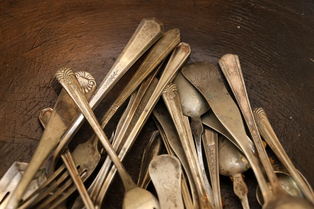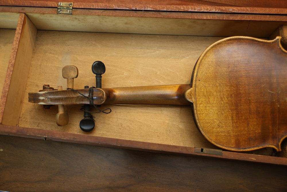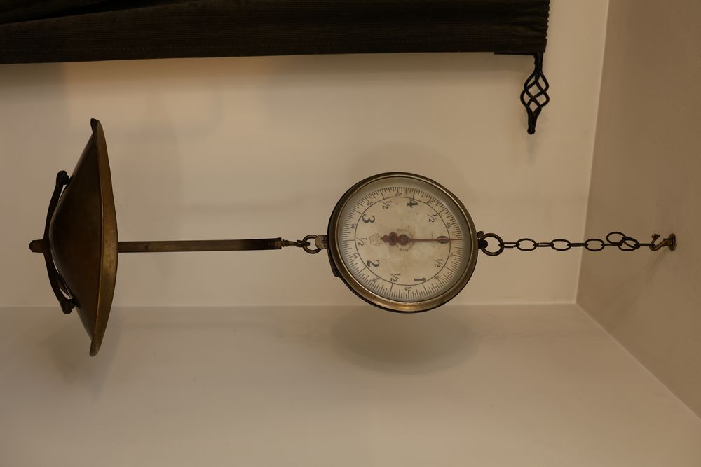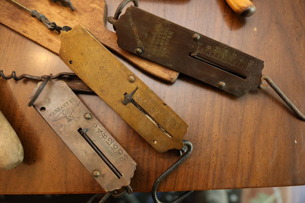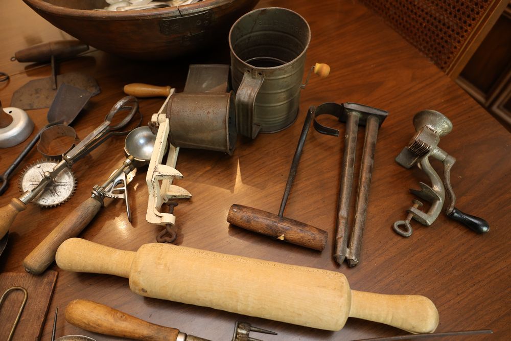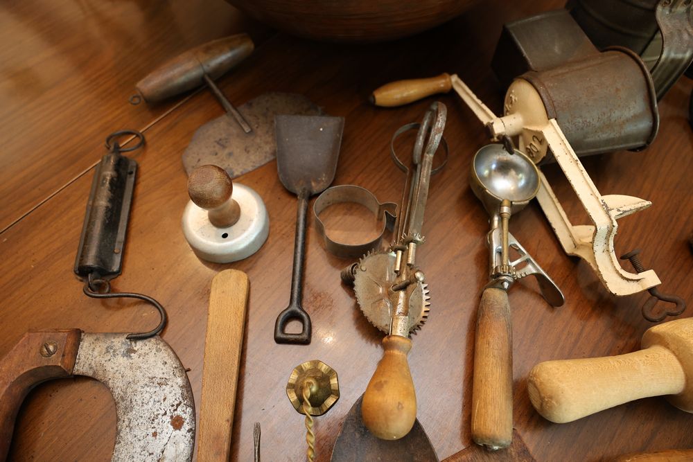Vintage Metalware, Kitchen Utensils, Brass Scale, and Instrument. Includes brass weighing scale with a capacity of 30 lbs., featuring a hanging pan and ornate red needle. Bells with turned wooden handles, kitchenware including rolling pin, corer, scoops, and ladles, and a rustic violin in a worn wooden case. The lot also includes silverware utensils and a large wooden bowl. Buyer must take all. Pickup only.