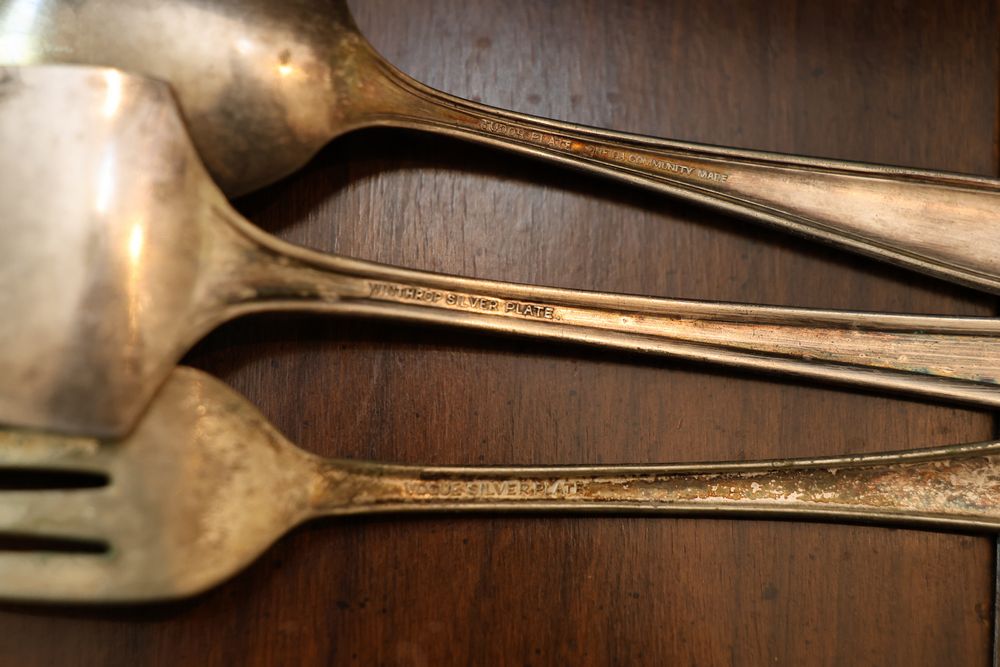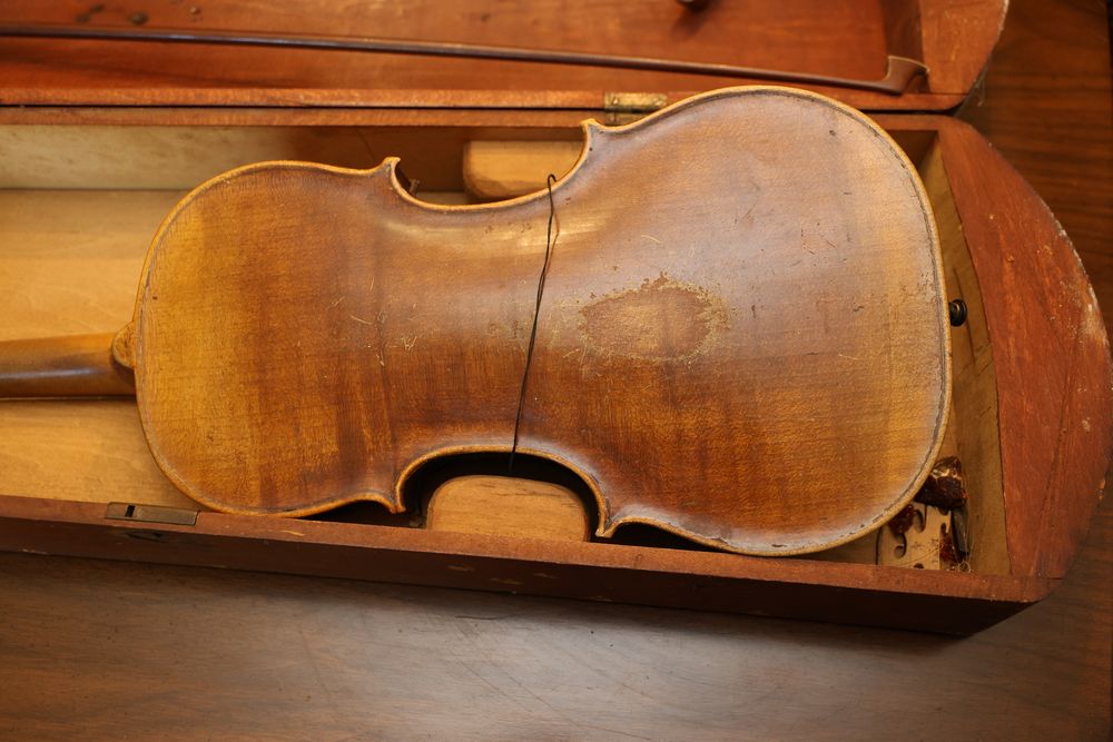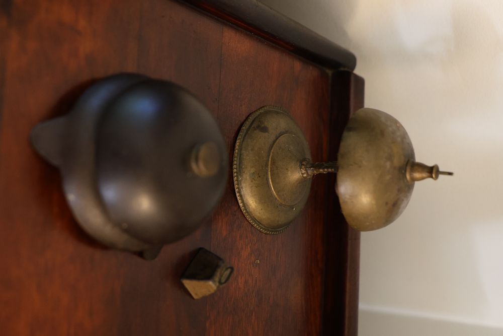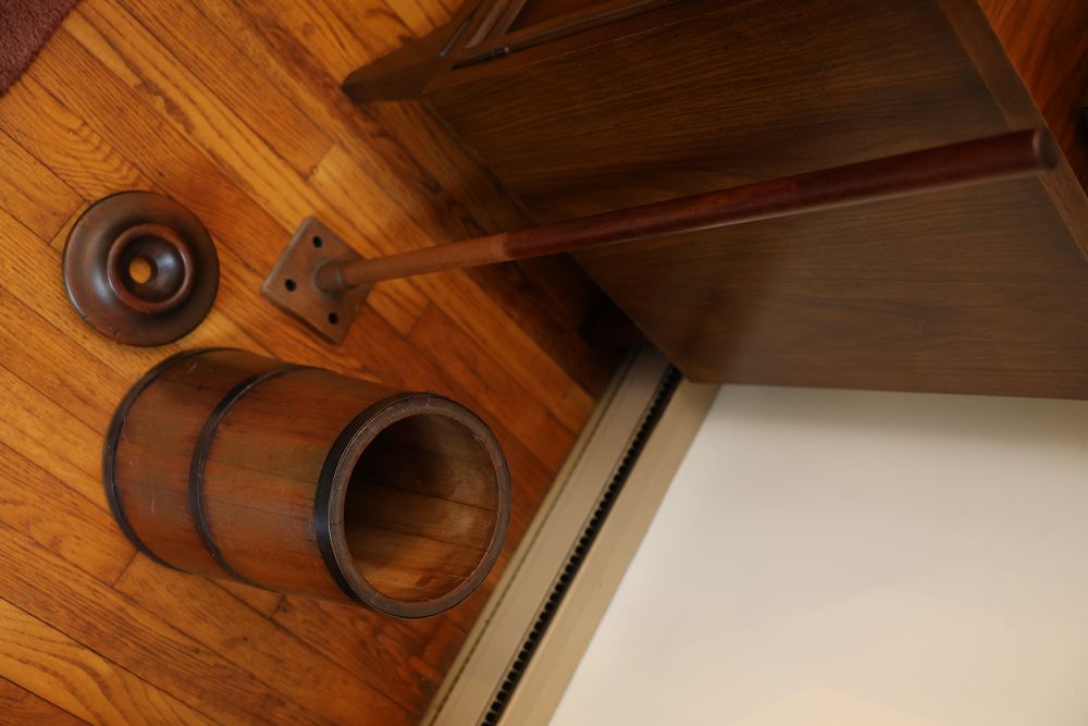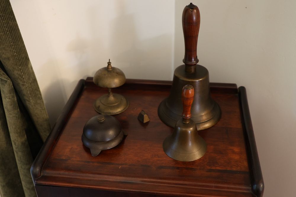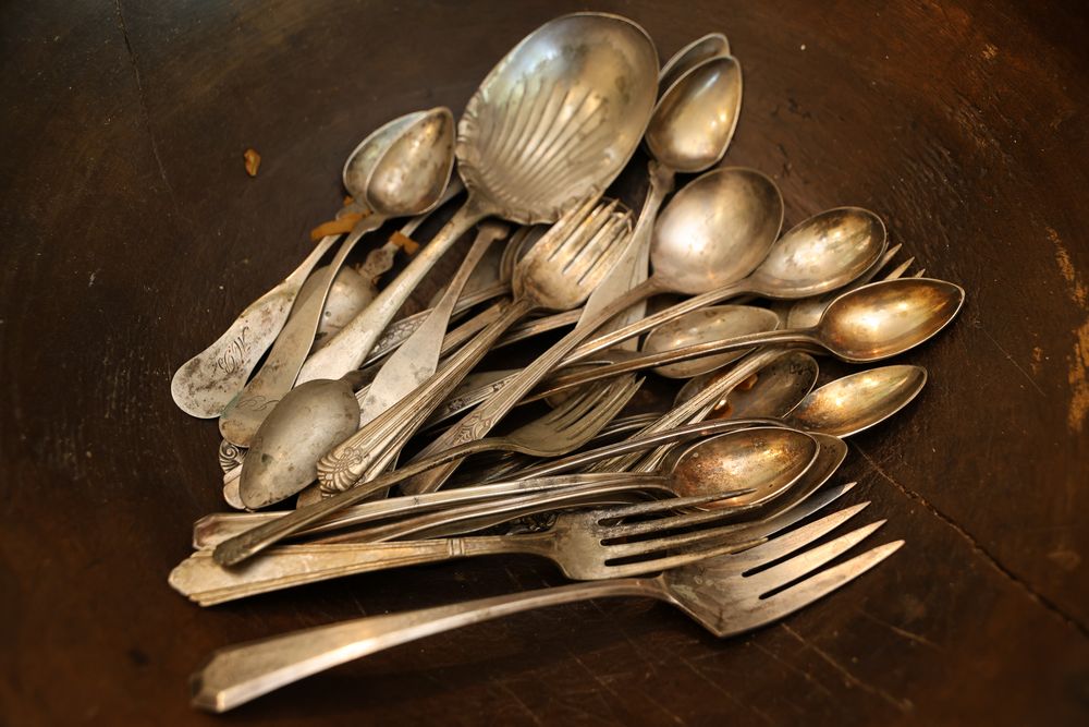 Vintage Metalware, Kitchen Utensils, Brass Scale, and Instrument. Includes brass weighing scale with a capacity of 30 lbs., featuring a hanging pan and ornate red needle. Bells with turned wooden handles, kitchenware including rolling pin, corer, scoops, and ladles, and a rustic violin in a worn wooden case. The lot also includes silverware utensils and a large wooden bowl. Buyer must take all. Pickup only.