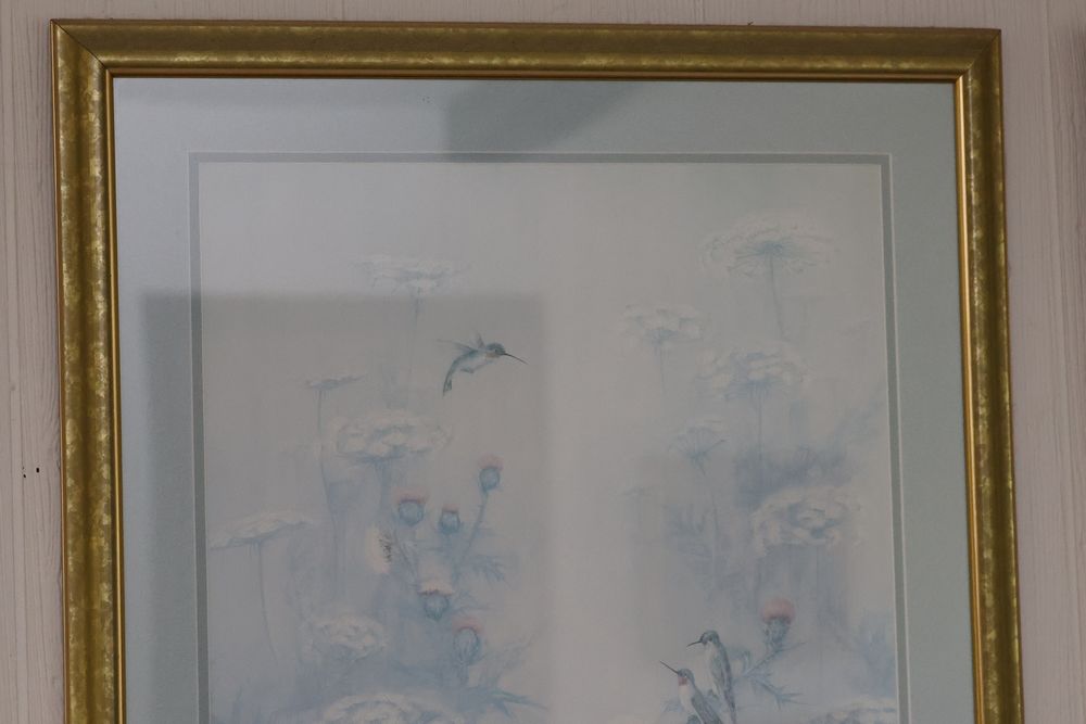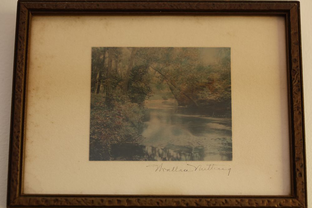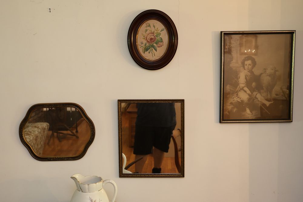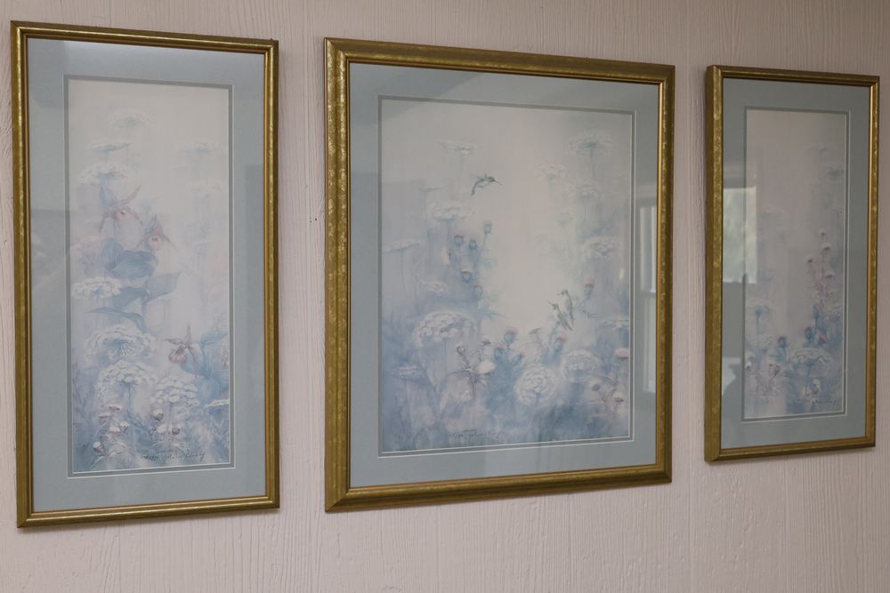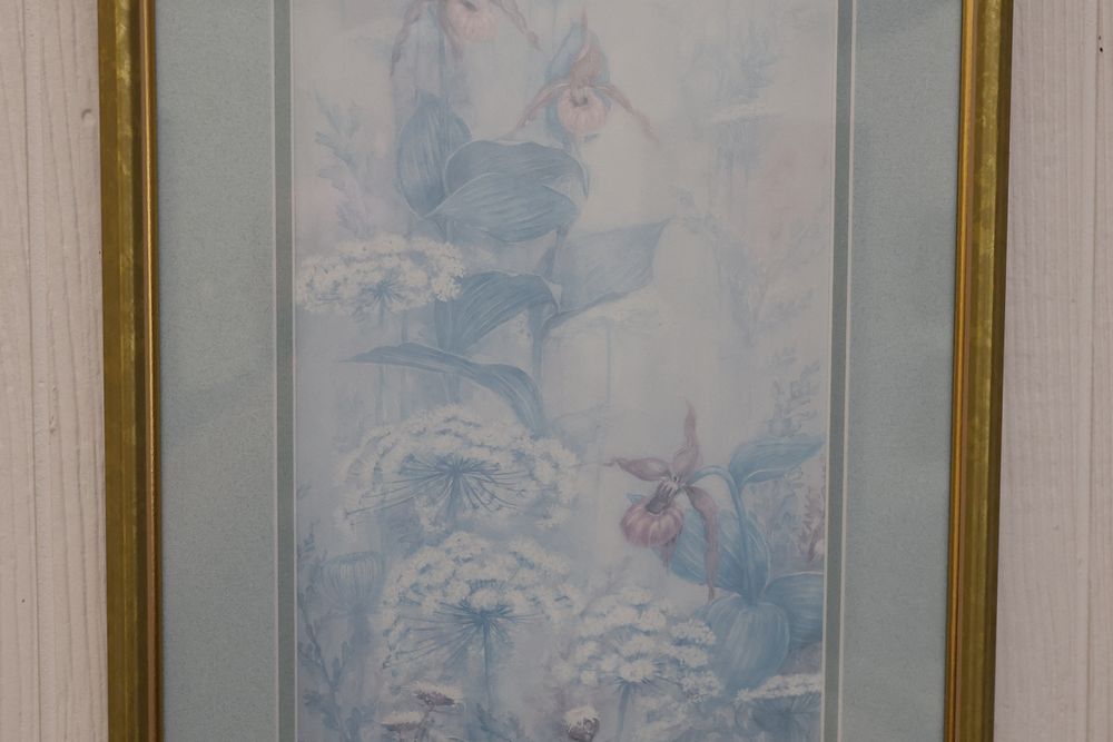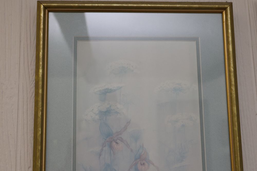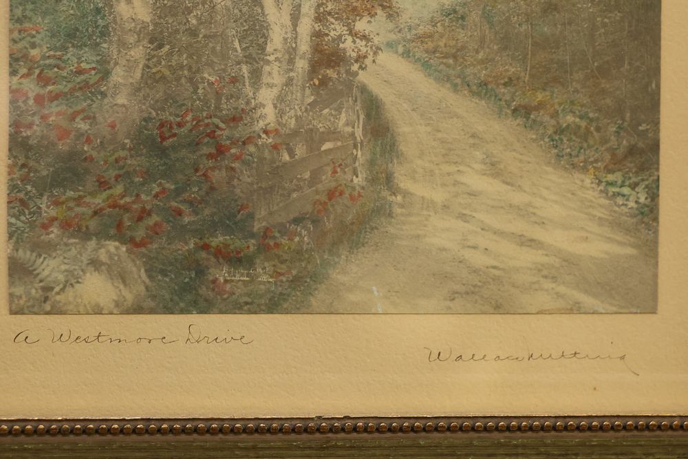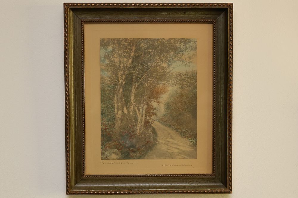 Wall Art With Mirrors Including Framed Prints and Paintings. This includes framed mirrors, art prints attributed to Wallace Nutting, landscapes, floral prints, and geometric designs. Frames feature materials like wood and metal, with varying styles and conditions. Buyer must take all. Pickup only.