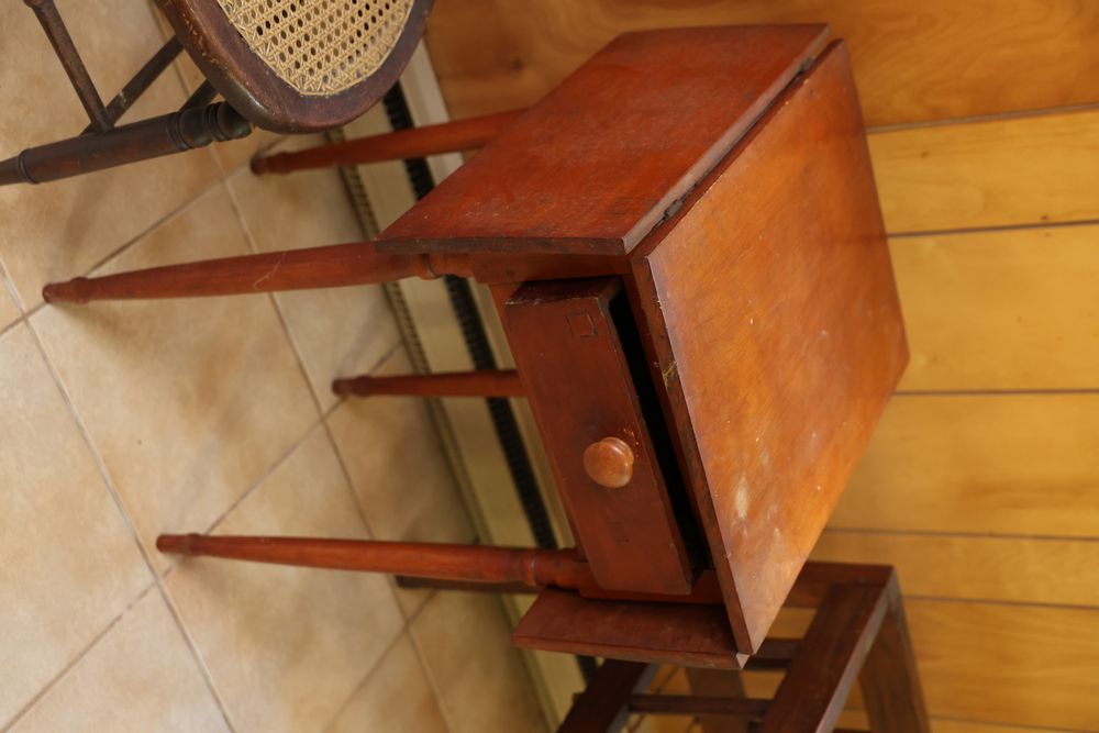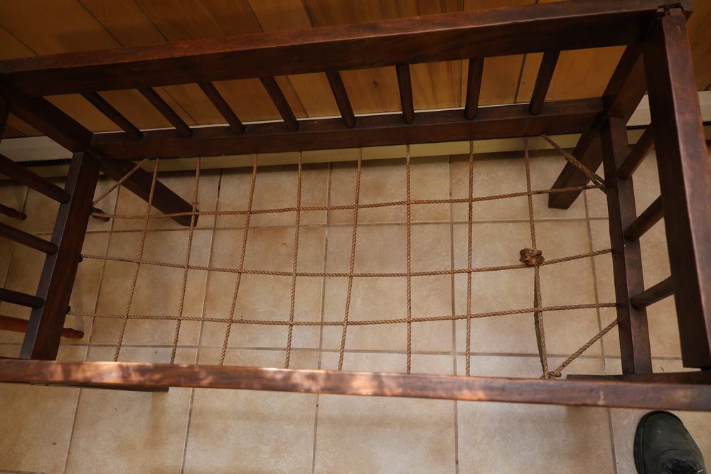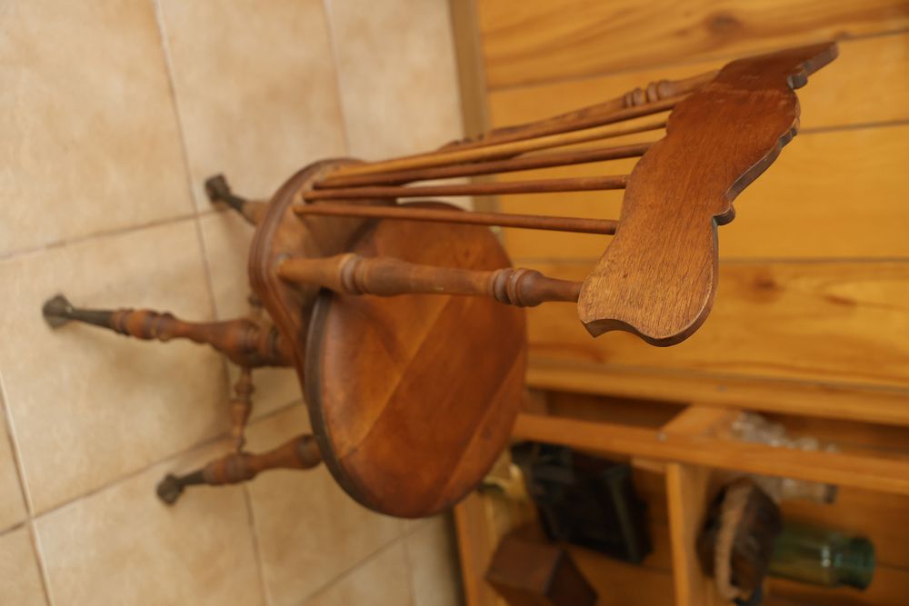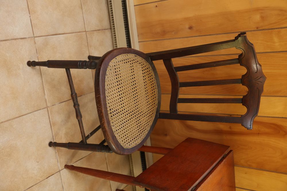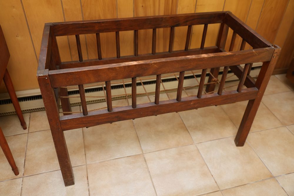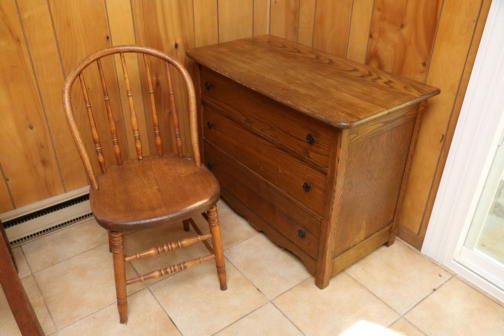Wooden Furniture Set with Trunk, Cradle, Chairs, Table, and Chest of Drawers. Includes a wooden trunk with metal accents and functional latches, a three-drawer wooden chest 36"W x 19"D, a wooden bookshelf 37.5"W x 12"D x 75"H, a wooden cradle with a lattice bottom, a small wooden side table with a single drawer, and multiple wooden chairs with varied designs. This set offers a diverse array of wooden furniture pieces. Does not include items from other lots. Buyer is responsible for all materials and help necessary for safe and proper removal. Buyer must take all. Pickup only.