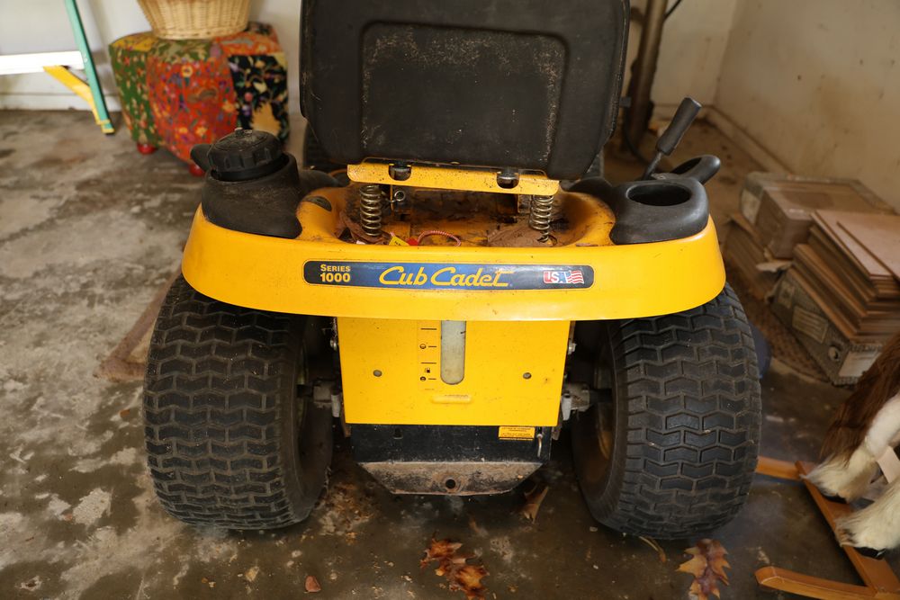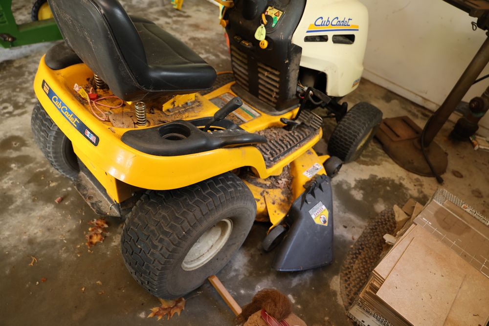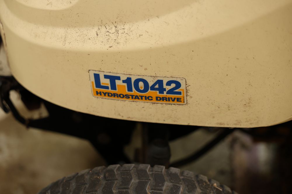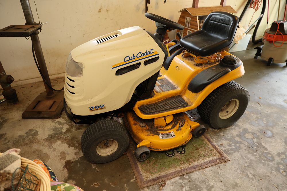 Cub Cadet LT1042 Hydrostatic Drive Lawn Tractor with Kohler Courage 19 Engine. Model LT1042 with Kohler Courage 19 Twin Cam OHV Engine. Spec No. PS-SV590-0003 and Serial No. 3611509713. Seller reports functional when last used but will need a battery jump. Does not include items from other lots. Buyer is responsible for all materials and help necessary for safe and proper removal. Pickup only.