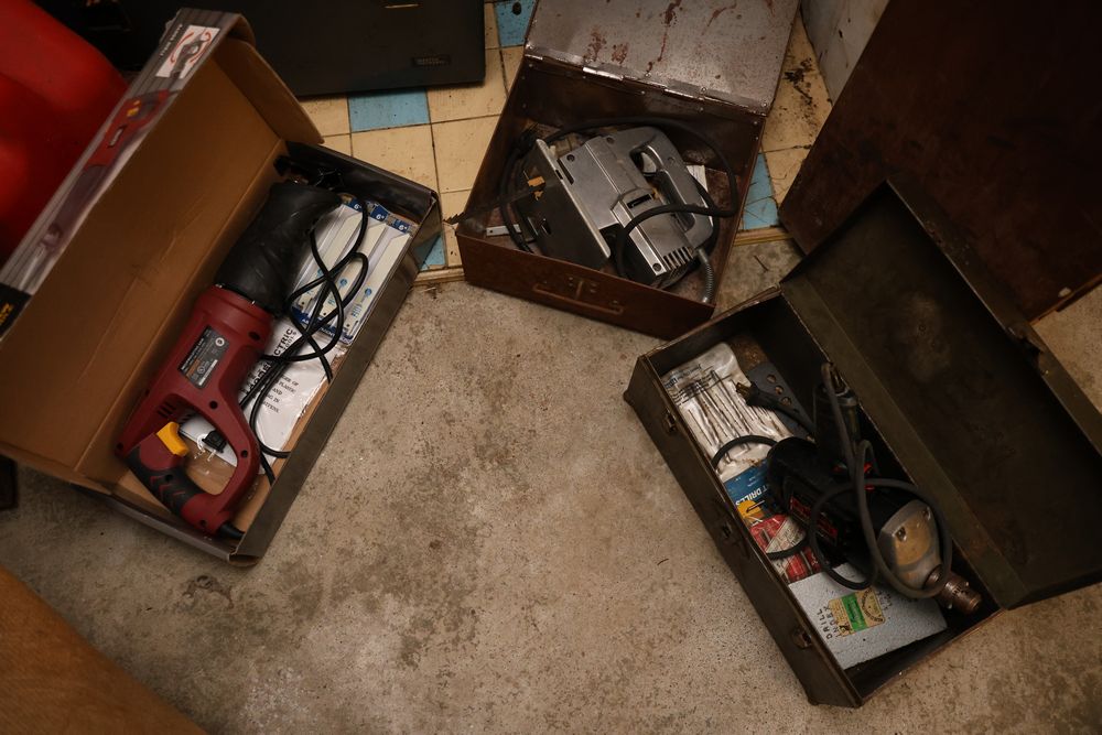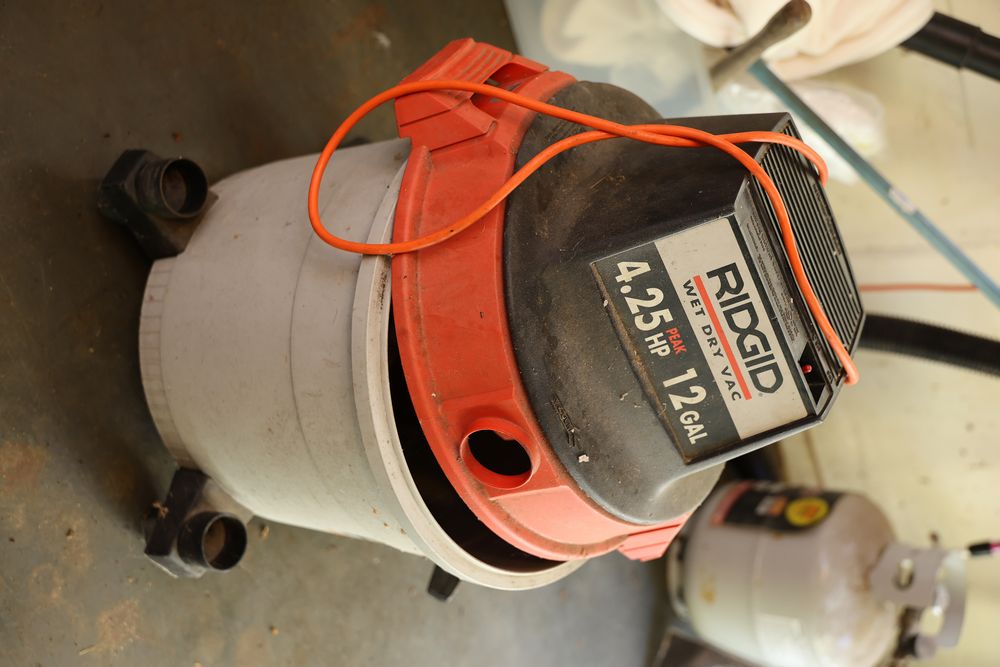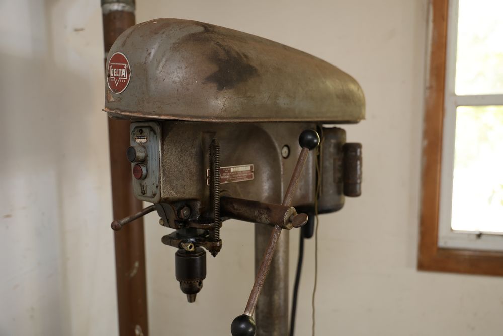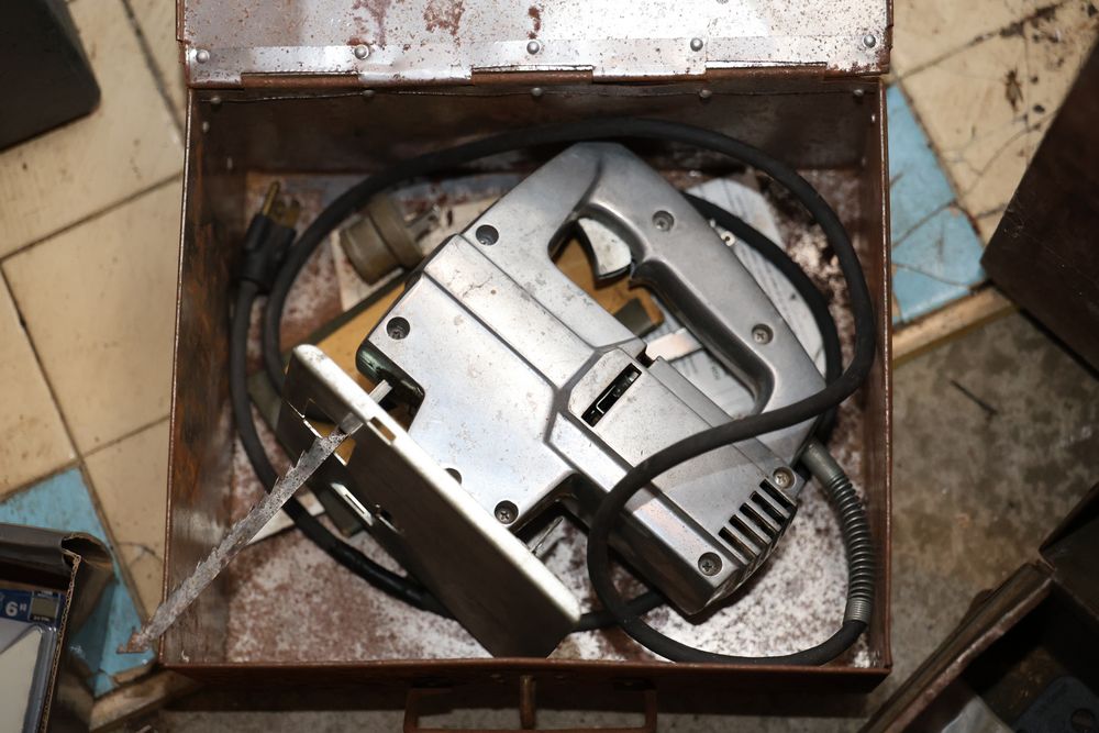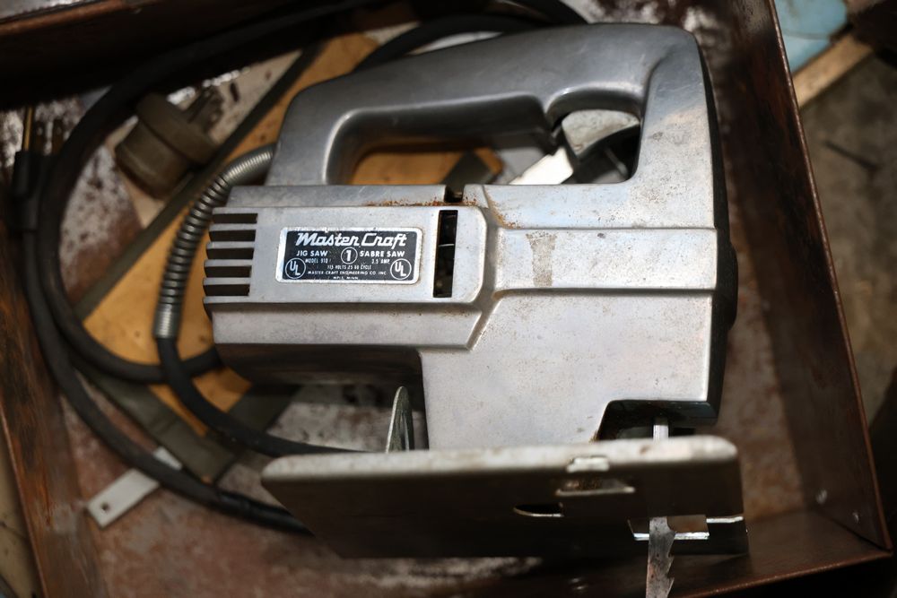 Workshop Tools and Equipment Assortment Including Sears Drill, Rockwell Drill Press, and RIDGID Wet/Dry Vac. Includes Sears 3/8-inch Electric Drill (Model 315 11141), Rockwell Delta Drill Press (Serial 113-5849), RIDGID 4.25 HP 12-Gallon Wet/Dry Vacuum, Werner 6-Foot Ladder (Model 5906), and additional hand tools, saws, and accessories. Includes reciprocating saw (Item 65670), MasterCraft Jig Saw (Model 100), Black & Decker TR1600 Hedge Trimmer, and other miscellaneous workshop items. Seller reports all tools were functional when last used. Does not include items from other lots. Buyer is responsible for all materials and help necessary for safe and proper removal. Buyer must take all. Pickup only.