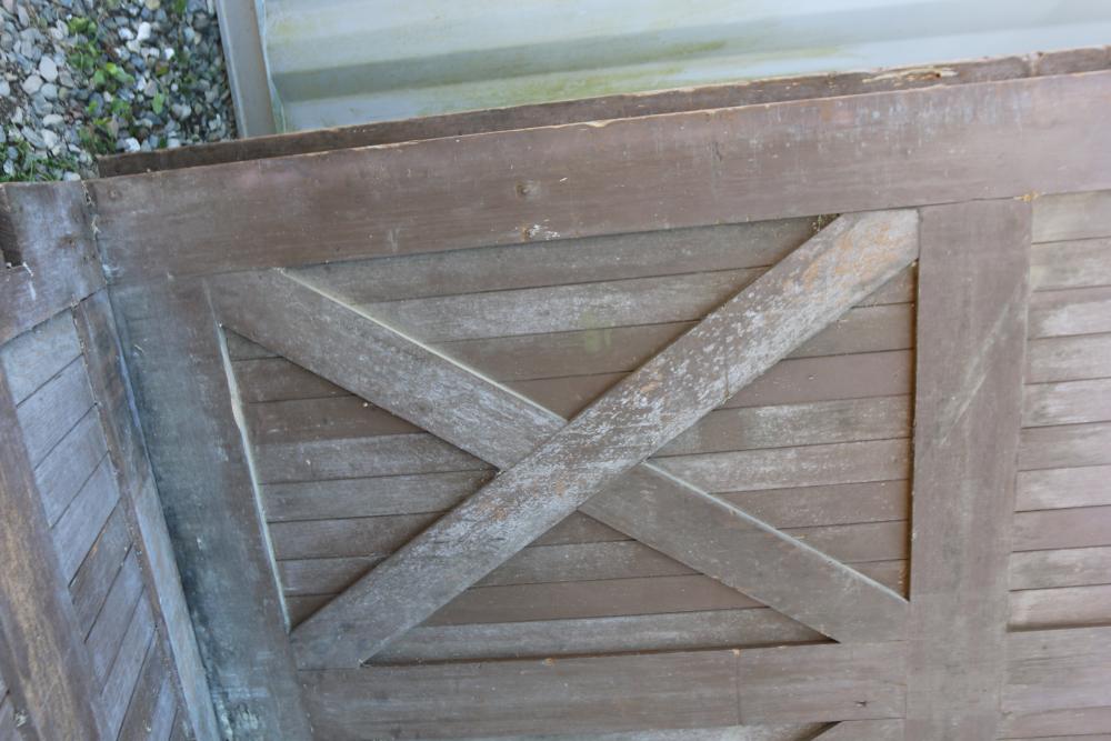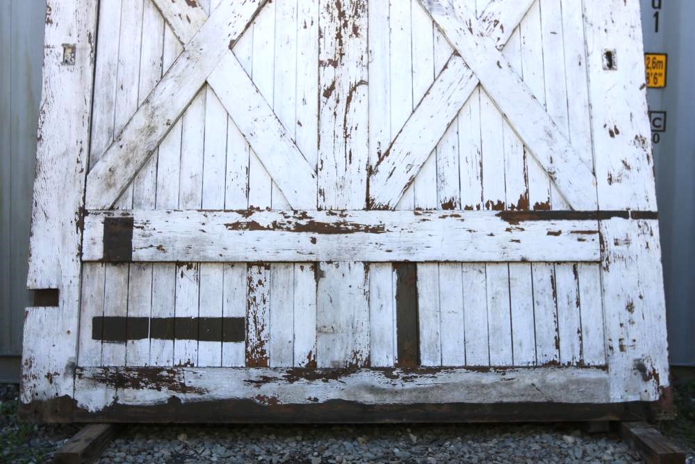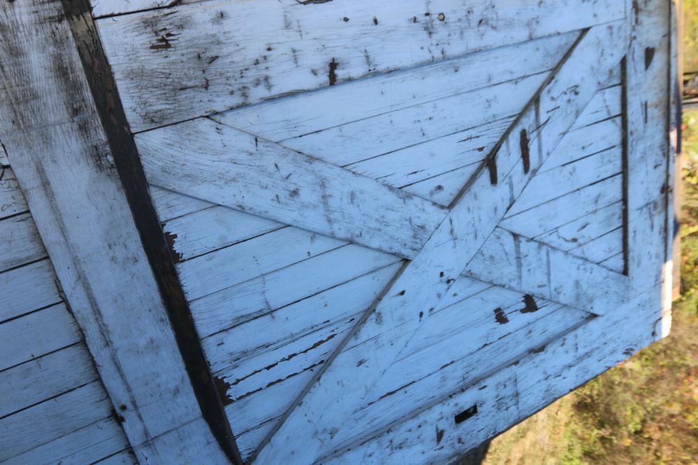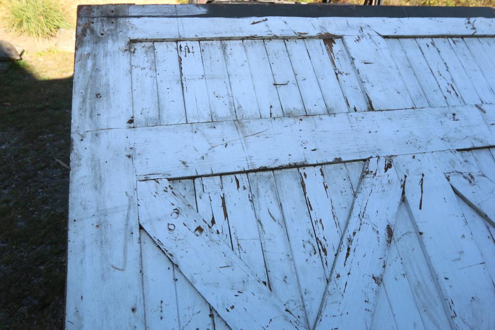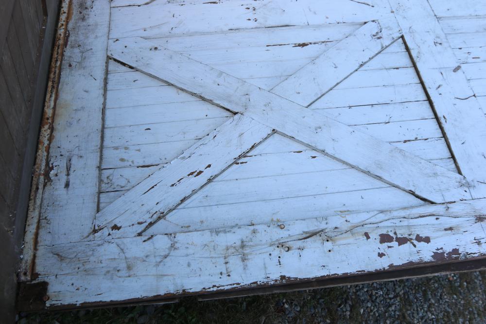 Three Carriage Barn Doors measuring approximately 94.5"H x 97.5"W x 2-1/8"D each. These barn doors display a traditional cross-brace pattern on both sides. One side features a painted finish, while the other side showcases a natural wooden surface. Some original hardware pieces remain partially attached. No additional hardware included. Seller reports: Origins are from Newburgh Carriage House. Buyer is responsible for help and materials necessary for removal. Buyer must take all. Pickup only.
