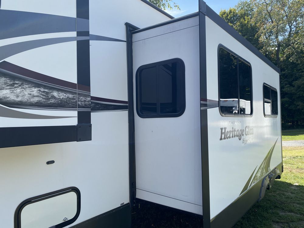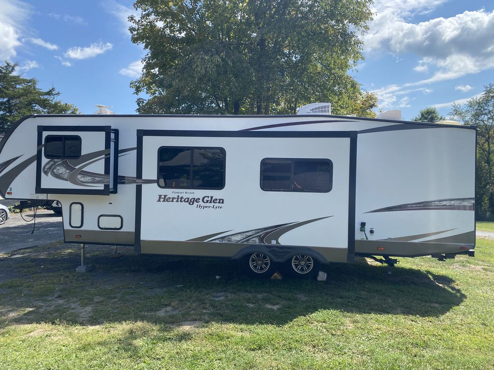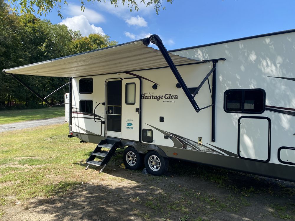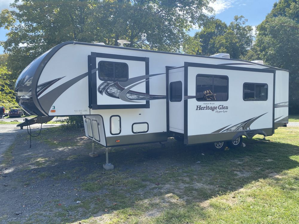 2018 Forest River Hyper-Lyte Heritage Glenn RV Camper. Model WBF28BHHL. VIN#4X4FWBD24JV701025. 34' fifth-wheel RV designed for family travel, featuring sleeping space for up to eight people, two slide-outs, a private master bedroom, a walk-in pantry, and double-bed bunks for the kids. This lightweight model includes interior amenities like Stainless appliances, a residential-style kitchen with a high-rise faucet, and exterior features such as a power awning with "Quick Pitch" functionality. Virginia Title. RV is located in Highland Mills, NY. A NYS DMV MV-50 (transfer of title) will be done with the seller at the time of pickup.