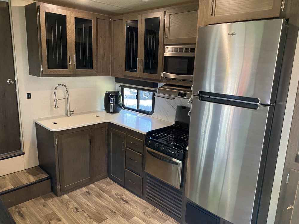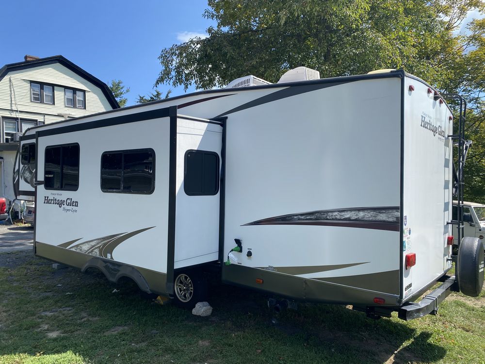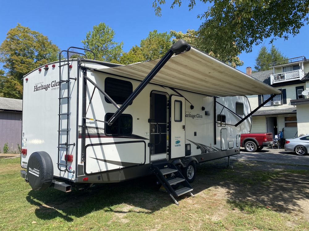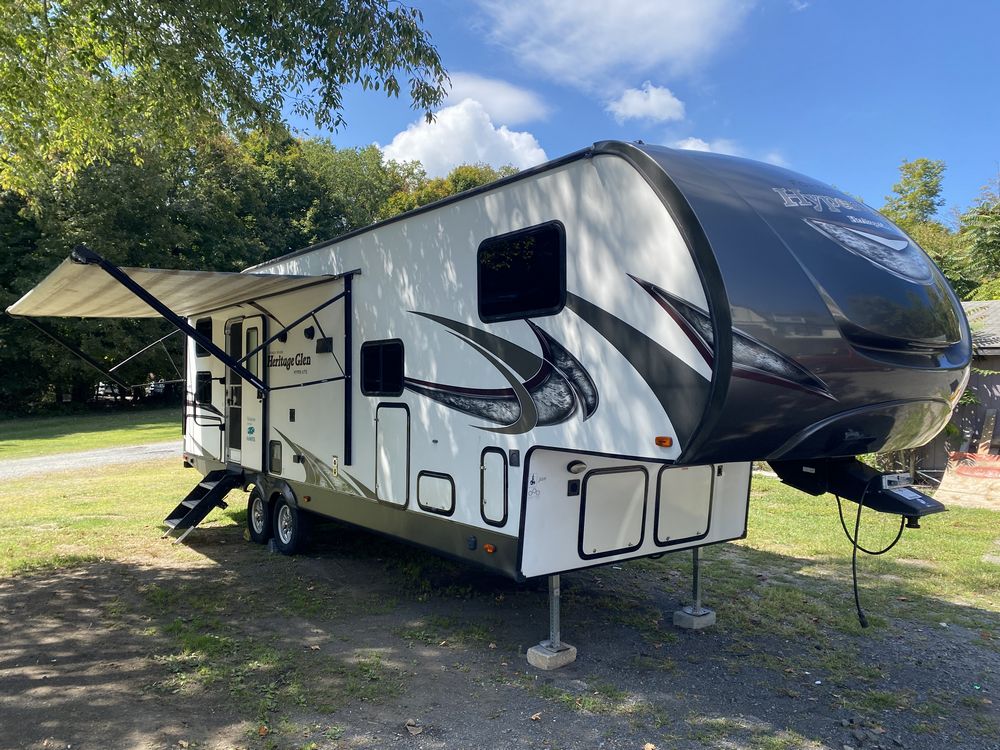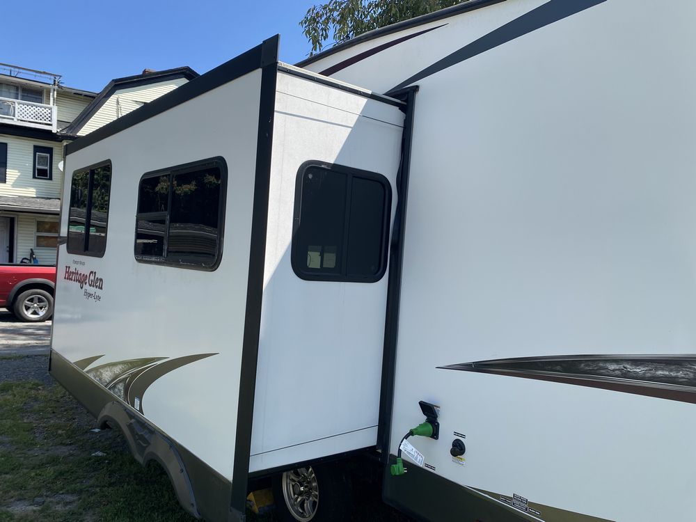 2018 Forest River Hyper-Lyte Heritage Glenn RV Camper. Model WBF28BHHL. VIN#4X4FWBD24JV701025. 34' fifth-wheel RV designed for family travel, featuring sleeping space for up to eight people, two slide-outs, a private master bedroom, a walk-in pantry, and double-bed bunks for the kids. This lightweight model includes interior amenities like Stainless appliances, a residential-style kitchen with a high-rise faucet, and exterior features such as a power awning with "Quick Pitch" functionality. Virginia Title. RV is located in Highland Mills, NY. A NYS DMV MV-50 (transfer of title) will be done with the seller at the time of pickup.