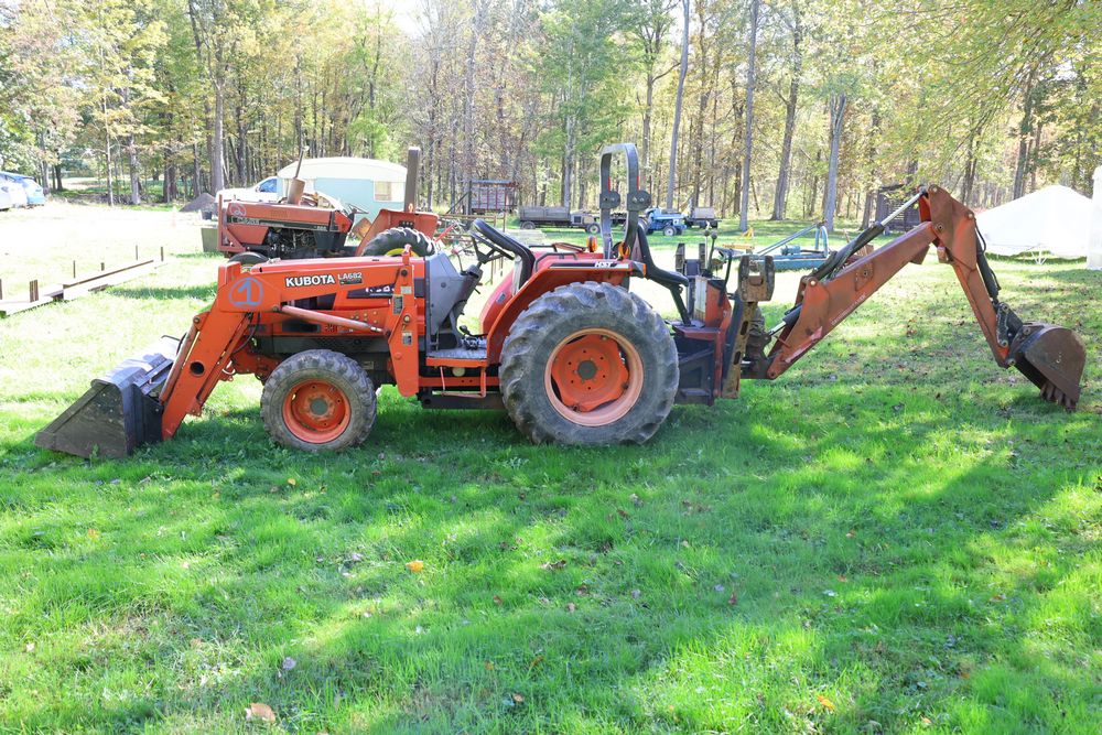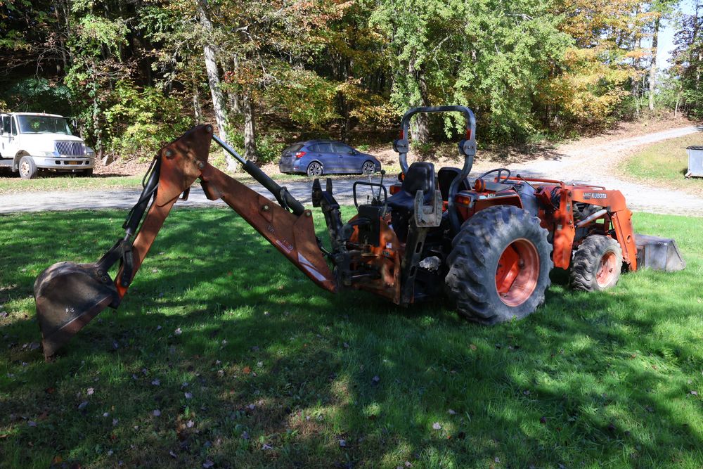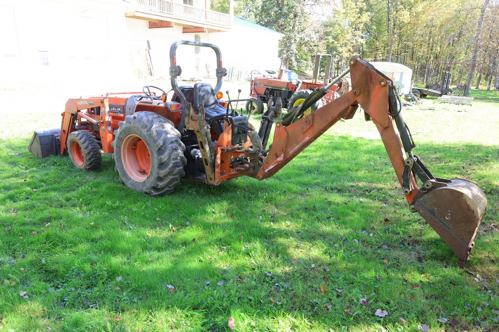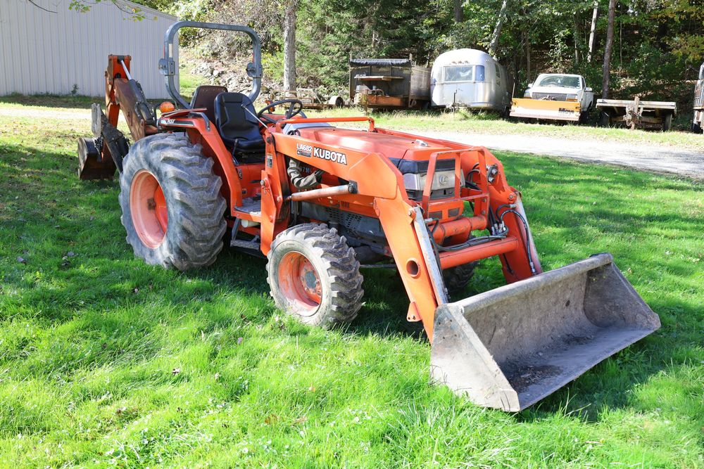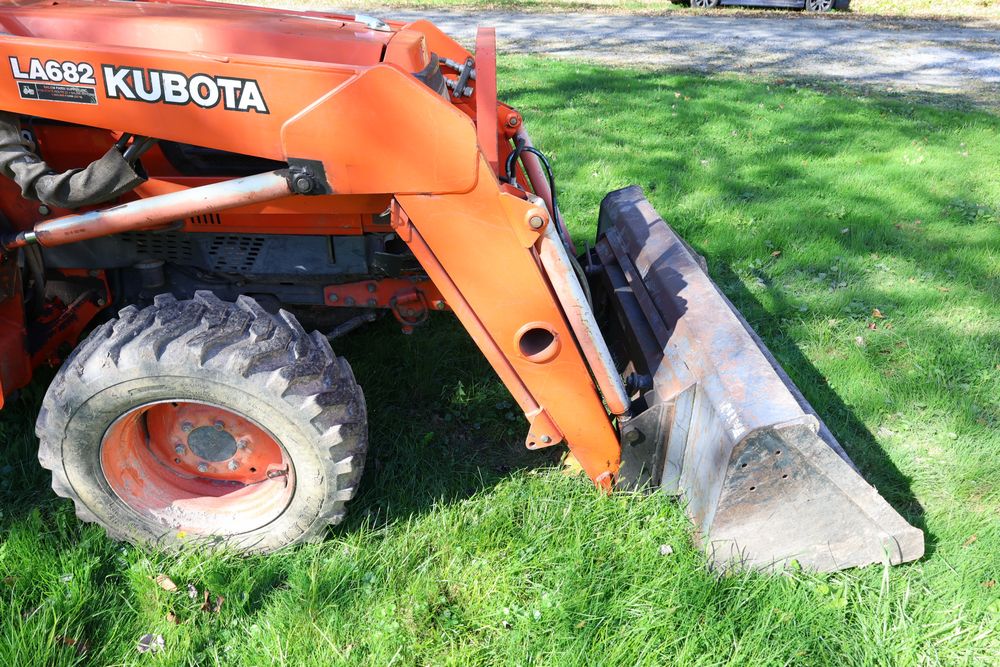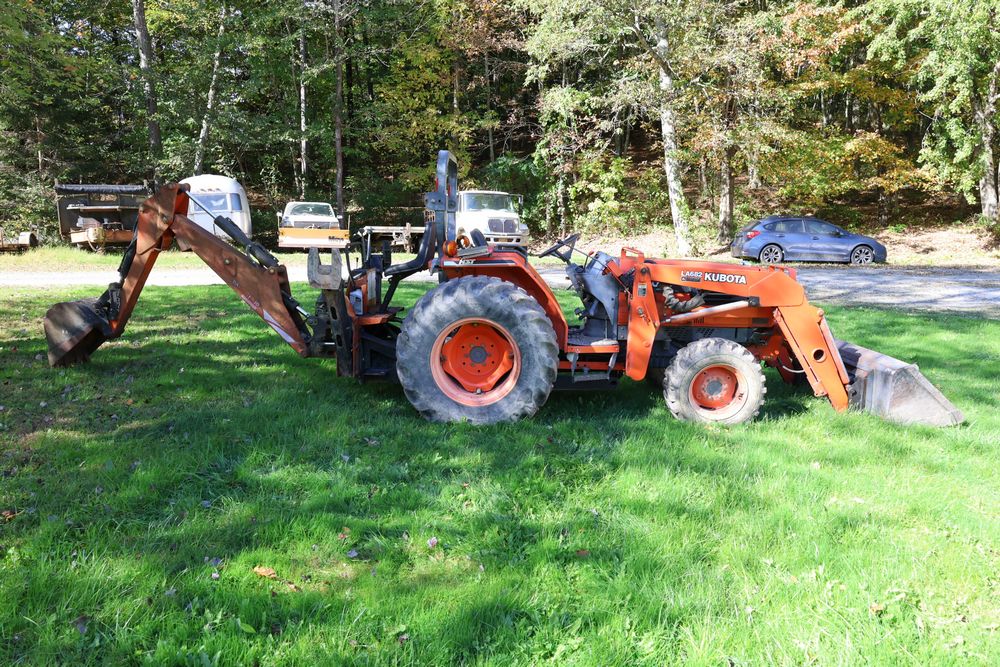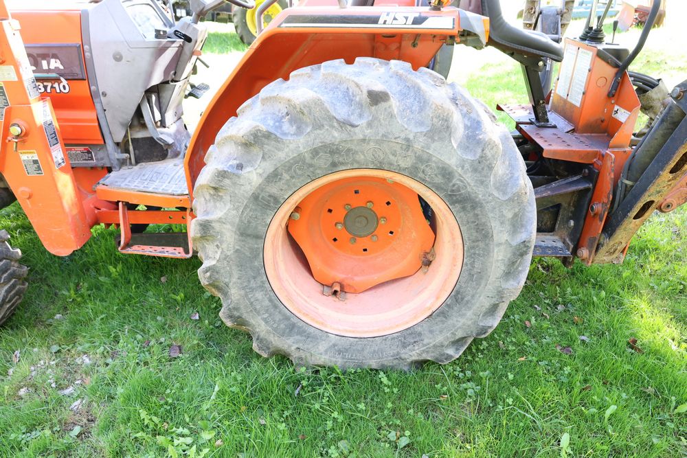 Kubota L3710 HST tractor with Kubota LA682 front end loader with quick detach bucket, 4WD, hour meter reading 1238, and Woods 9000 ground breaker back hoe. Operates as intended. Hour will be slightly higher at pickup. This must be picked up on 10/25 after the other auction items have been removed.