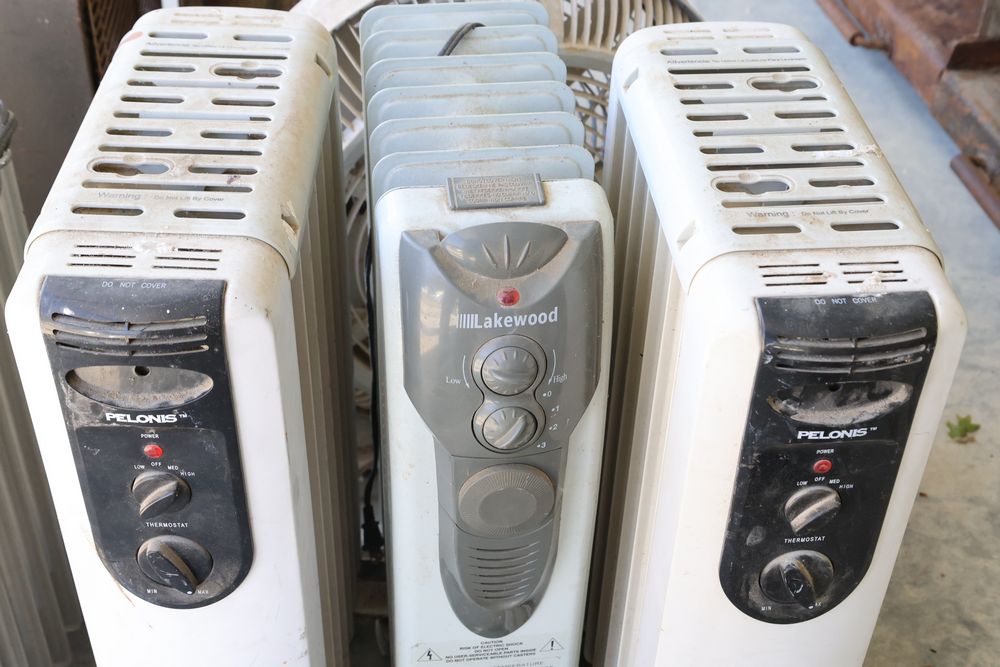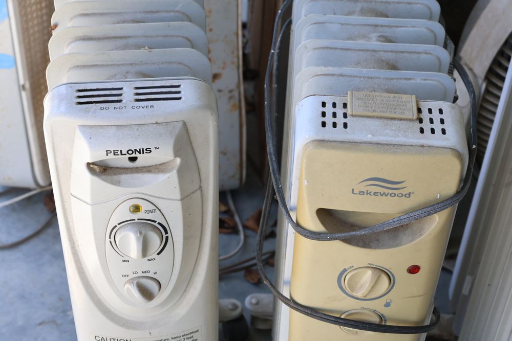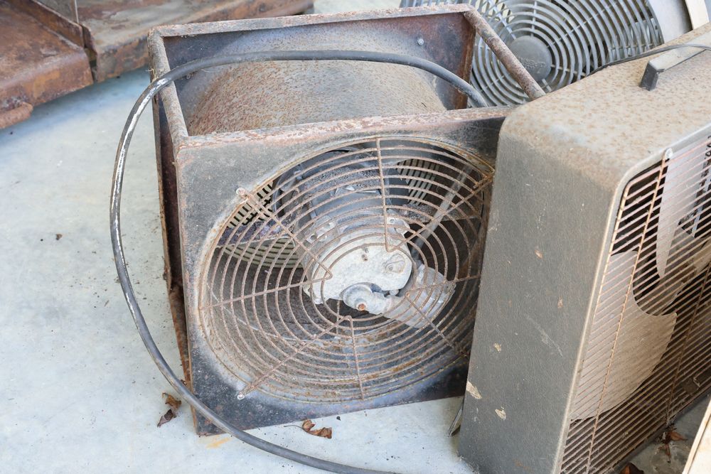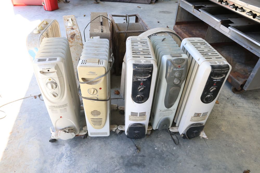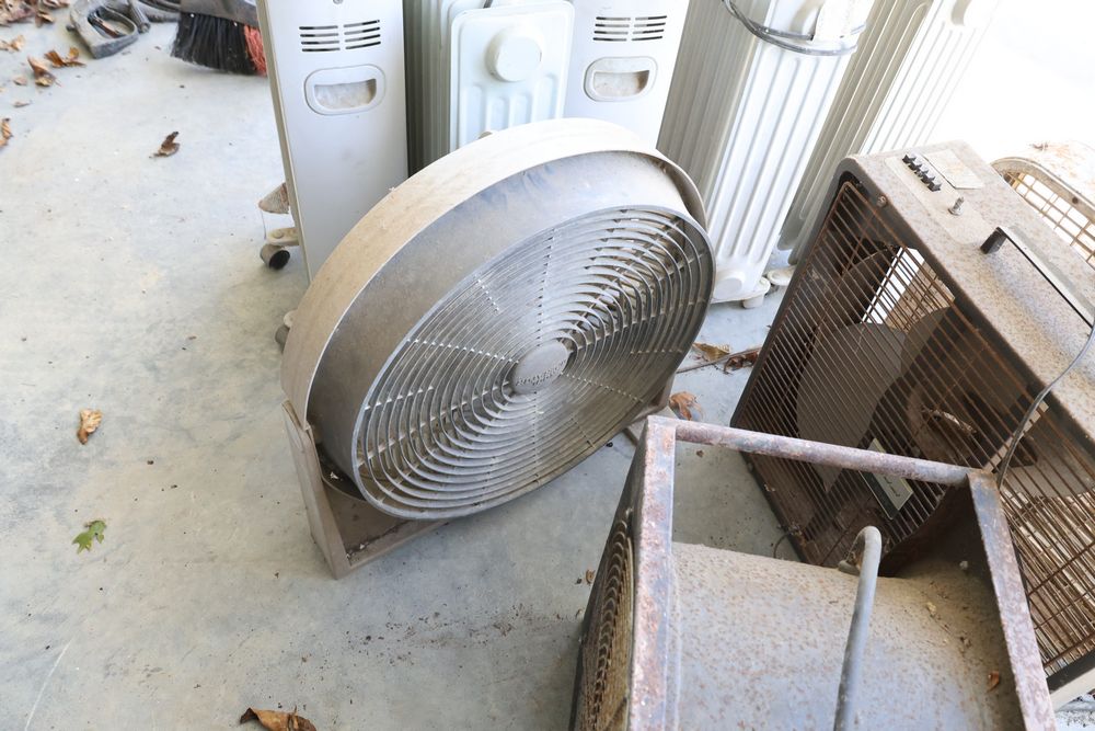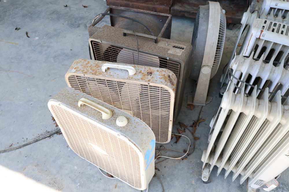 Five assorted fans including one exhaust fan, and five electric heaters. Seller reports in working condition.