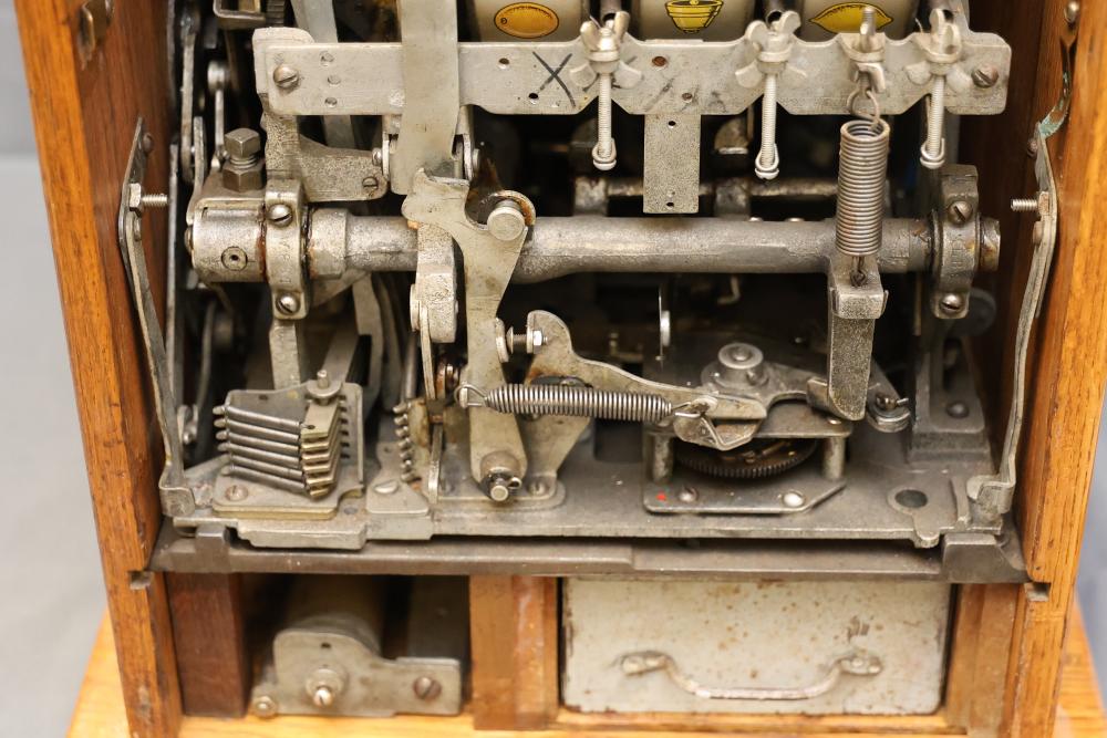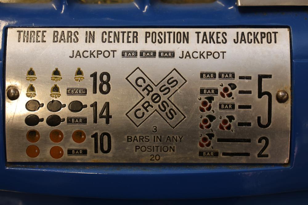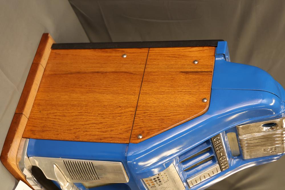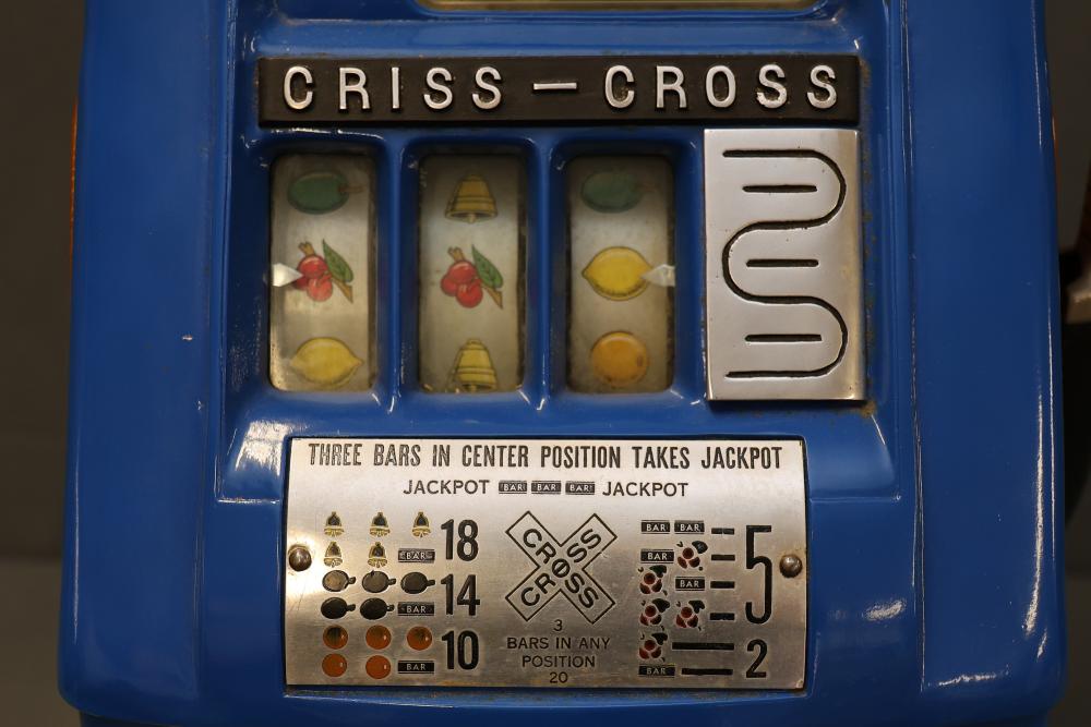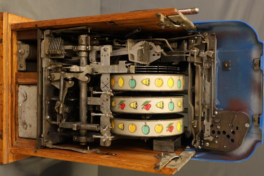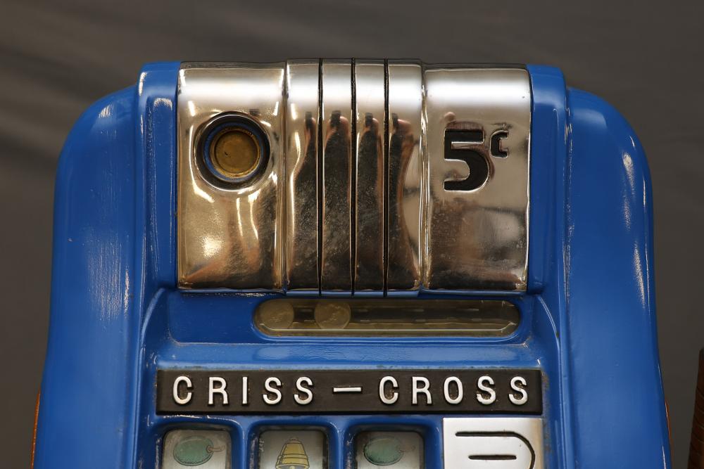 Criss-Cross 5-Cent Mechanical Slot Machine with Wooden Base. Featuring a classic design with a blue and chrome exterior, this slot machine operates entirely mechanically without requiring electricity. Includes detailed payout instructions on the front panel and features wooden side panels. The interior displays intricate gears and mechanics for operation. Comes with two keys for back panel access. Pickup only.