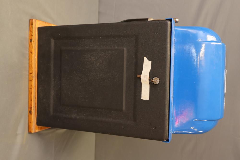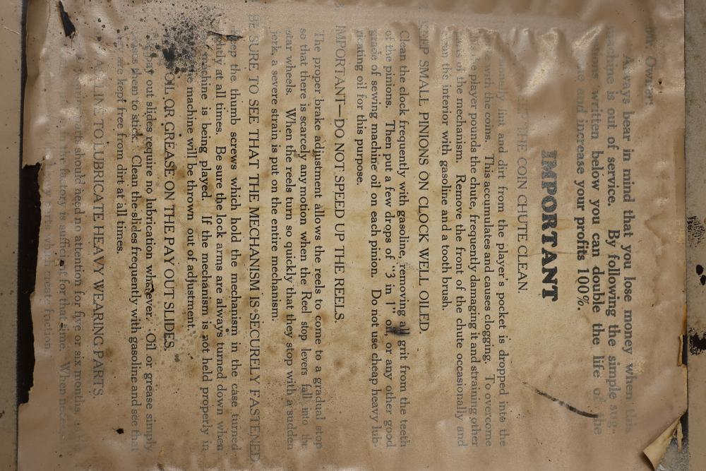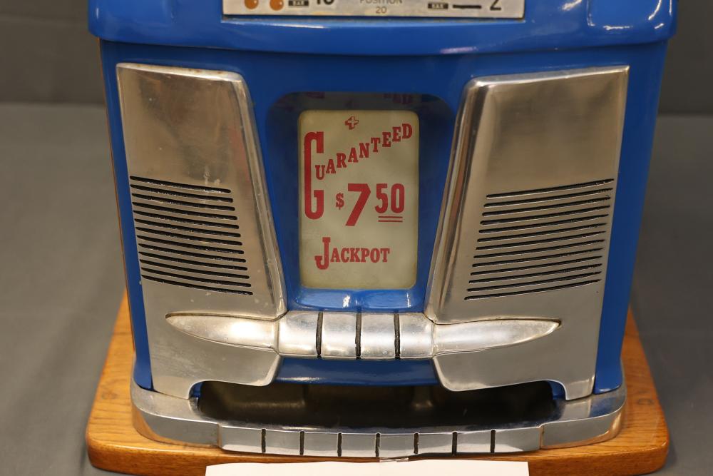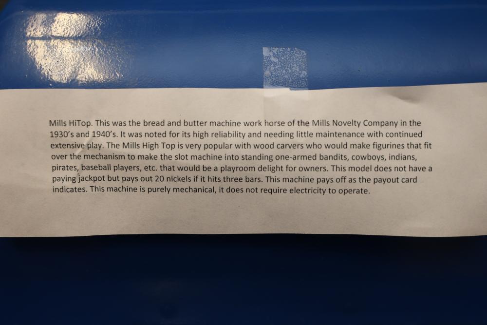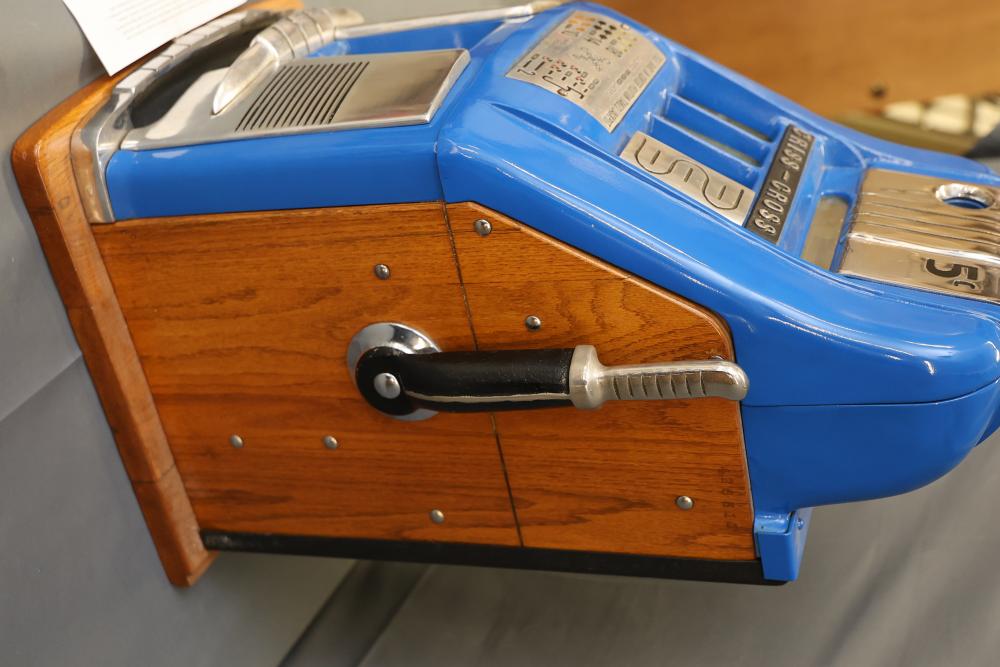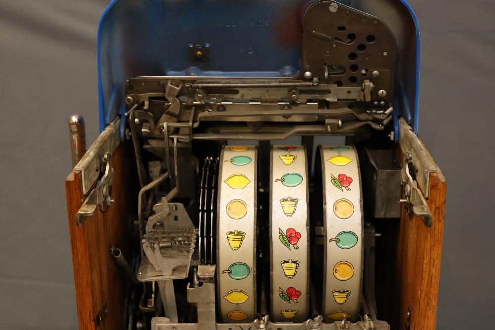 Criss-Cross 5-Cent Mechanical Slot Machine with Wooden Base. Featuring a classic design with a blue and chrome exterior, this slot machine operates entirely mechanically without requiring electricity. Includes detailed payout instructions on the front panel and features wooden side panels. The interior displays intricate gears and mechanics for operation. Comes with two keys for back panel access. Pickup only.