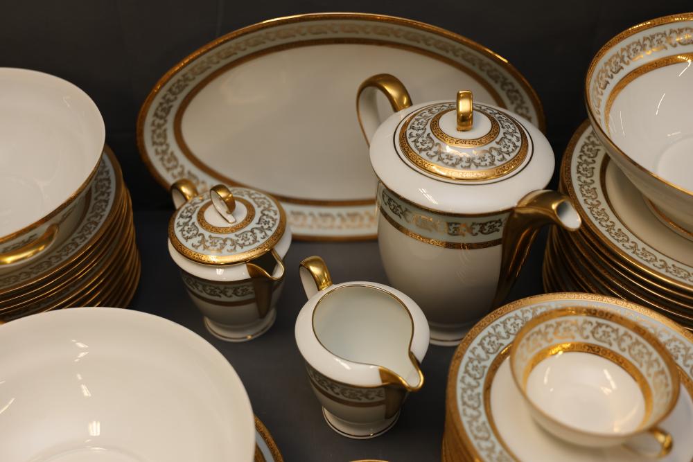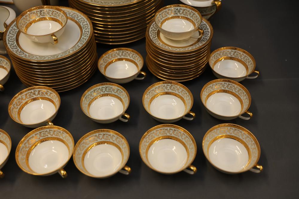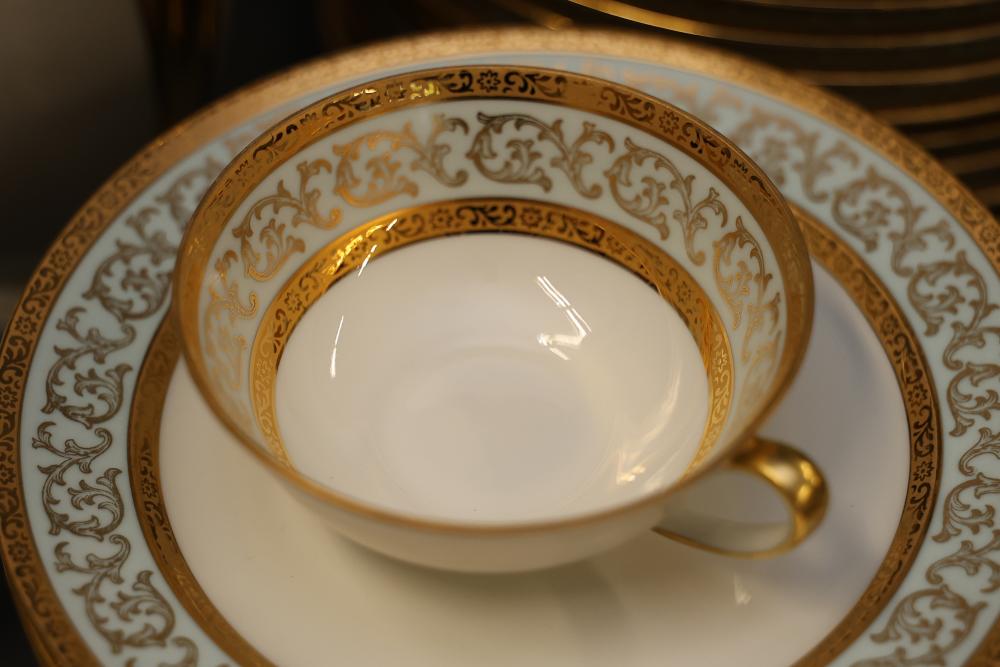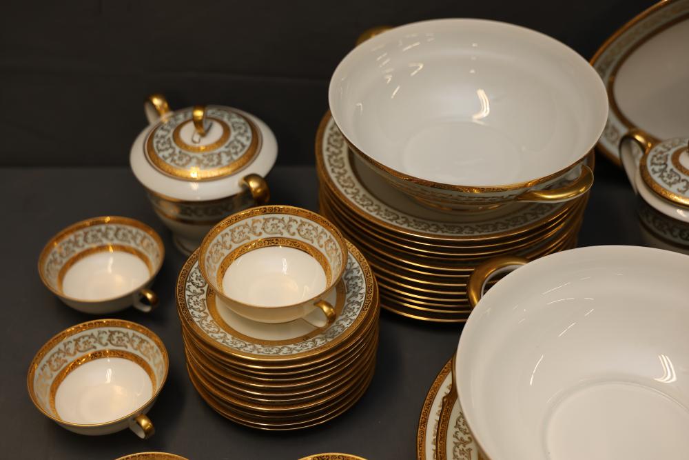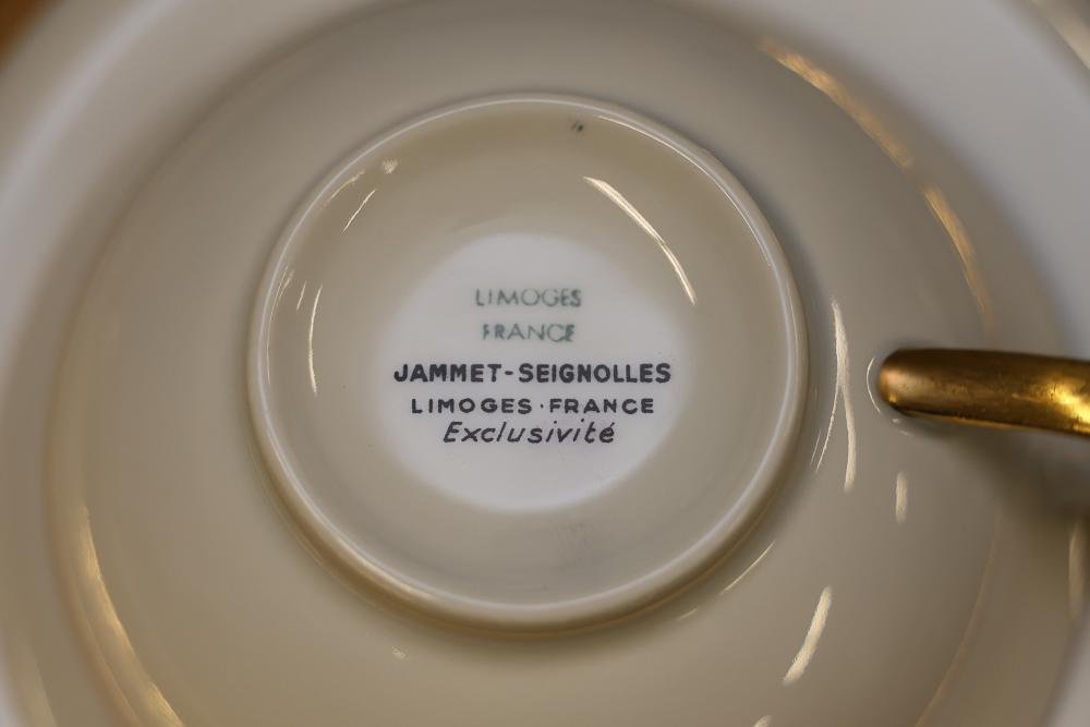 Jammet-Seignolles Limoges Exclusive White and Gold Porcelain Dinnerware Set. Includes plates, bowls, teacups with saucers, serving bowls, coffee pot, creamer, and sugar dish. Decorated with intricate gilt details and a patterned rim design. Marked 'Jammet-Seignolles Limoges-France Exclusive.' Includes storage case for plates. Pickup only.