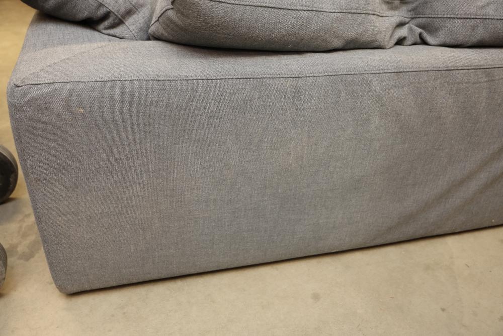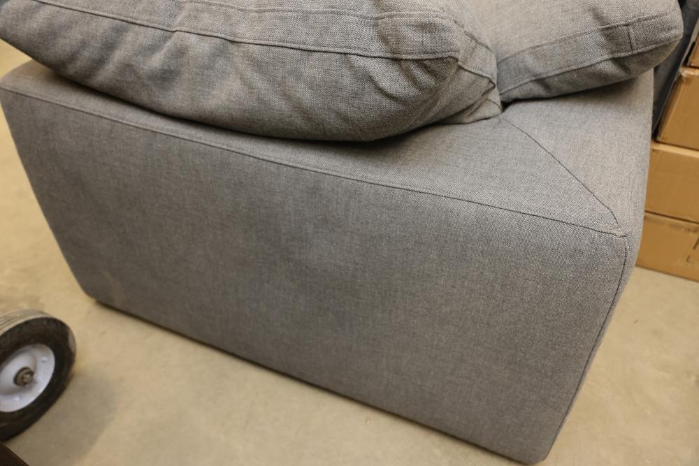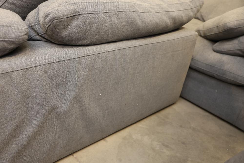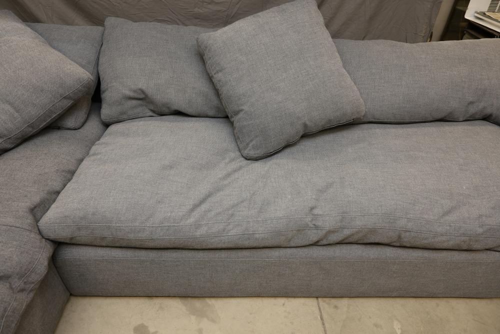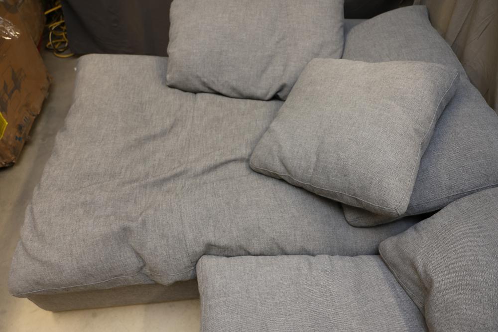 Gray Upholstered Sectional Sofa With Loose Cushions. This sectional sofa features a gray fabric upholstery, loose cushions, and modular design for versatile use. Ideal for comfortable seating and lounging. Section are 22" x 94" x 45" and 22" x 70" x 45". Pickup only.