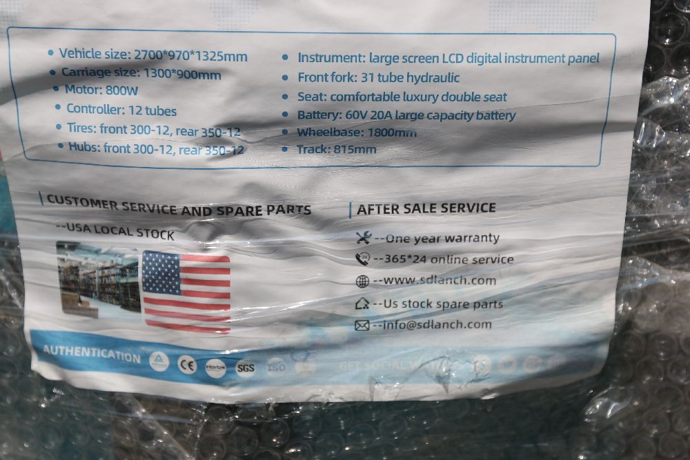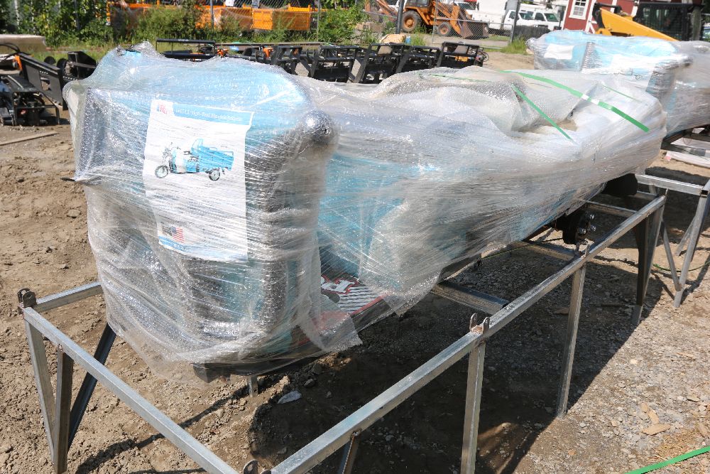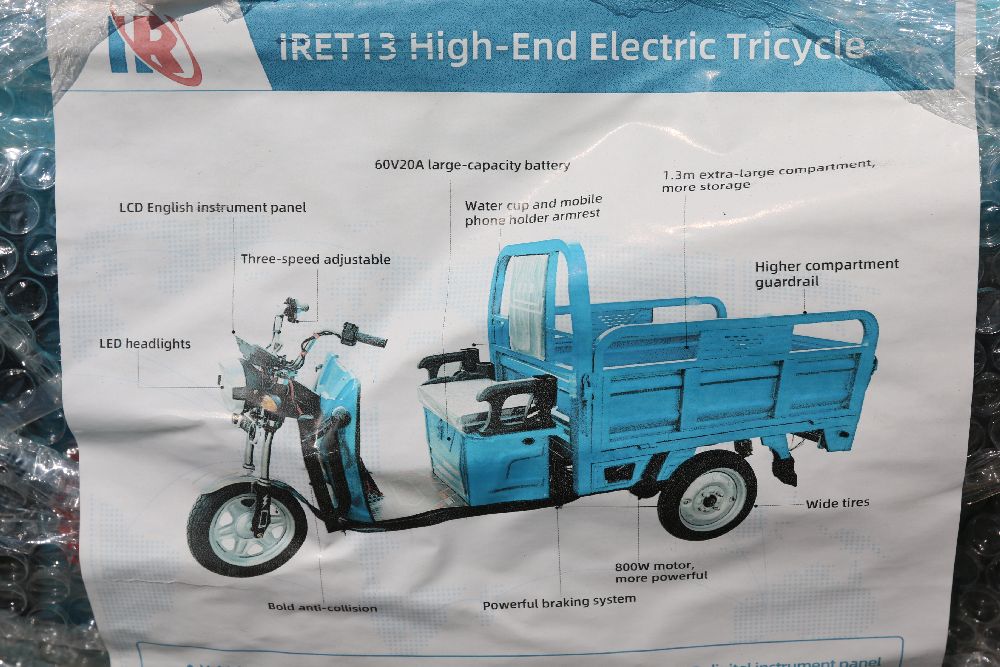 New 2025 Blue Electric Tricycle Model IRET13 with Dump Bed. Features an LCD instrument panel, LED headlight, rechargeable battery, three adjustable speeds, and an 800W motor. Comes with a movable guardrail dump bed, 60V 20Ah large-capacity battery, and hydraulic front fork. Disassembled and appears complete. Pickup only.