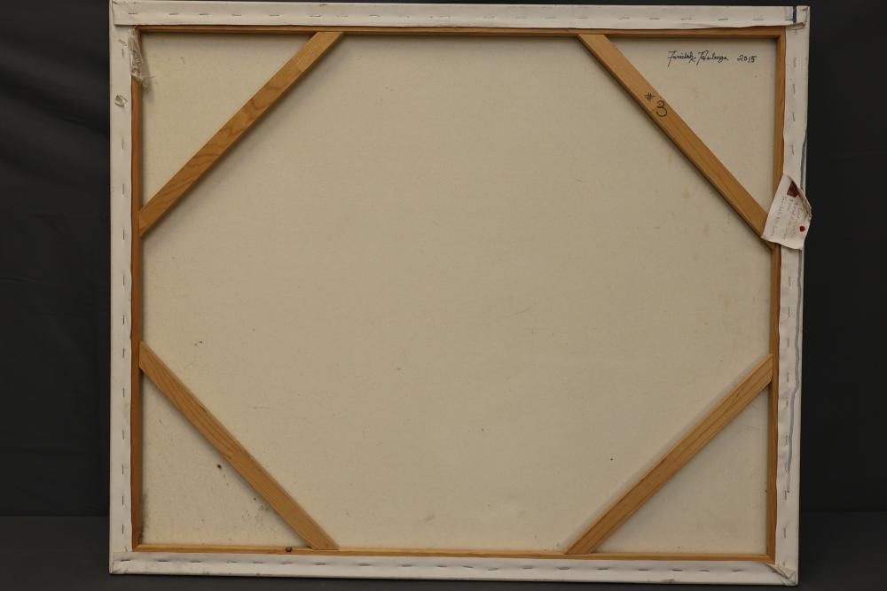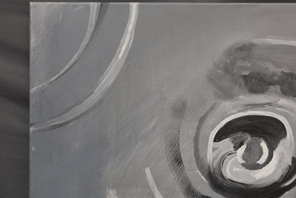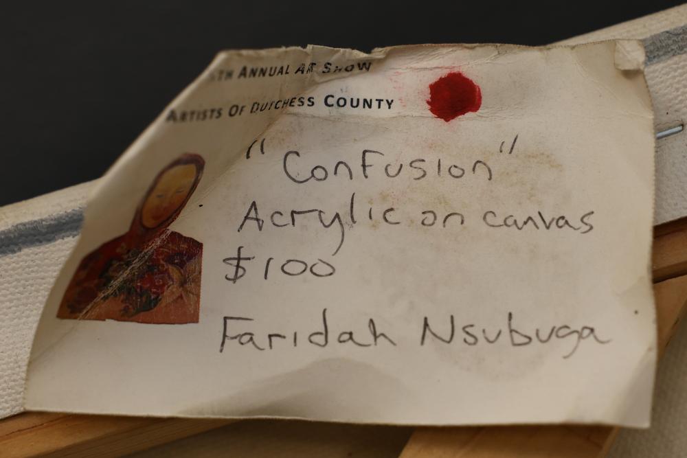 Faridah Nsubuga 2015 'Confusion' Acrylic on Canvas Painting. Abstract composition featuring concentric swirling forms in shades of black, white, and gray. Signed and dated on the back of the canvas. Canvas is stretched over a wooden frame. Minor wear visible on edges. Pickup only.