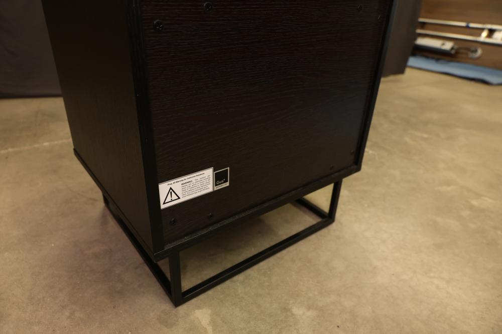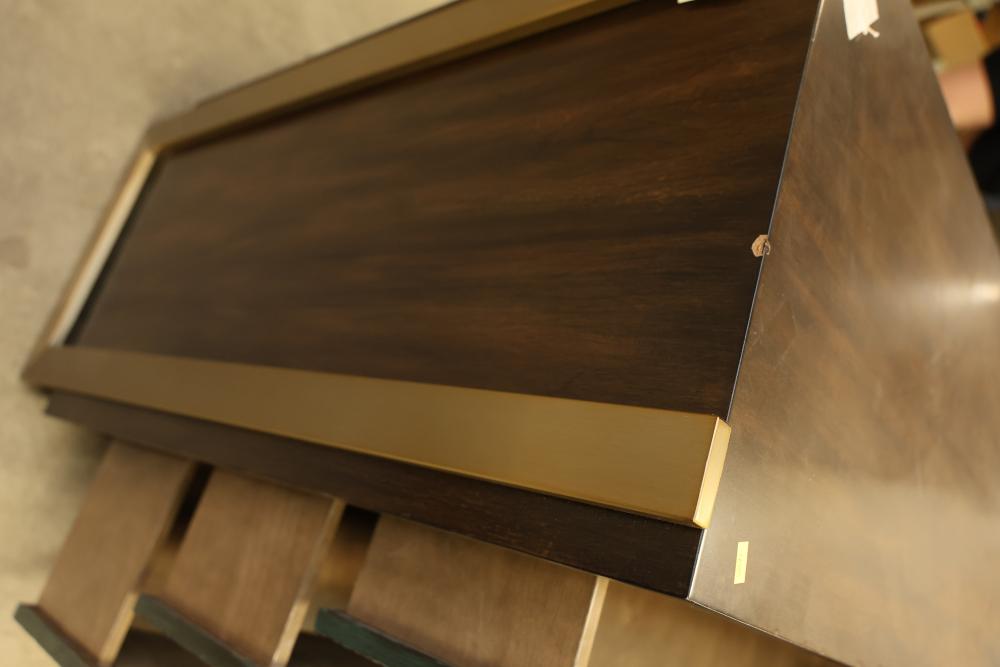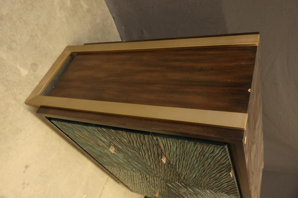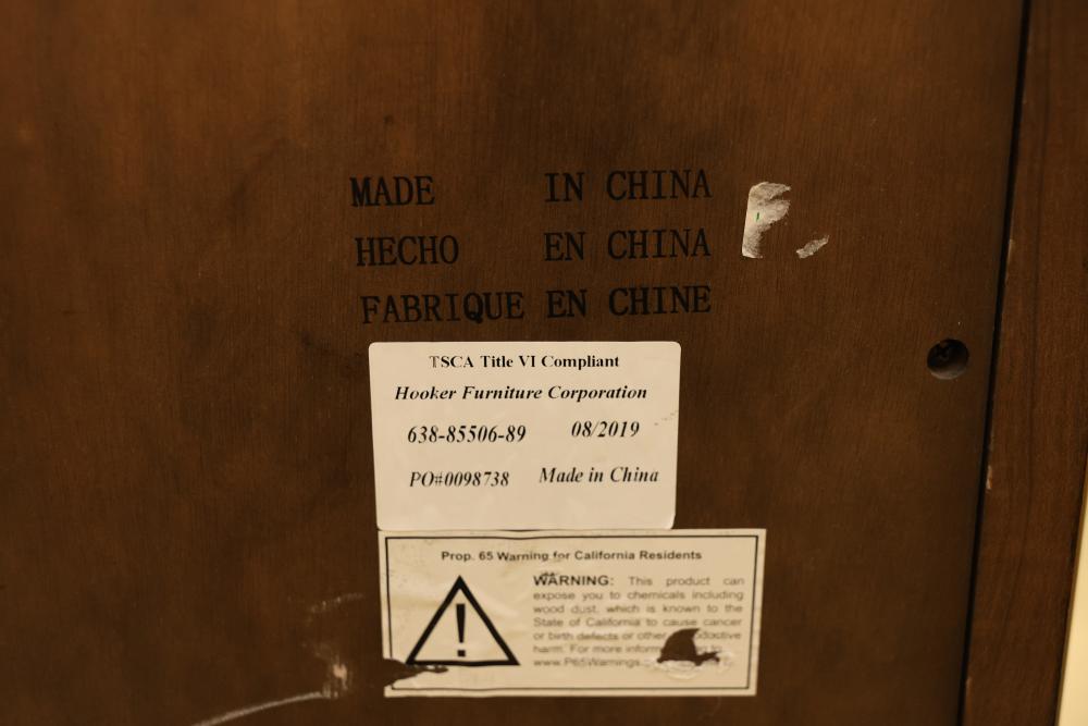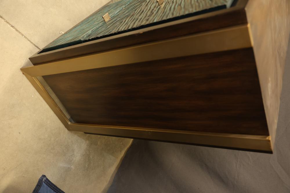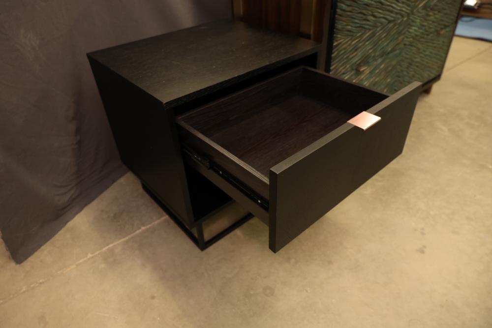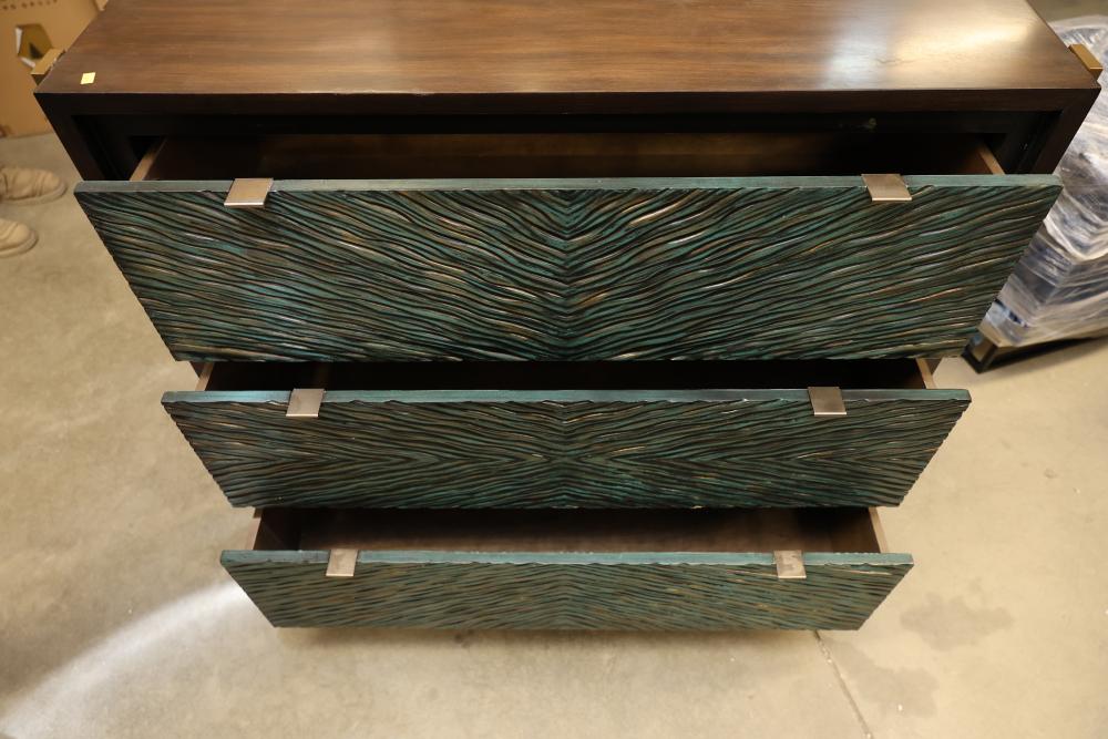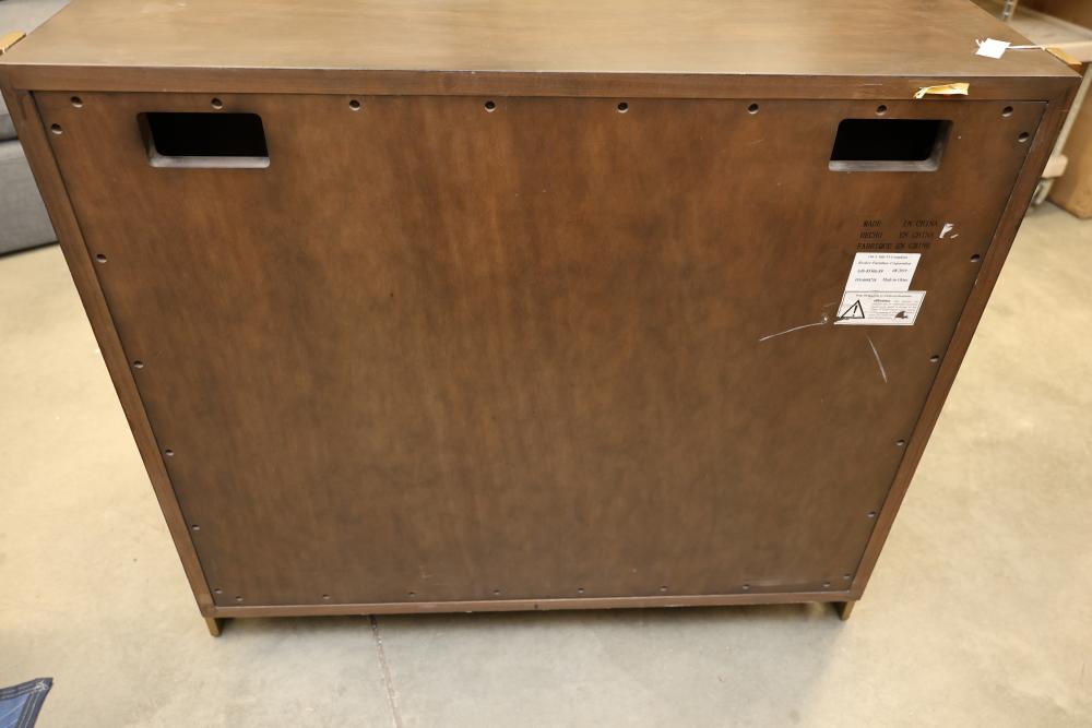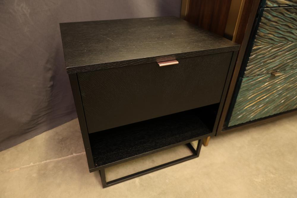 Hooker Furniture Wooden Nightstand and Chest with Drawers. The nightstand features a single drawer and open shelf space with a minimalist base. The chest includes four drawers with textured front panels and accented wooden and metal trim. Both pieces are sturdy and suitable for storage needs. Dresser - 38" x 41.5" x 17" and nightstand - 22" x 21" x 18". Pickup only.