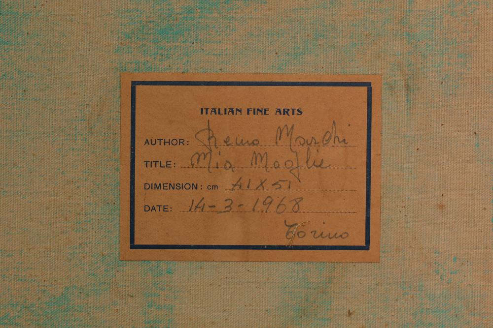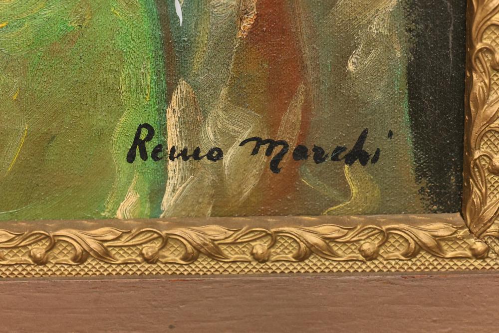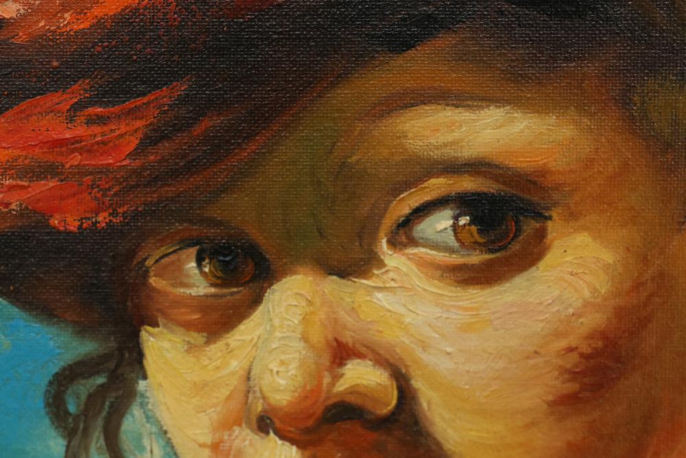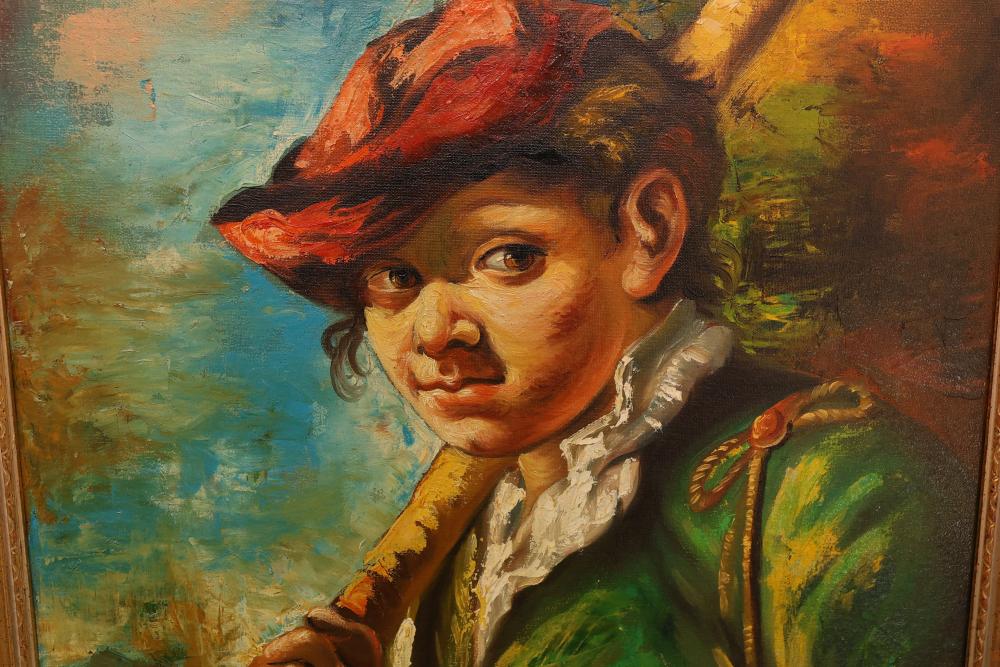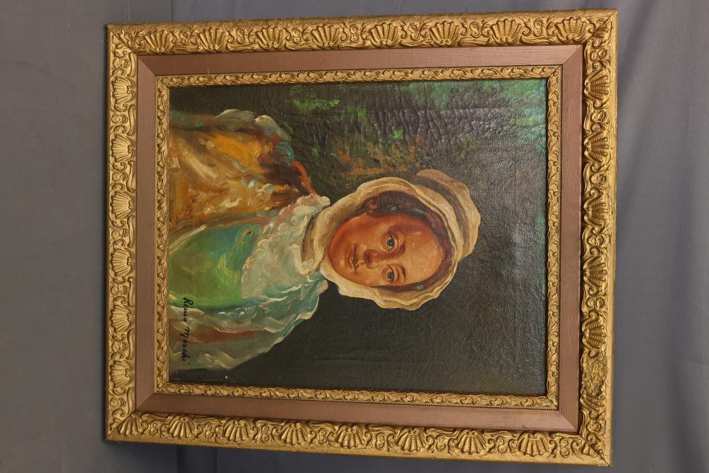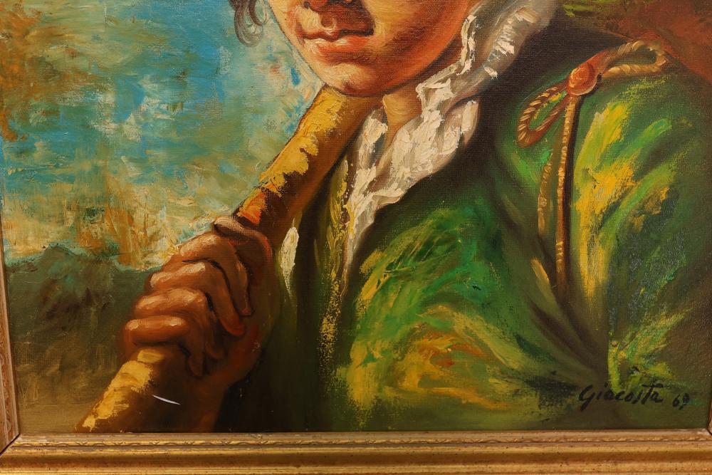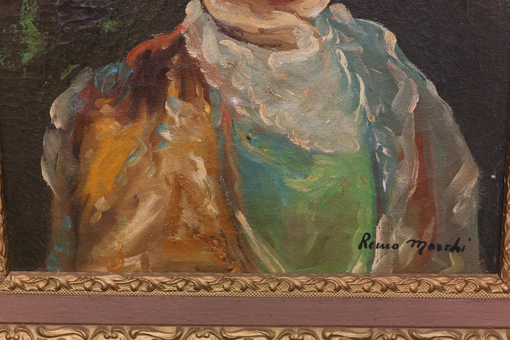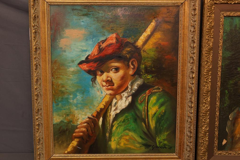 Two Framed Oil Paintings by Giocasta and Marchi. The first painting signed Giocasta with a date of 1969 and depicts a youthful character with a red hat. The second painting signed Marchi with a date of 1968 and portrays a refined lady in traditional attire. Both paintings are framed and include authenticity labels on the reverse. Largest 27"x23.5". Pickup only.