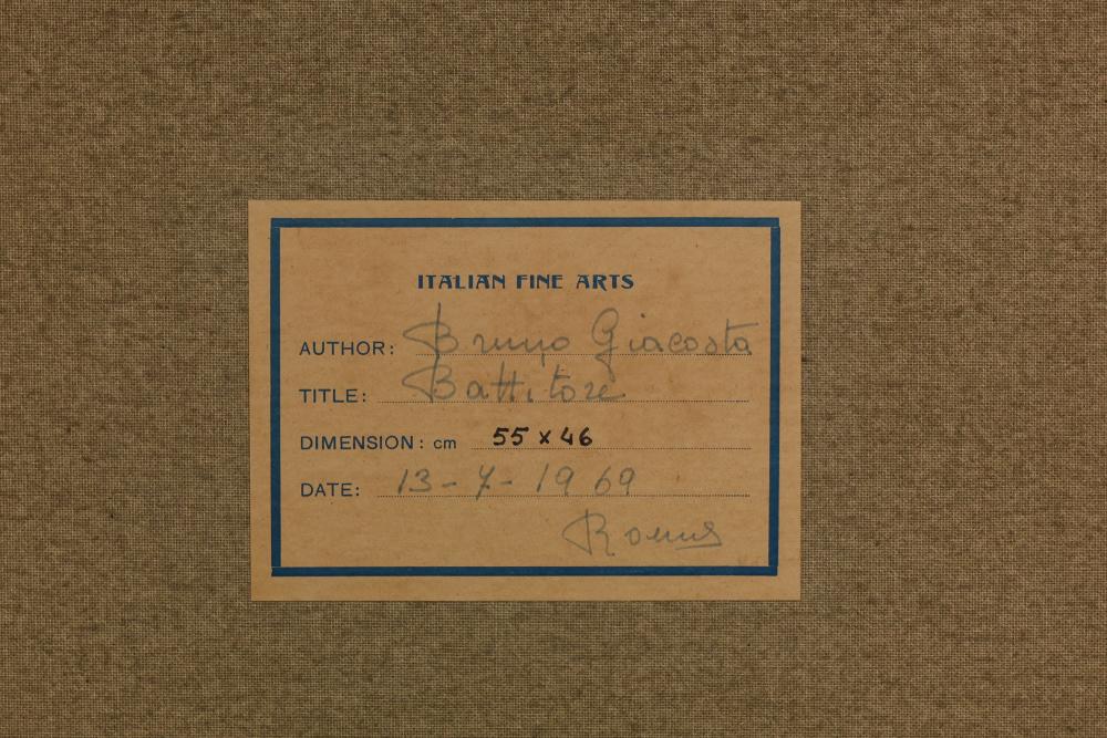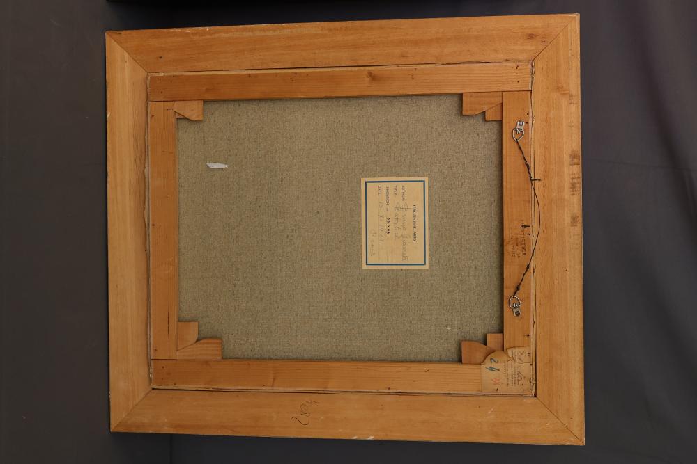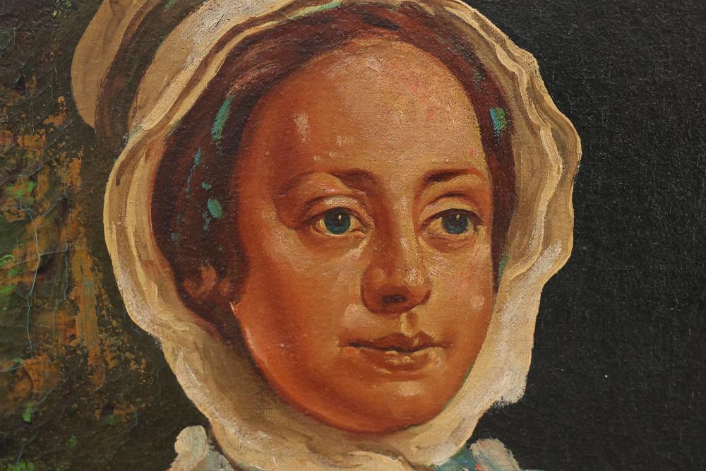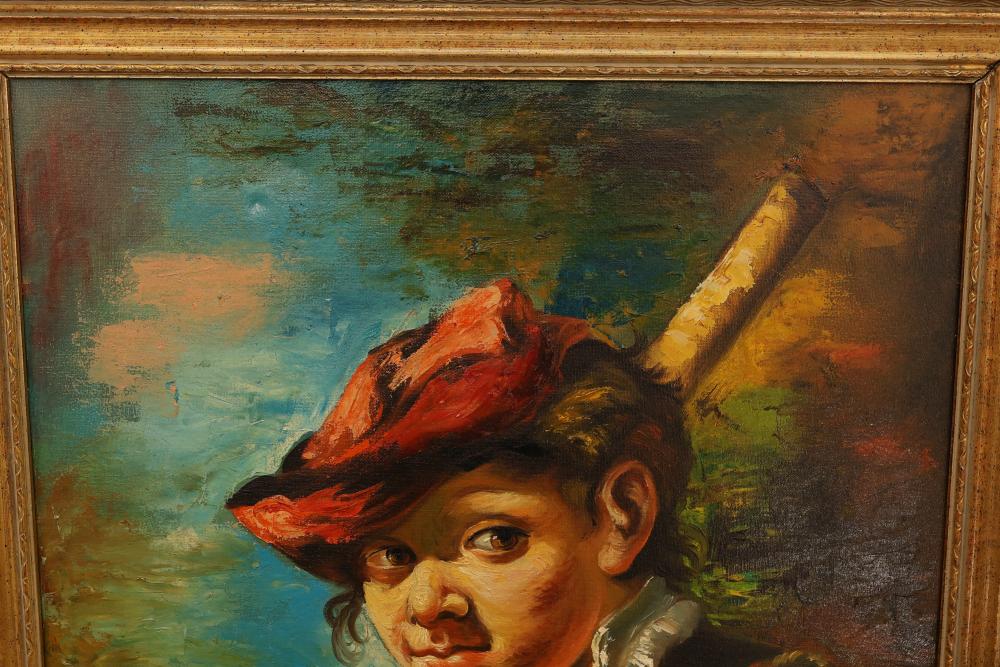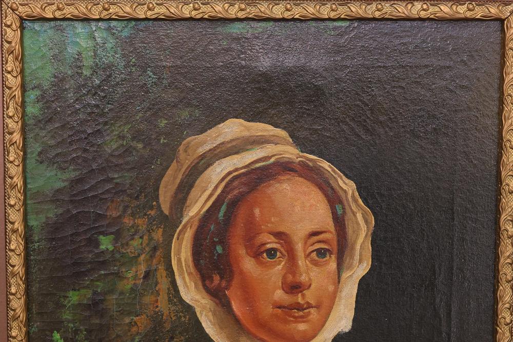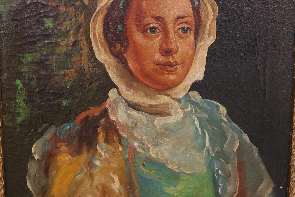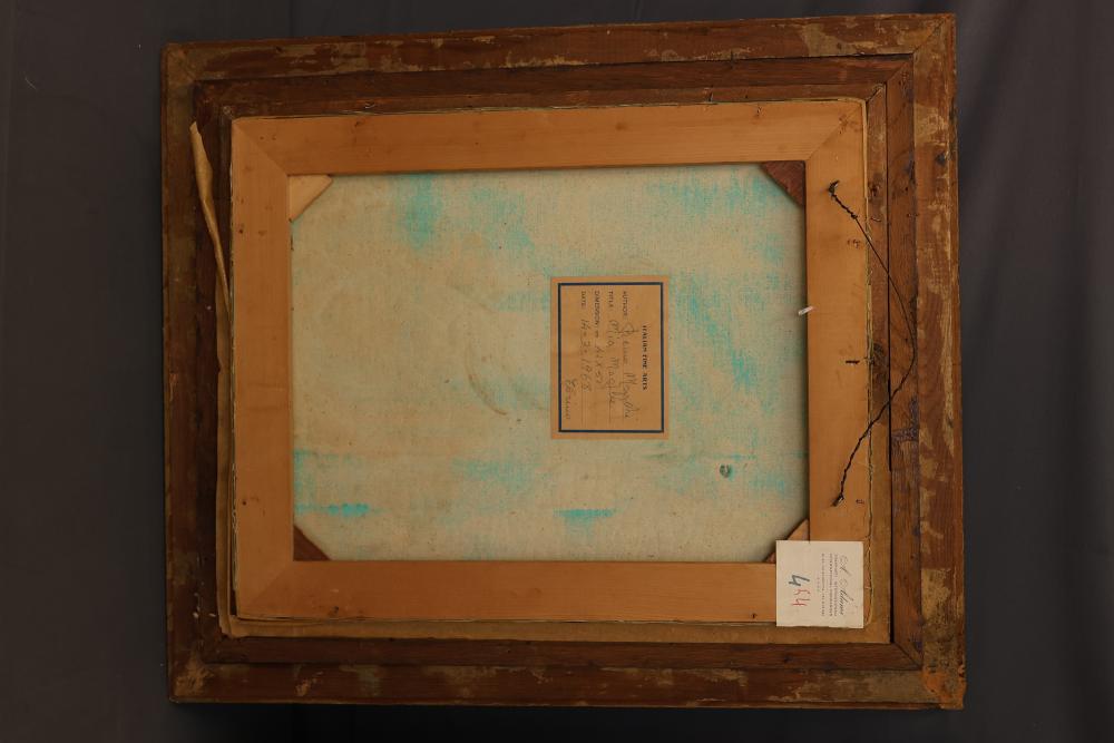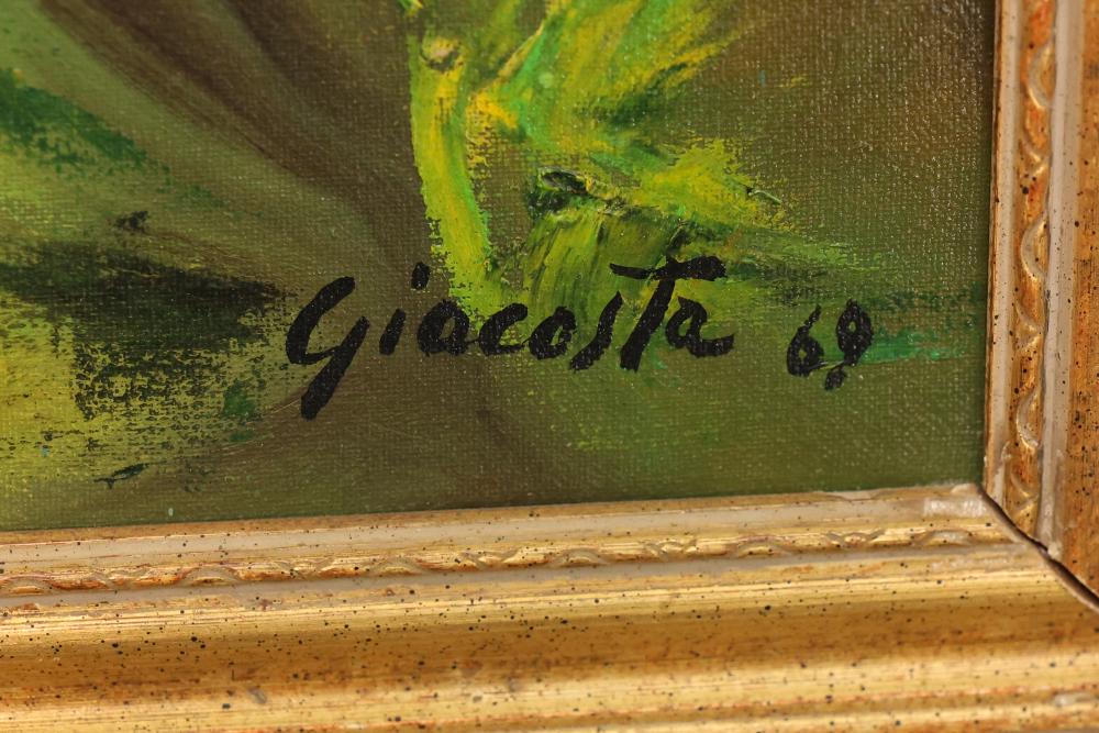 Two Framed Oil Paintings by Giocasta and Marchi. The first painting signed Giocasta with a date of 1969 and depicts a youthful character with a red hat. The second painting signed Marchi with a date of 1968 and portrays a refined lady in traditional attire. Both paintings are framed and include authenticity labels on the reverse. Largest 27"x23.5". Pickup only.