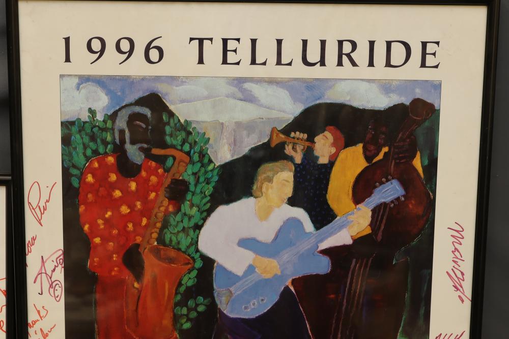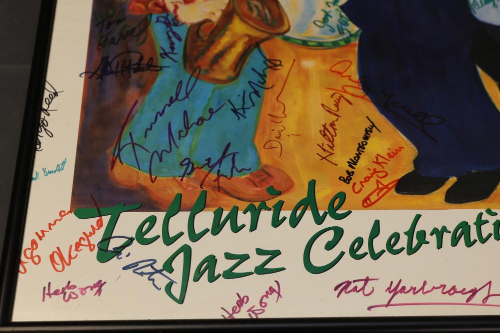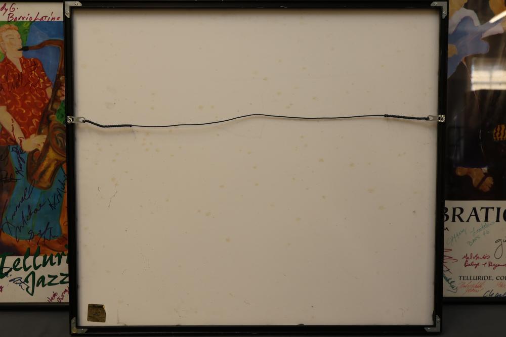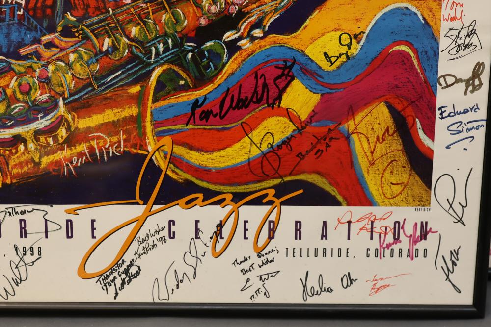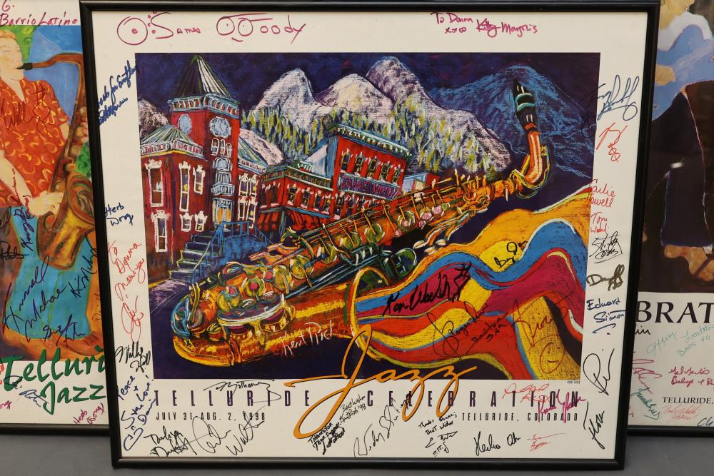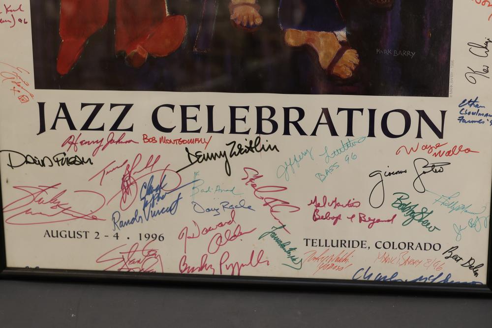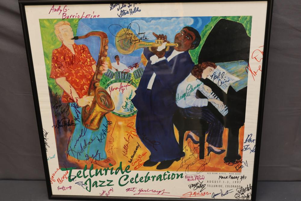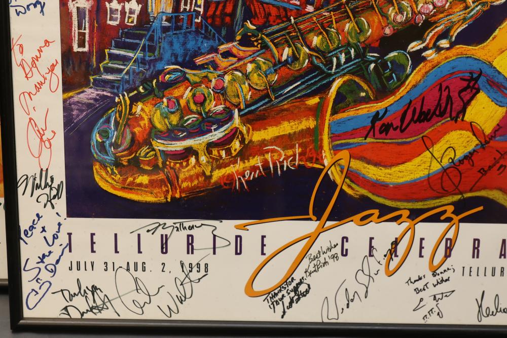 Three Signed Telluride Jazz Celebration Posters from 1996-1998 featuring colorful artwork by Mark Barry and Kent Pickett. Each poster is hand-signed by multiple individuals, likely associated with the event. Posters are framed and showcase event details, including dates and location in Telluride, Colorado. Largest is 36.5"x24.5". Pickup only.