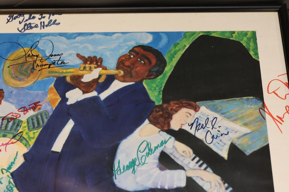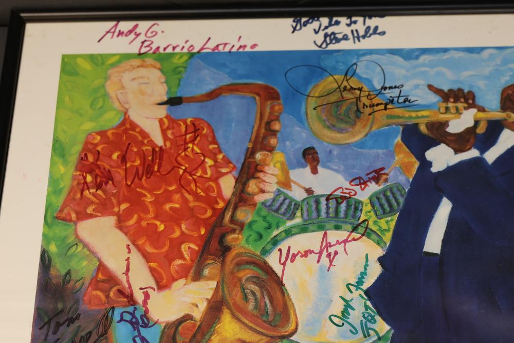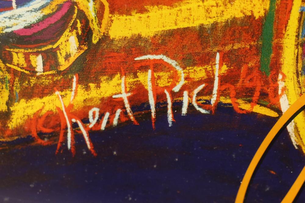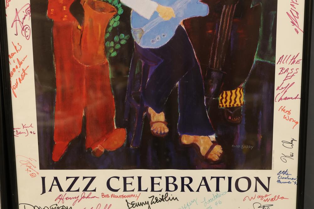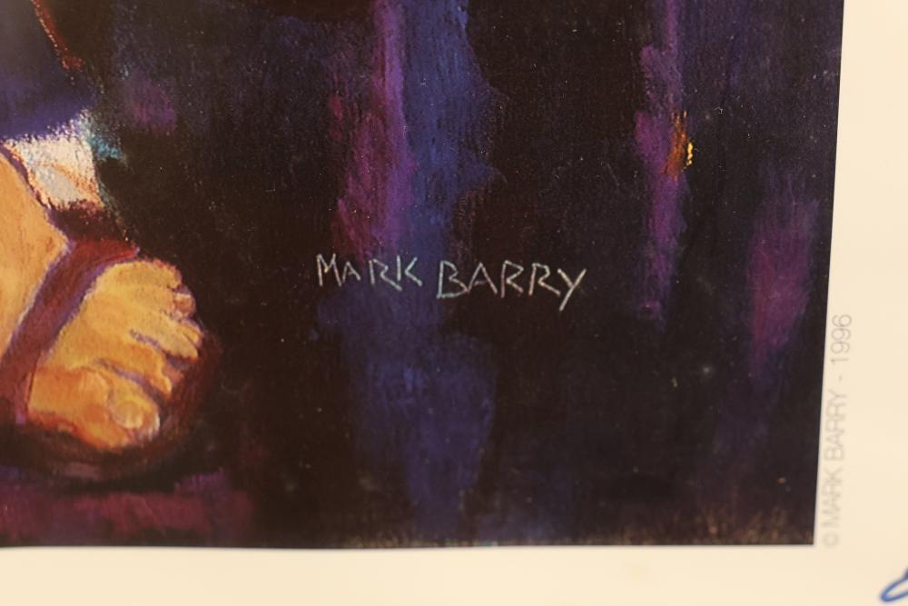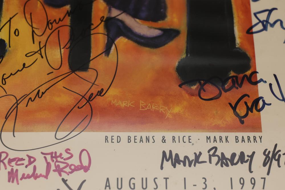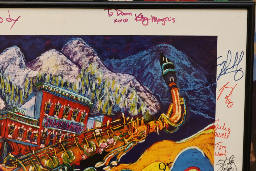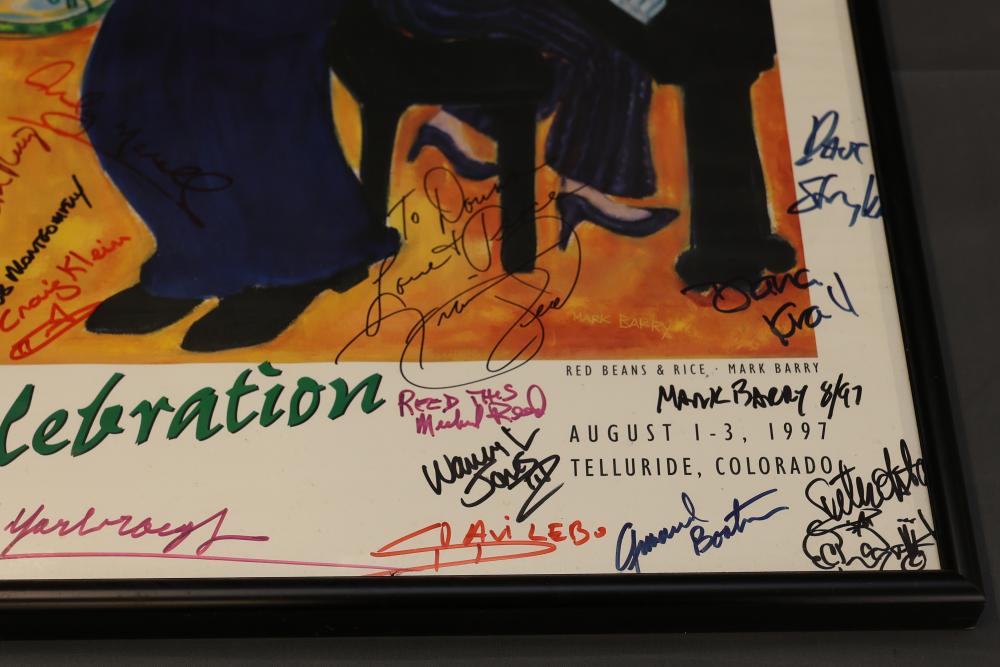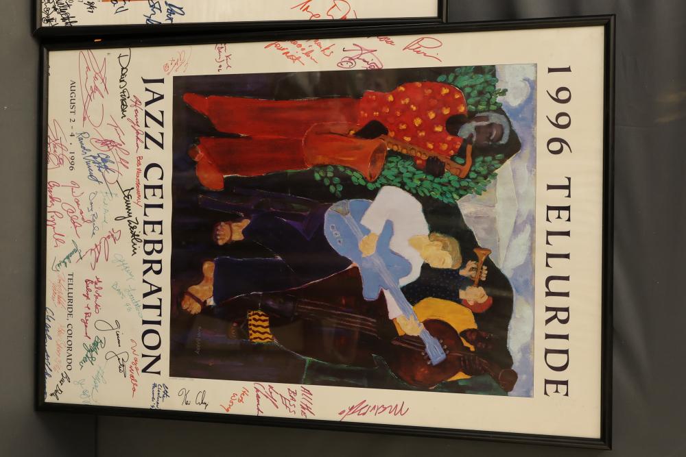 Three Signed Telluride Jazz Celebration Posters from 1996-1998 featuring colorful artwork by Mark Barry and Kent Pickett. Each poster is hand-signed by multiple individuals, likely associated with the event. Posters are framed and showcase event details, including dates and location in Telluride, Colorado. Largest is 36.5"x24.5". Pickup only.