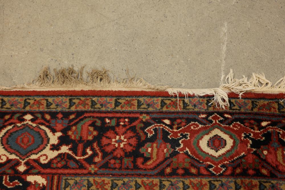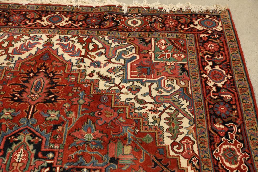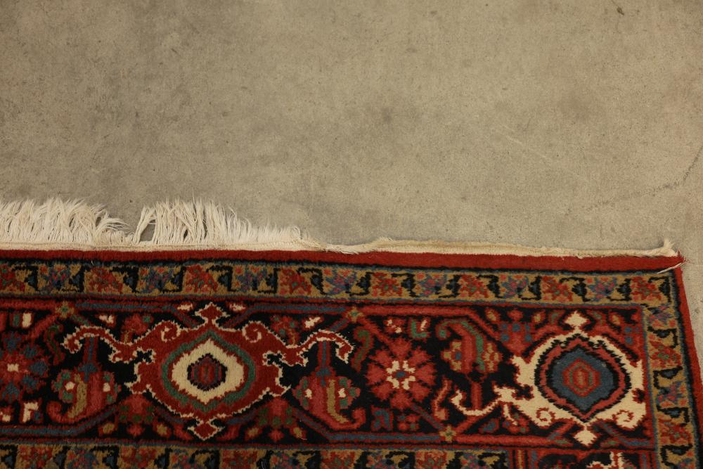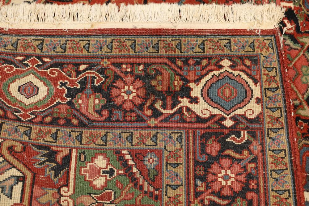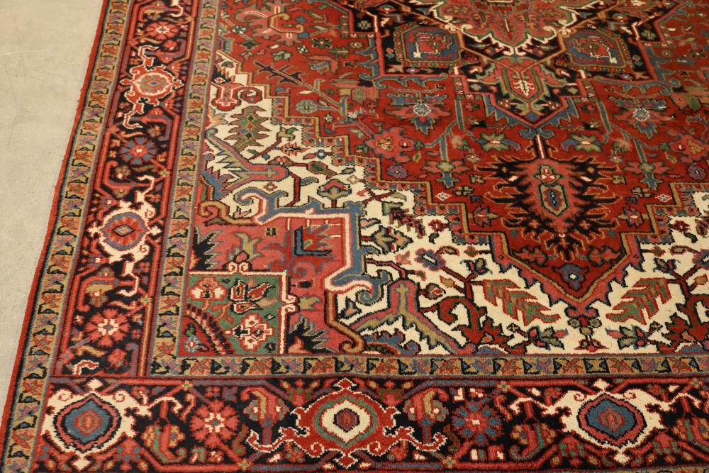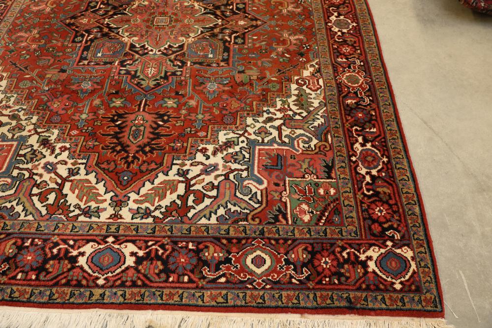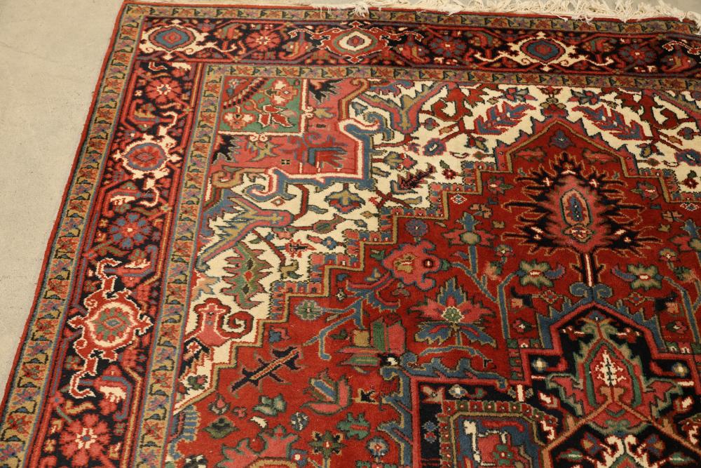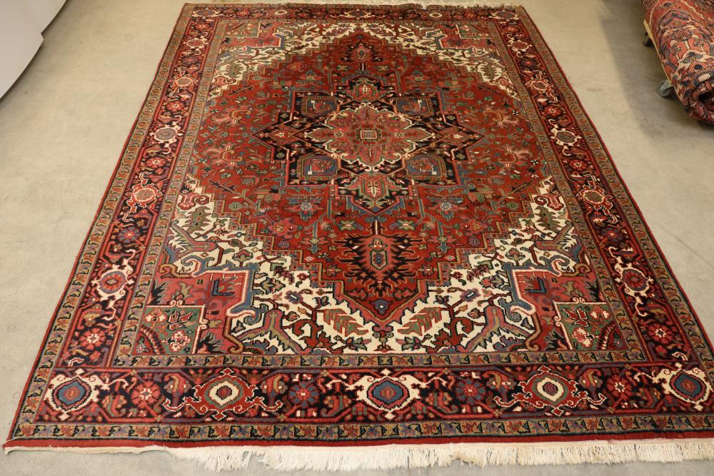 Handwoven Wool Rug with Geometric and Floral Patterns. Features a red and ivory color scheme with intricate geometric and floral designs throughout. The rug includes a detailed central medallion and a wide decorative border. Shows signs of wear, including fraying at the edges. 125"x100". Pickup only.