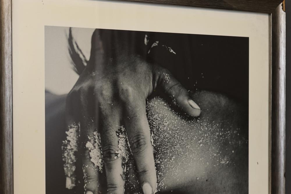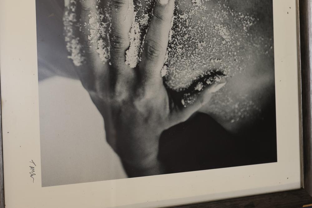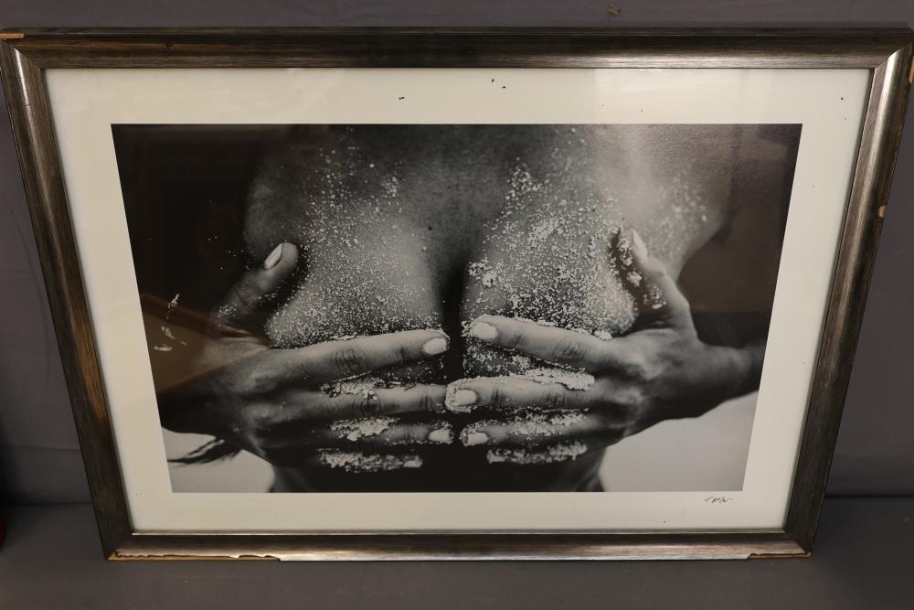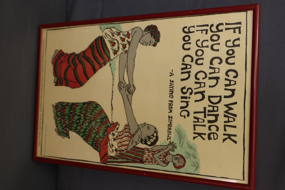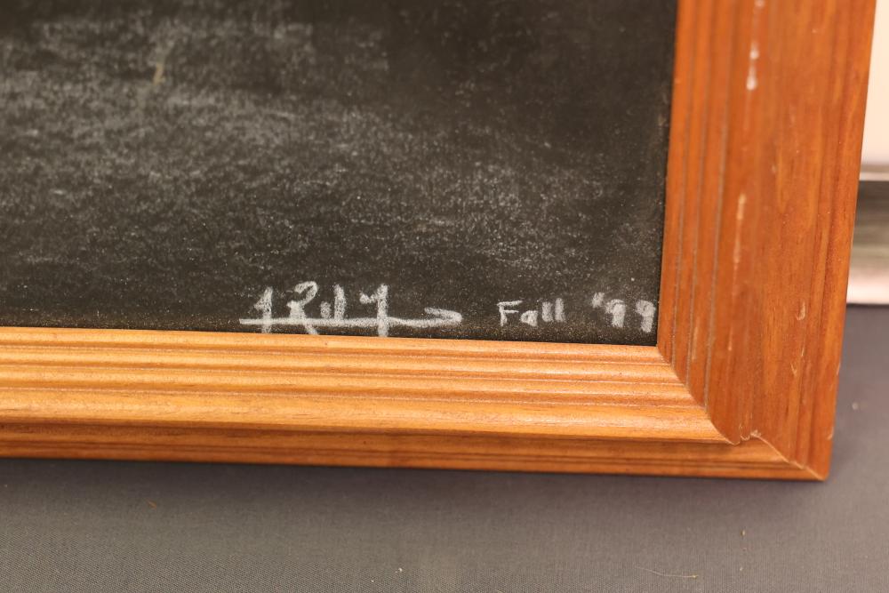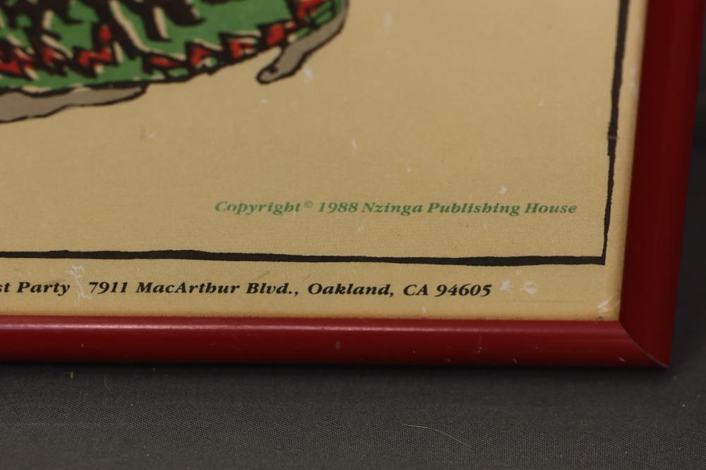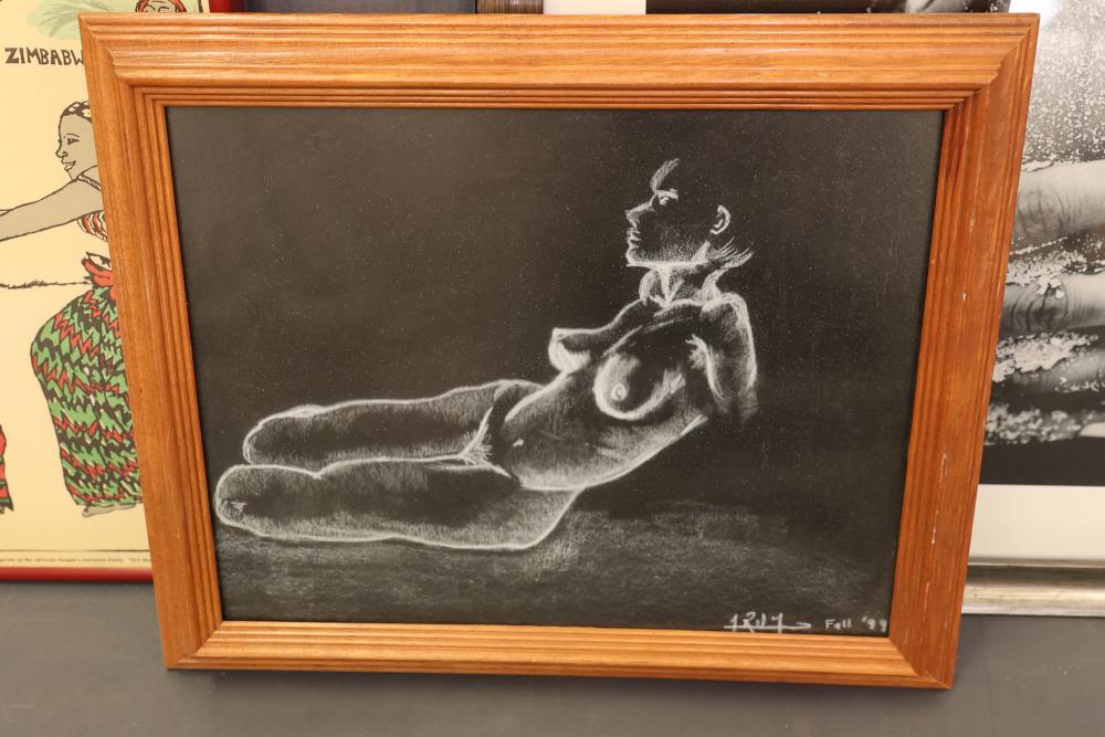 Three framed artworks featuring photography, African saying artwork, and a chalk drawing. Includes a black-and-white photographic print signed by T. McClure, an artwork featuring an African saying published by Nzinga Publishing House in 1988, and a signed chalk drawing dated Fall "98. Pickup only.