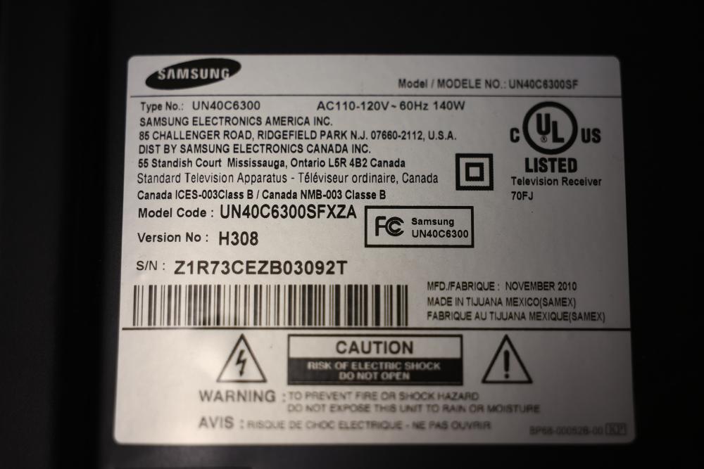 Samsung UN40C6300SF 40-Inch Full HD LED TV with Remote. Features 1080p full HD resolution, multiple HDMI ports, Dolby Digital Plus audio, and DTS support. Includes remote control. Pickup only.
