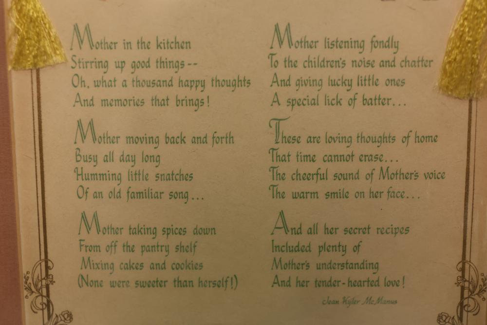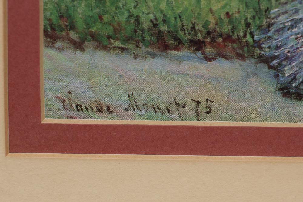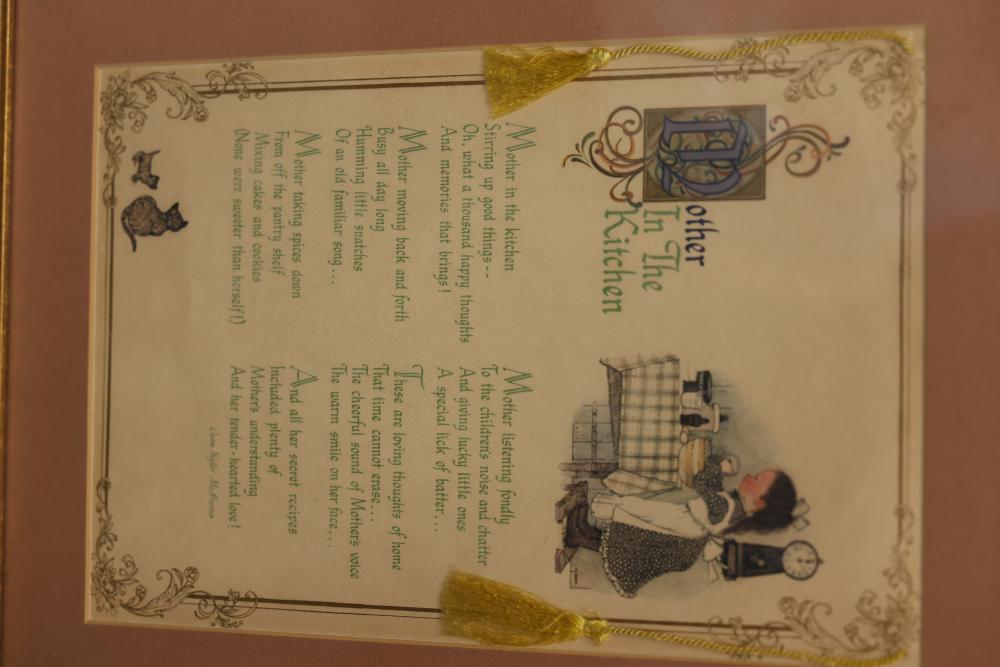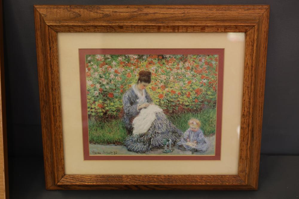 Framed Claude Monet print depicting a garden scene with a seated woman and child, signed in plate. Accompanied by a framed 'Mother in the Kitchen' poem with decorative details and tassels. Both pieces are set in wooden frames with hanging hardware affixed to the back. Pickup only.