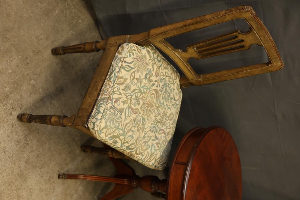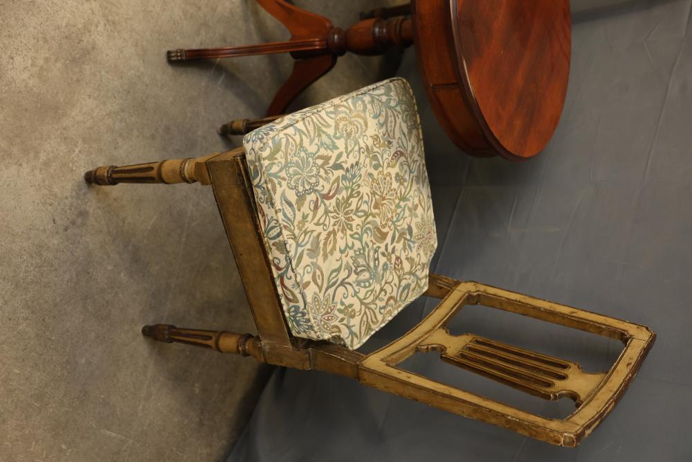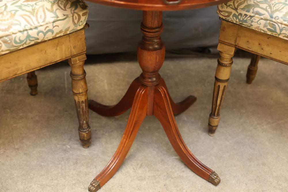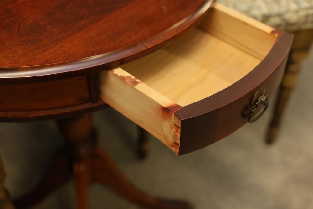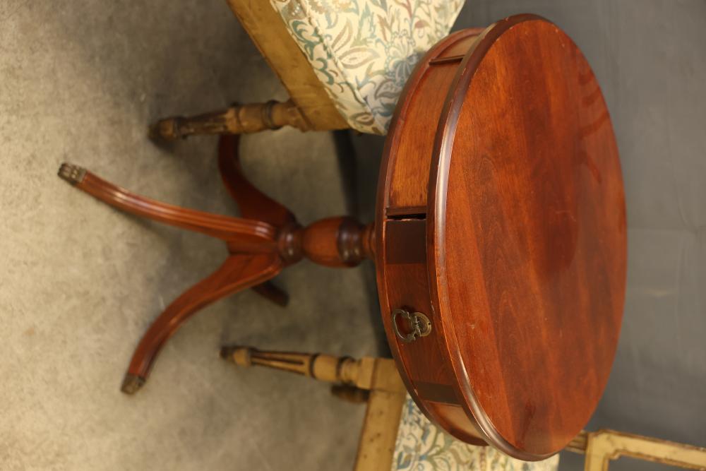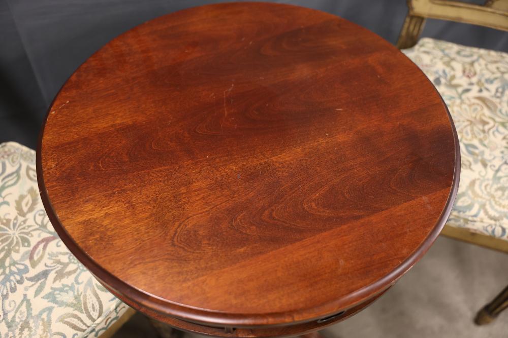 Wood Veneer Side Table with Three-Drawer Design and Two Spindle Back Chairs. This classically finished set features smooth a matching chairs with fabric seats and easily accessible drawer design, and detailed legs. Table is 21" dia x 26"T. Pickup only.