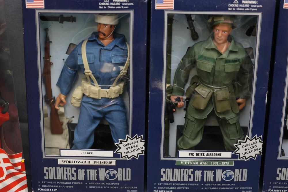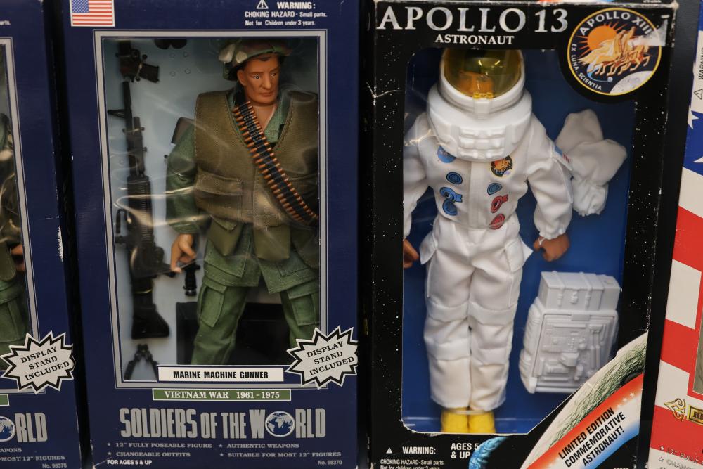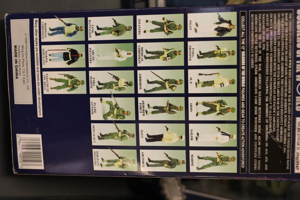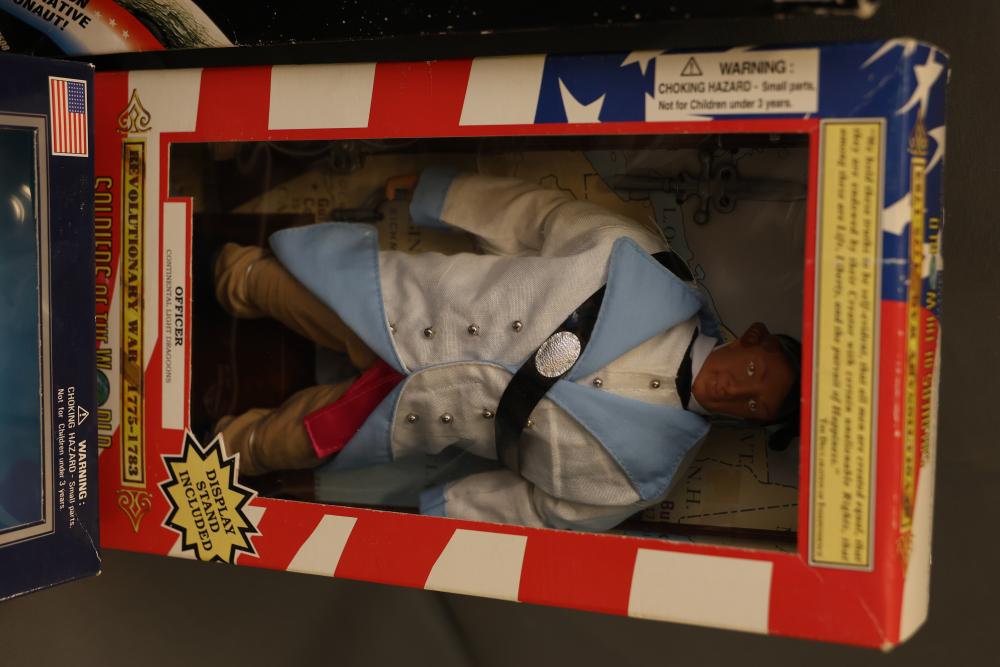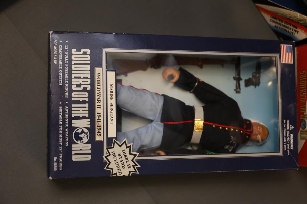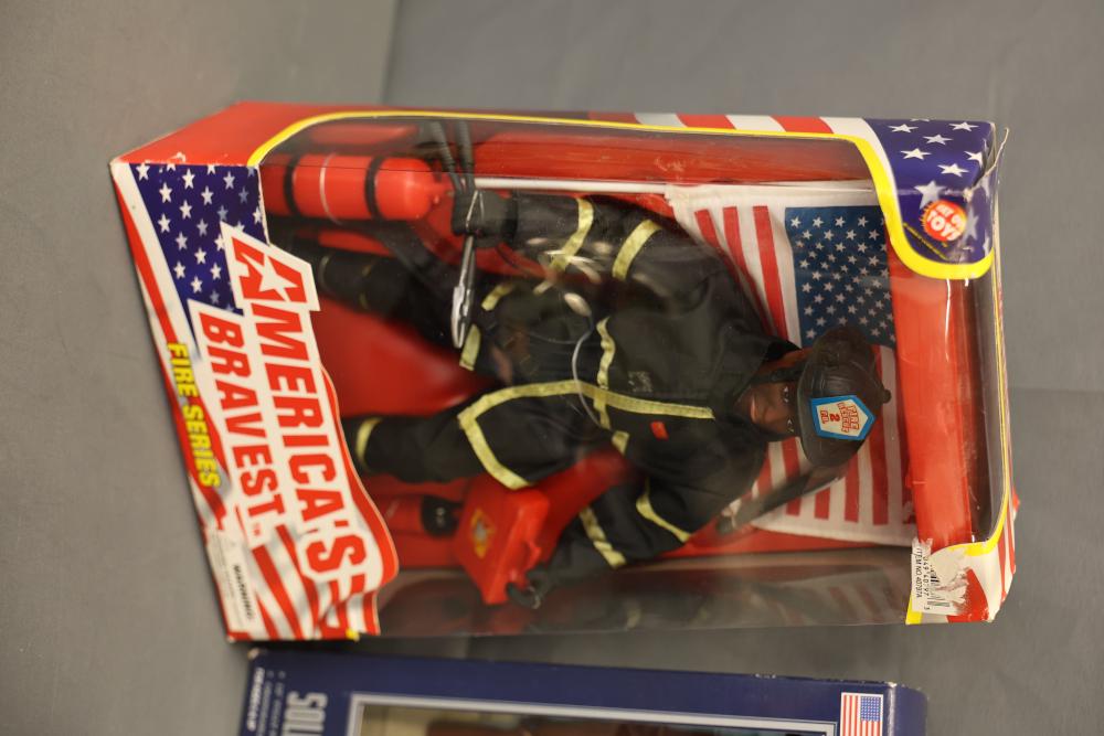Eight action figures with military, space, and firefighter themes in original packaging. Includes Soldiers of the World figures from various wars, an Apollo 13 astronaut figure, and an America"s Bravest firefighter figure. Each box includes the figure, accessories, and display stands as indicated on the packaging. Pickup only.