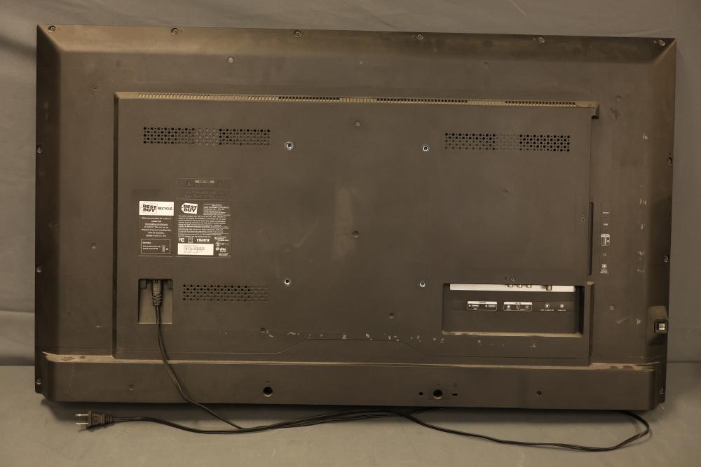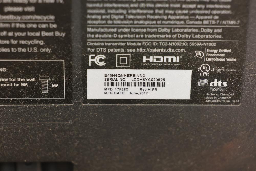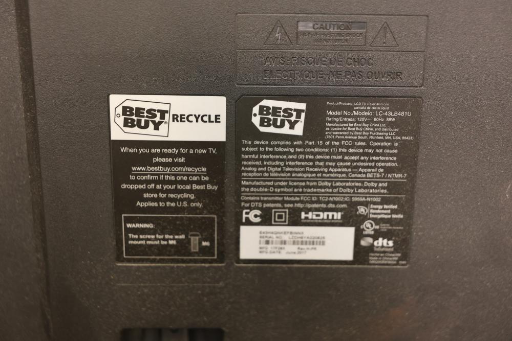 Sharp Roku TV Model LC-43LB481U with remote and power cord. Features a 43-inch screen, HDMI inputs, and Roku functionality for streaming services. Manufactured in June 2017. The unit powers on and displays the startup screen. Pickup only.