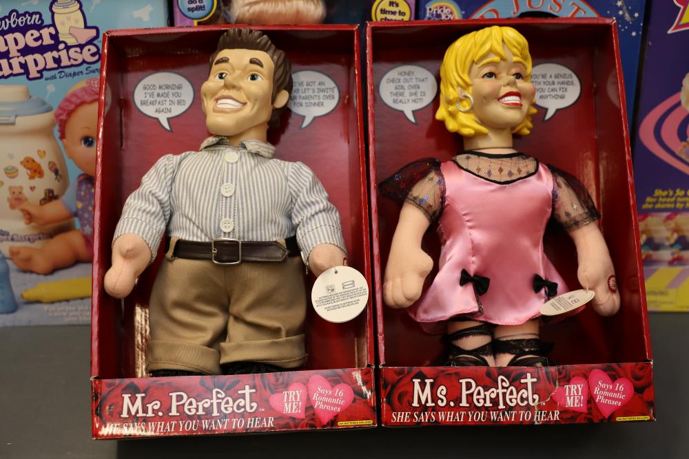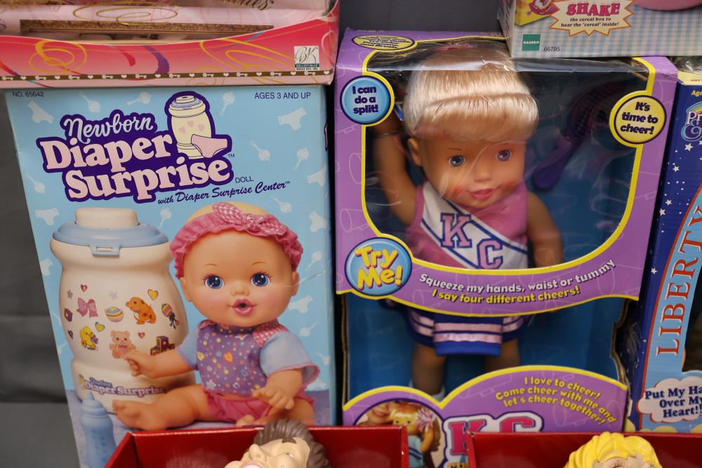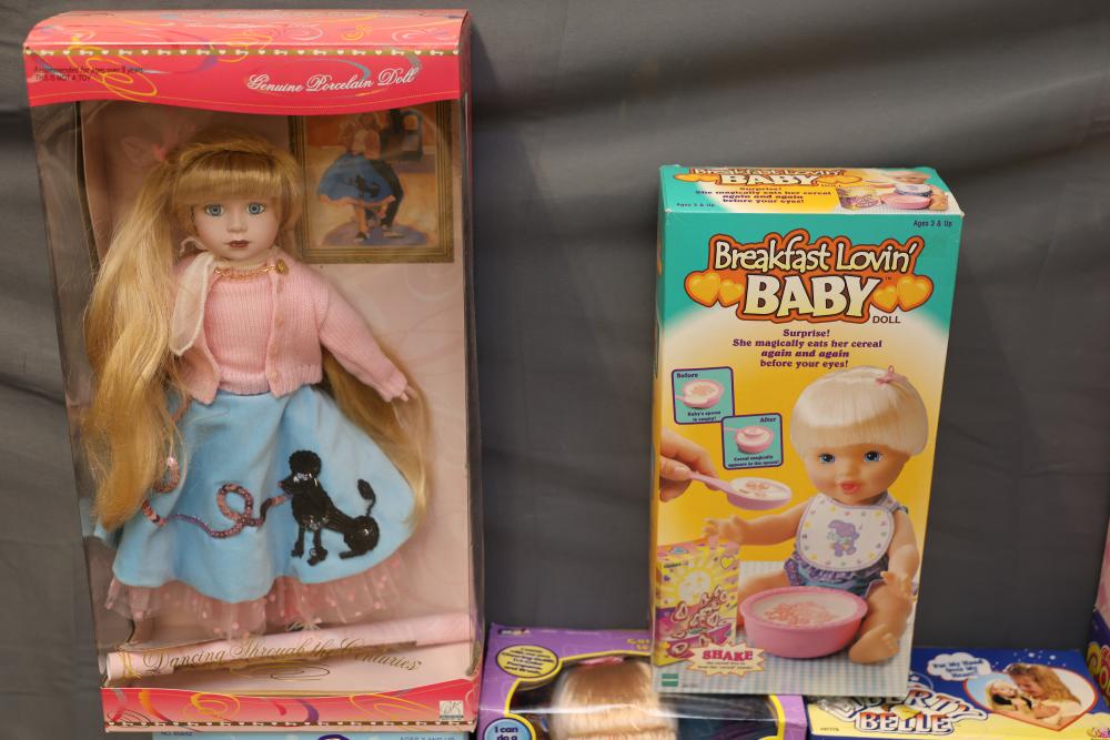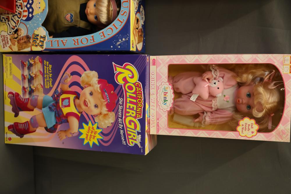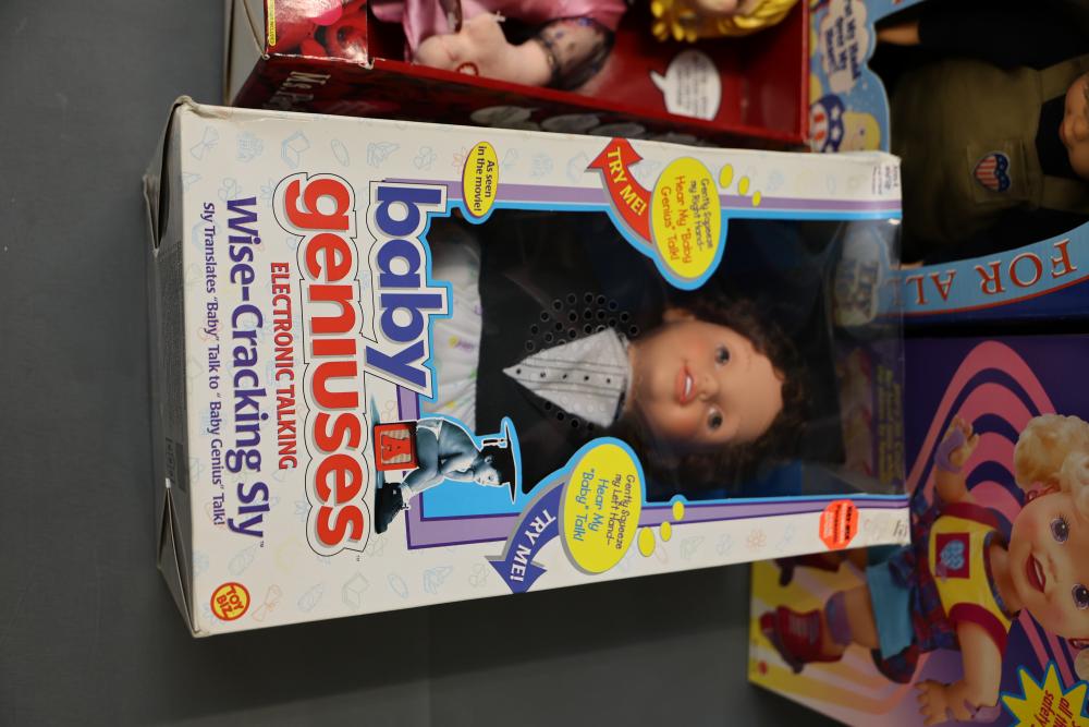 10 boxed dolls featuring various themes and interactive functions, including a Newborn Diaper Surprise doll, California RollerGirl, Baby Geniuses Wise-Cracking Sly, Mr. Perfect, Ms. Perfect, and more. Dolls are in original packaging with themed accessories or labels. Pickup only.