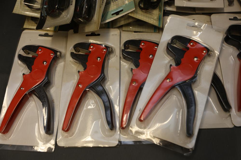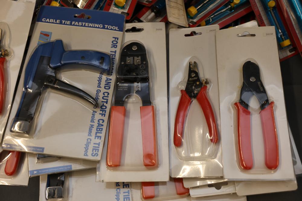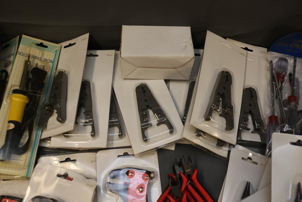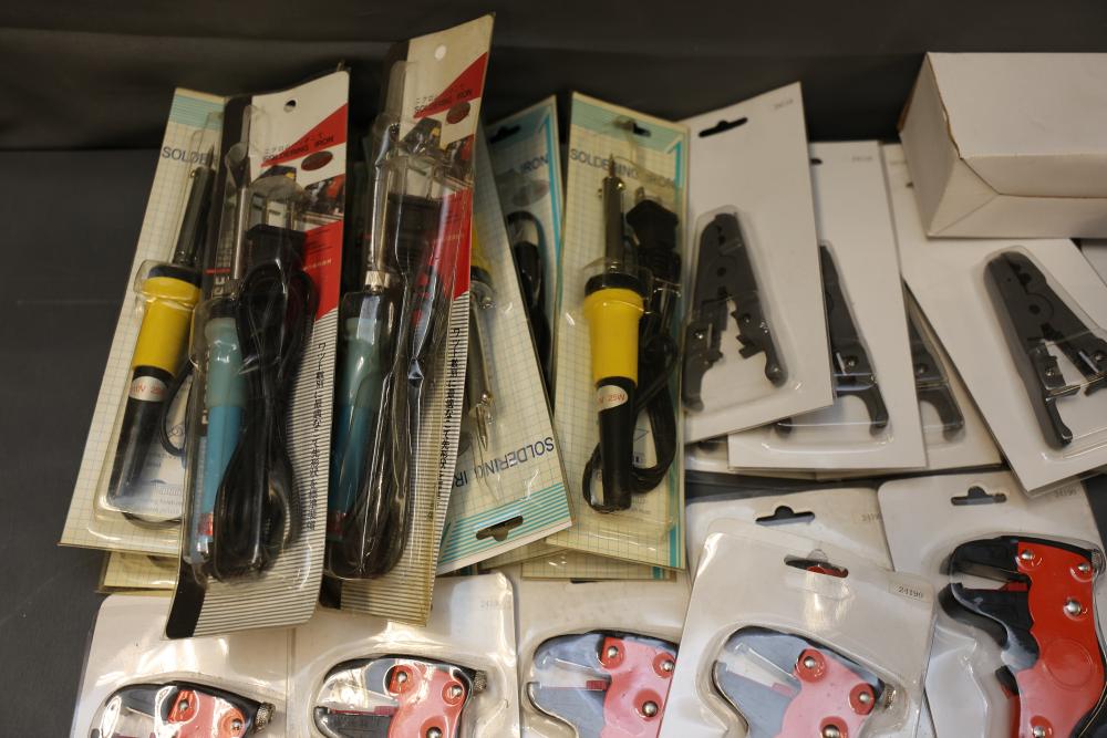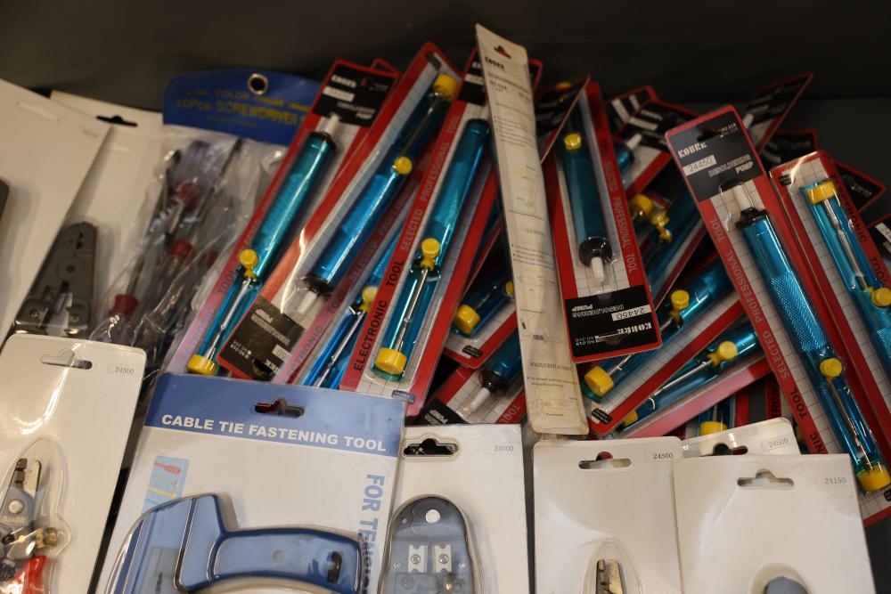 Hand tools including soldering irons, cable tie fastening tools, desoldering pumps, pliers, wire strippers, and screwdriver sets. Items are in original packaging with a variety of designs and specifications. Includes MaxBit soldering products and chrome vanadium screwdriver sets. Pickup only.
