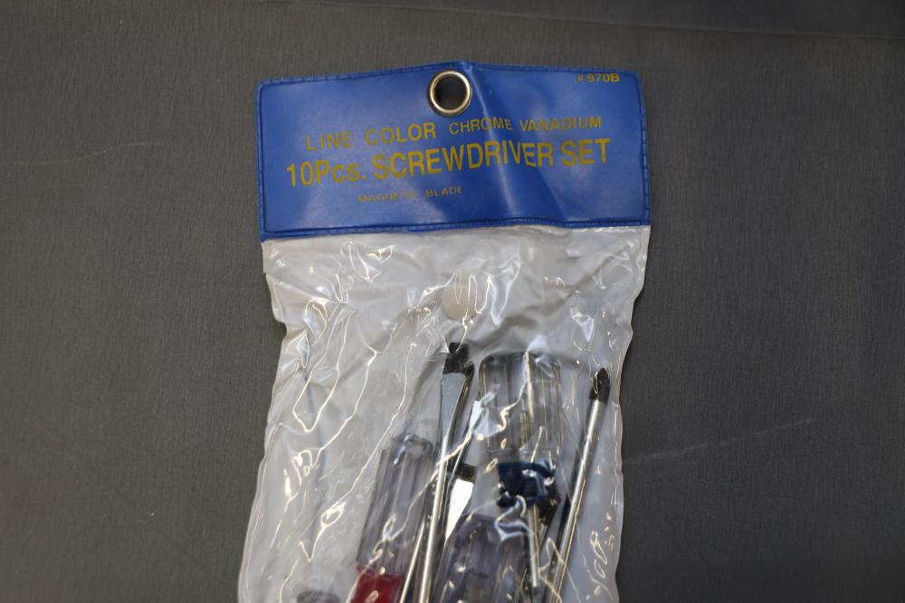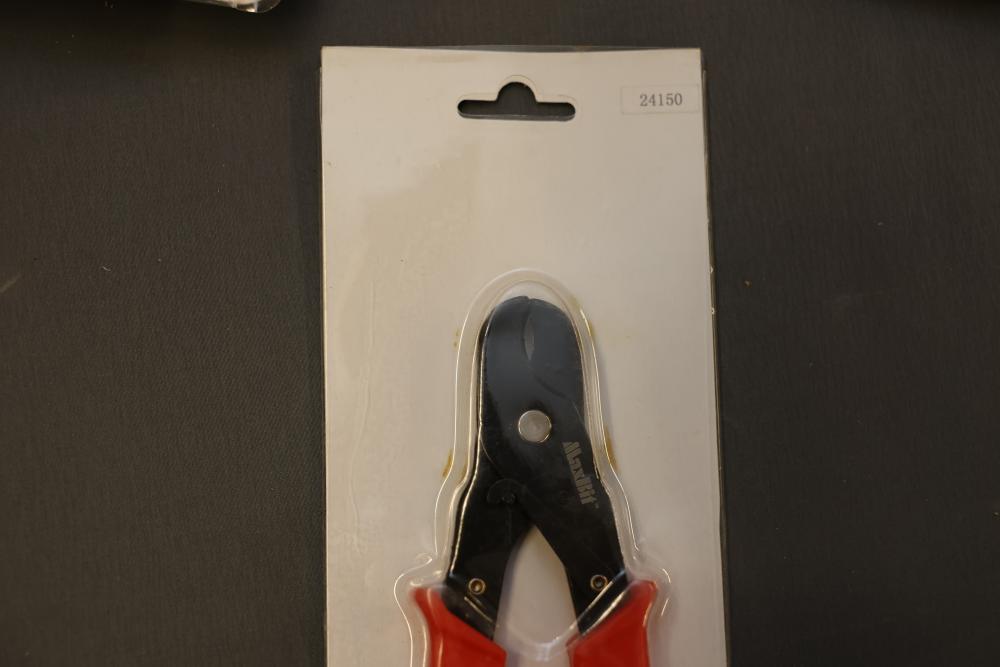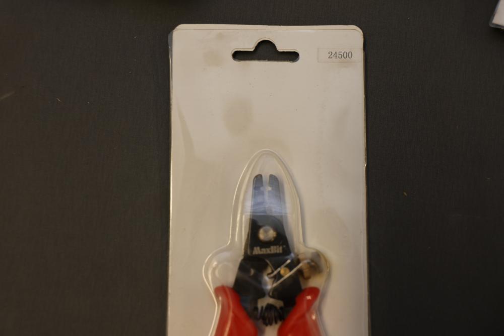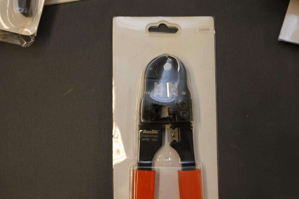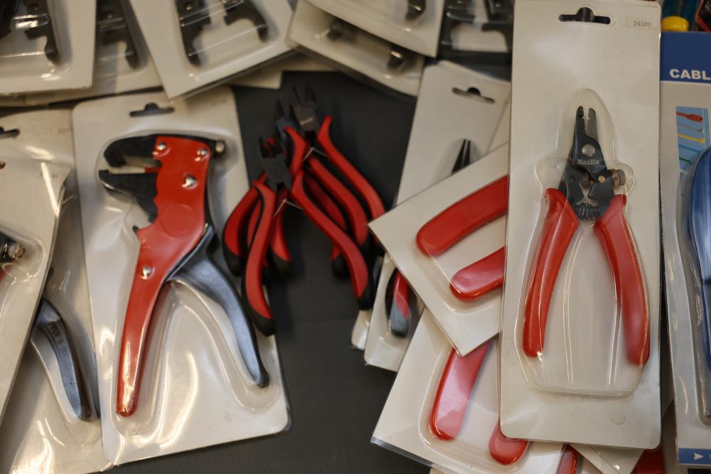 Hand tools including soldering irons, cable tie fastening tools, desoldering pumps, pliers, wire strippers, and screwdriver sets. Items are in original packaging with a variety of designs and specifications. Includes MaxBit soldering products and chrome vanadium screwdriver sets. Pickup only.
