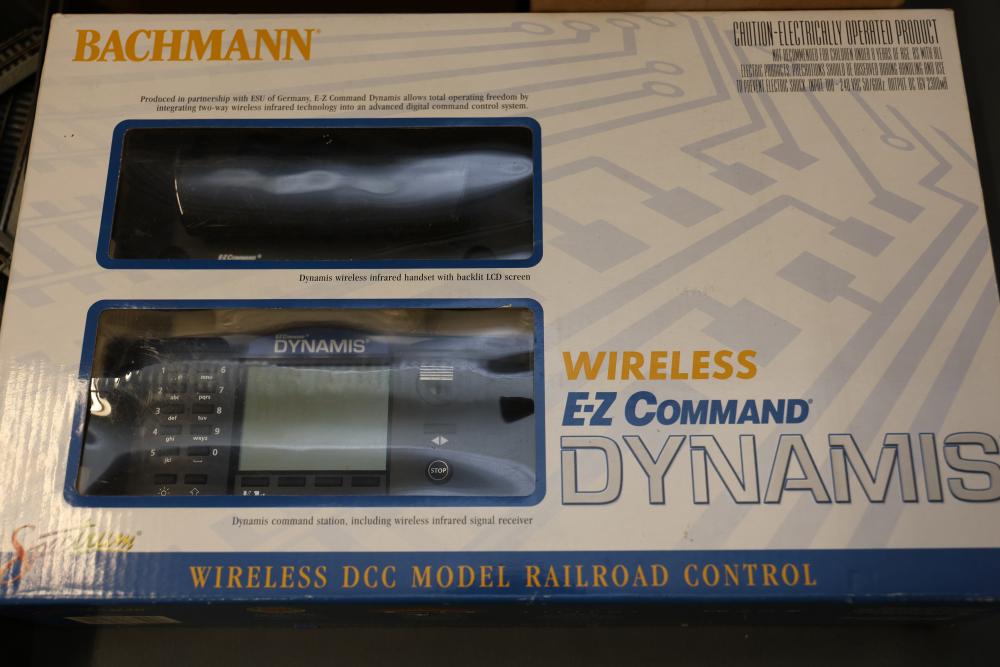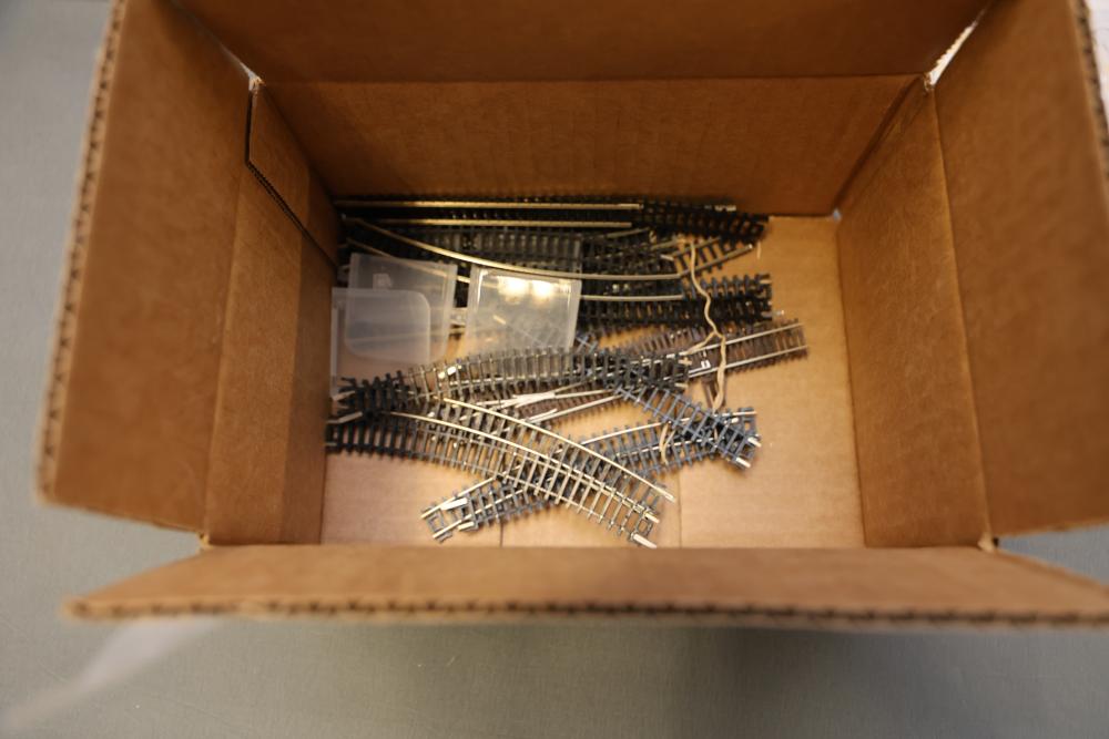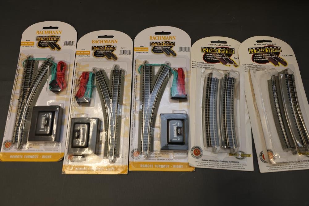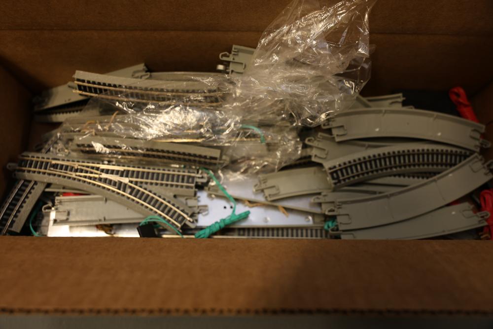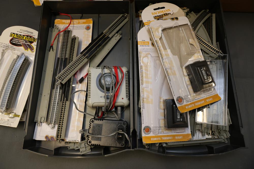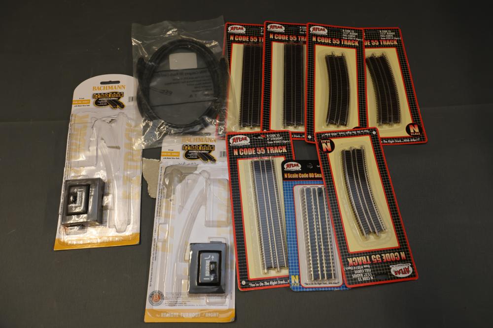 Model Railroad Tracks, Accessories, and Wireless DCC Control. Includes numerous pieces of HO and N scale track, assorted turnouts, switch mechanisms, and accessories from brands such as Bachmann. Also features a Bachmann Wireless EZ Command Dynamis DCC system with box and components. For model train enthusiasts and railroad setup expansion. Pickup only.