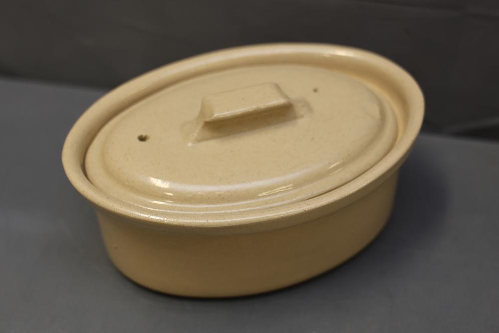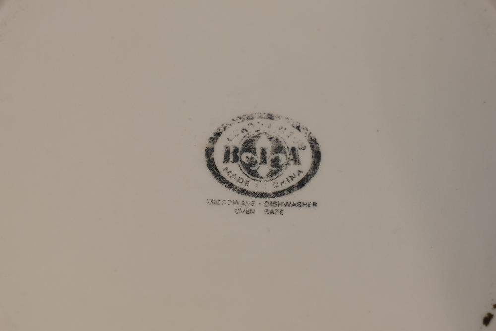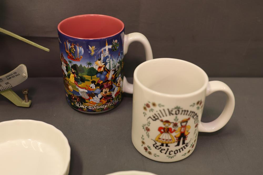 Ceramic bakeware dishes, decorative floral-pattern plates, a lidded 1-pint stoneware dish marked "Pearsons of Chesterfield," two mugs (one Disney-themed, one featuring "Willkommen" design), ornate metal serving utensils, and a vintage-style scale. Items display signs of use, and condition varies. Pickup only.