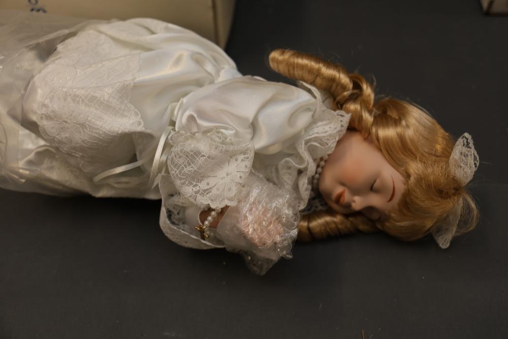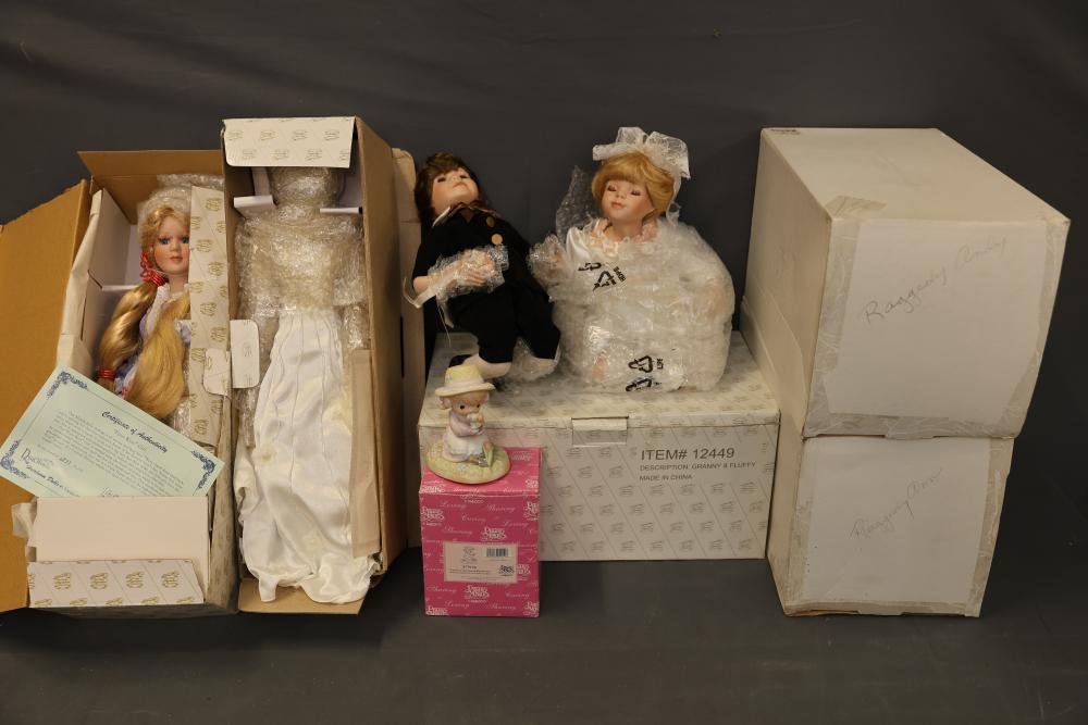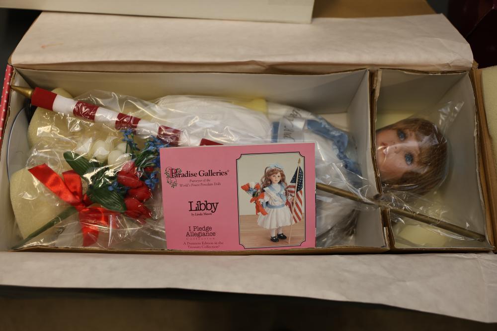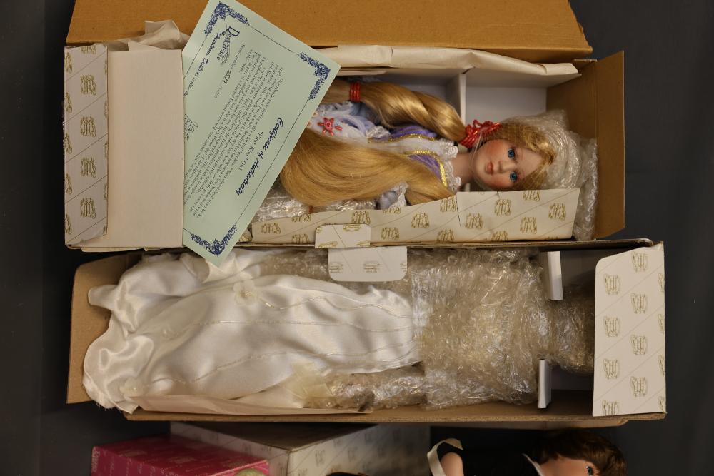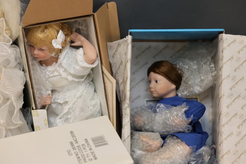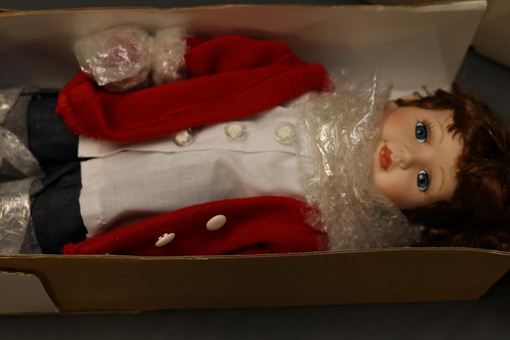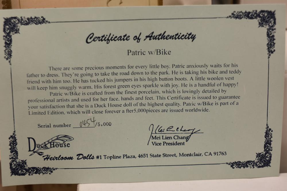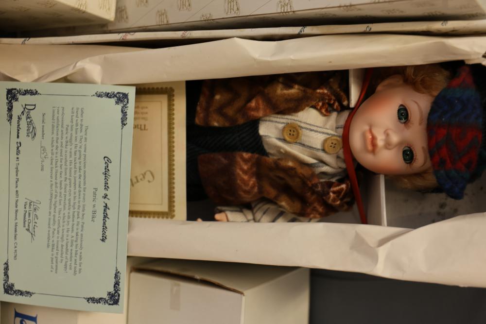 Porcelain Collectible Dolls in Original Boxes, featuring a variety of styles, sizes, and themes. Includes items like 'Patric w/Bike' by Duck House with a Certificate of Authenticity, 'Libby' by the Ashton-Drake Galleries, and other named dolls such as 'Rebeccah' by the Knowles China Company. Several include certificates of authenticity and come packaged in their original boxes with protective wrapping. Ideal for collectors or display. Pickup only.
