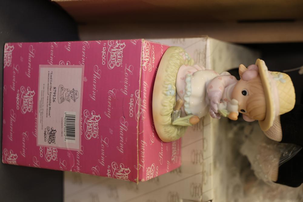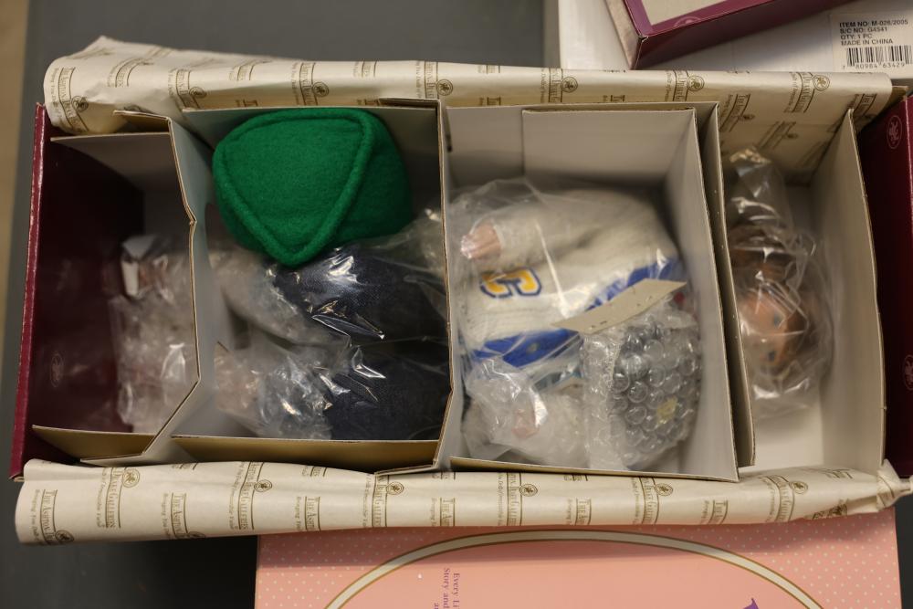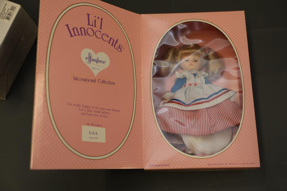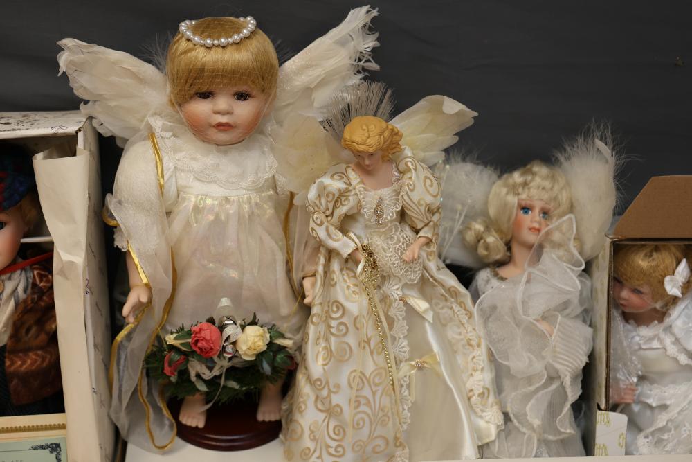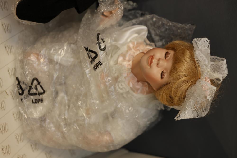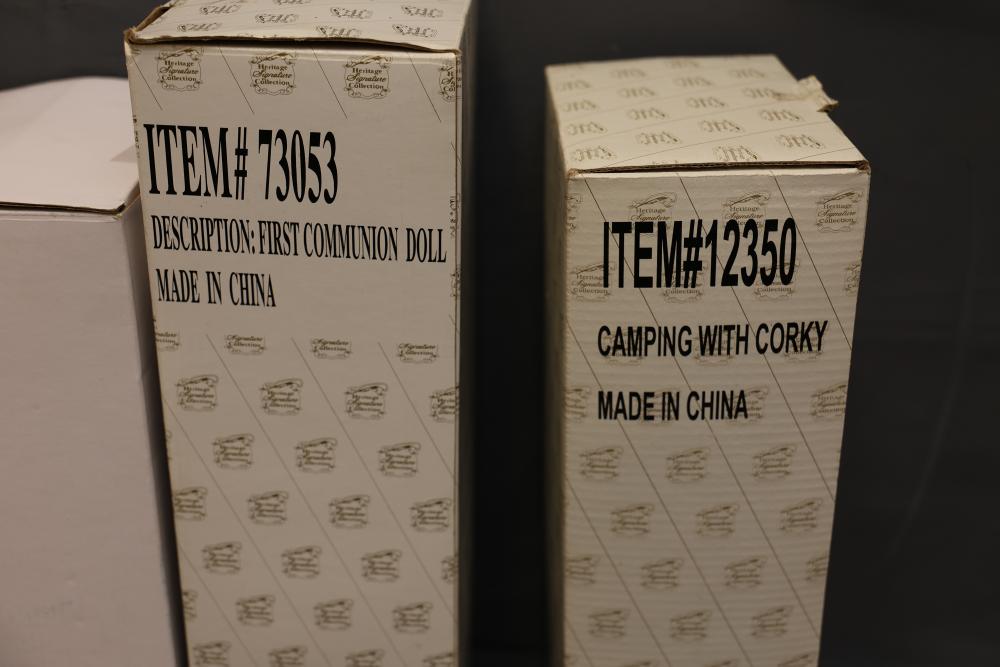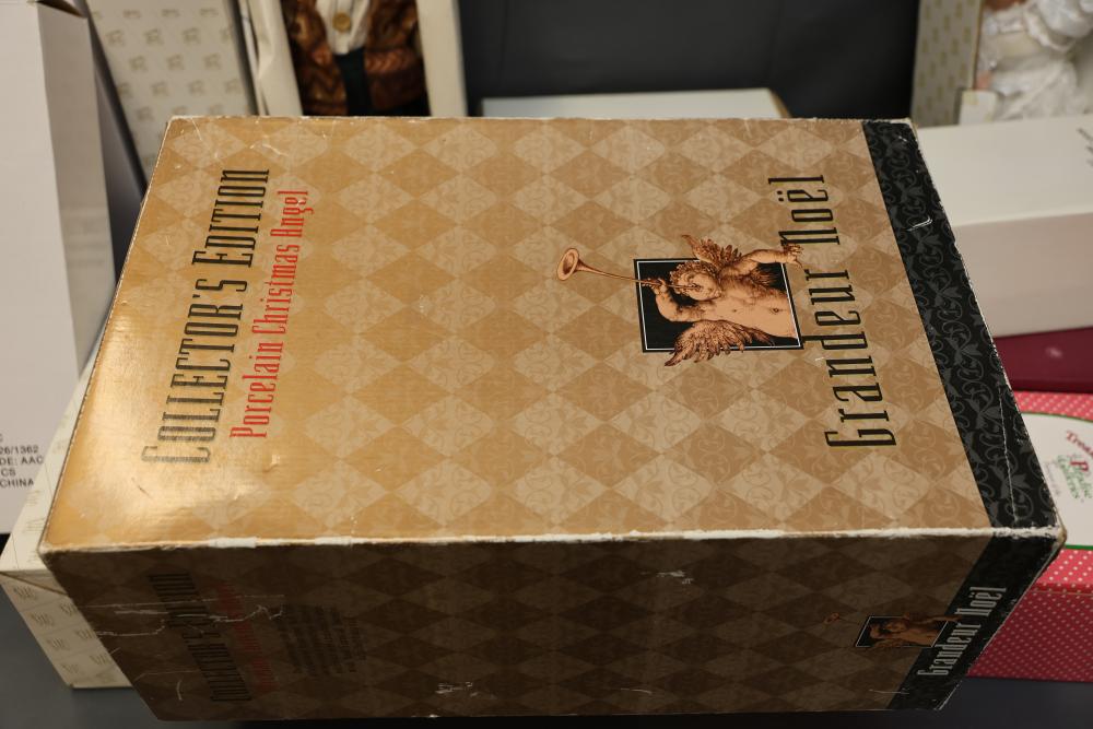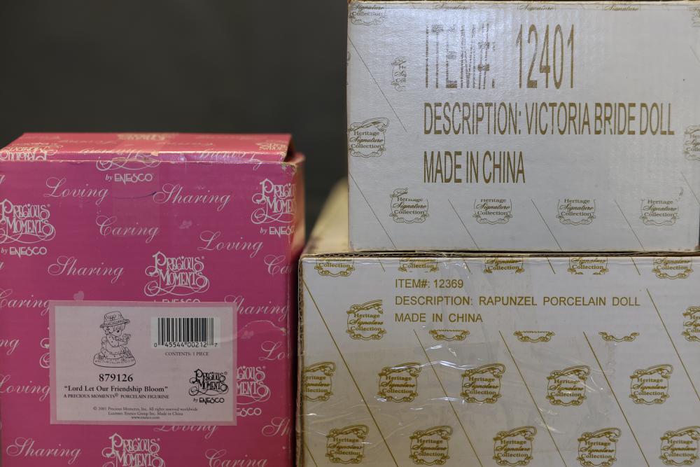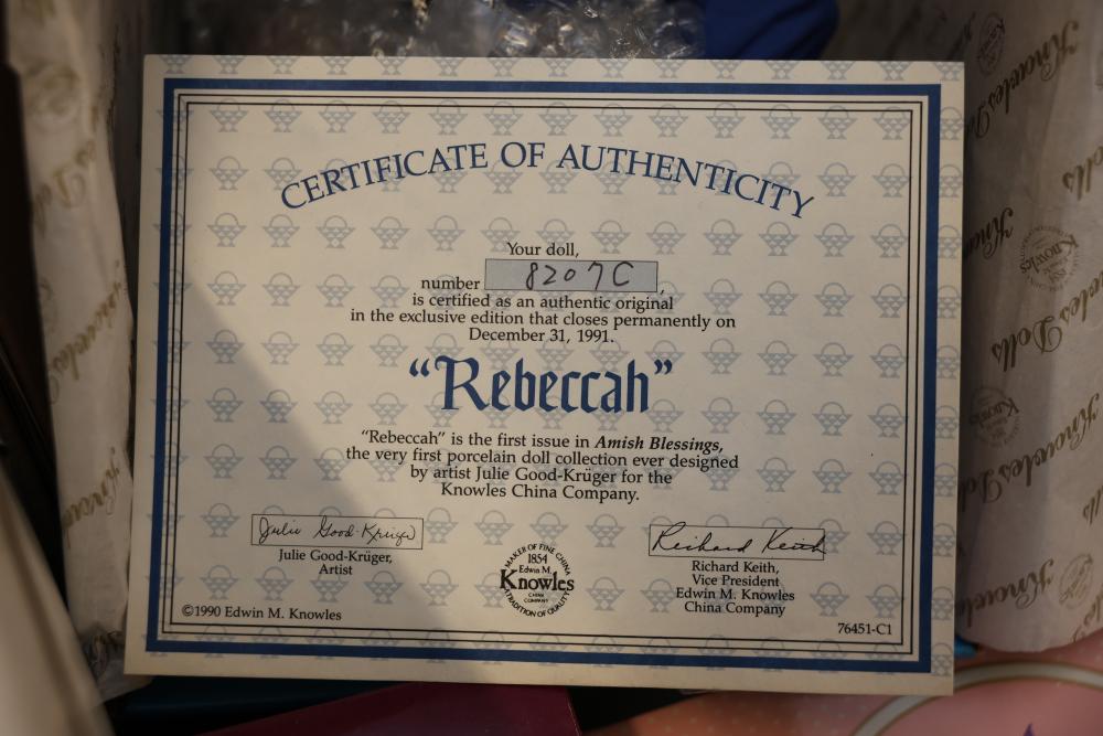 Porcelain Collectible Dolls in Original Boxes, featuring a variety of styles, sizes, and themes. Includes items like 'Patric w/Bike' by Duck House with a Certificate of Authenticity, 'Libby' by the Ashton-Drake Galleries, and other named dolls such as 'Rebeccah' by the Knowles China Company. Several include certificates of authenticity and come packaged in their original boxes with protective wrapping. Ideal for collectors or display. Pickup only.